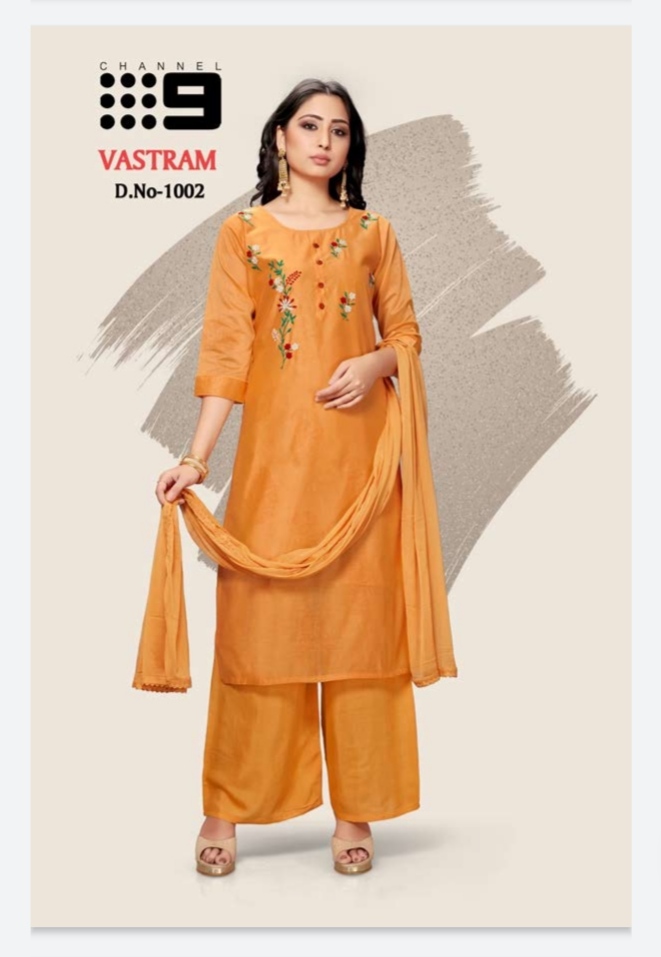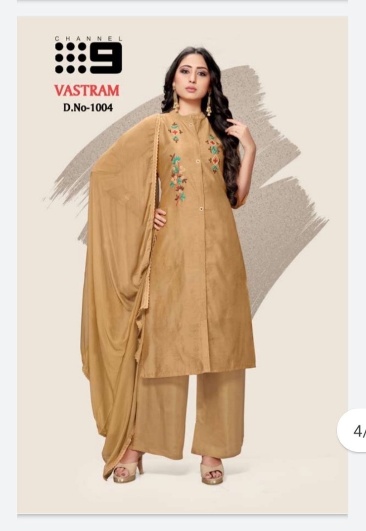VASTRAM💃 Fabrics Chanderi Silk modal top with exclusive sofia duptta with bottam Sleeves type : 3/4th No.of designs : 3 Sizes : L40, XL42, XXL44 Rate : 845+ GST Please send your orders. and feel free to talk.... Made in India |