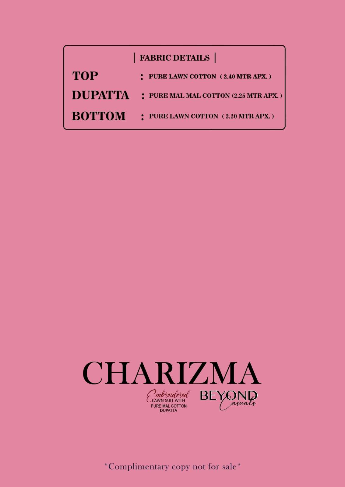 charizma designer beyond casuals unstitched embroidery lawn cotton suit with mul mul dupatta