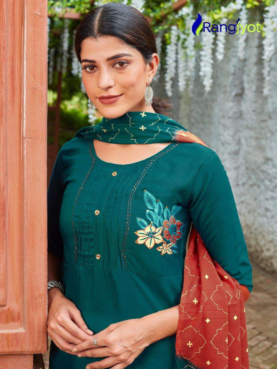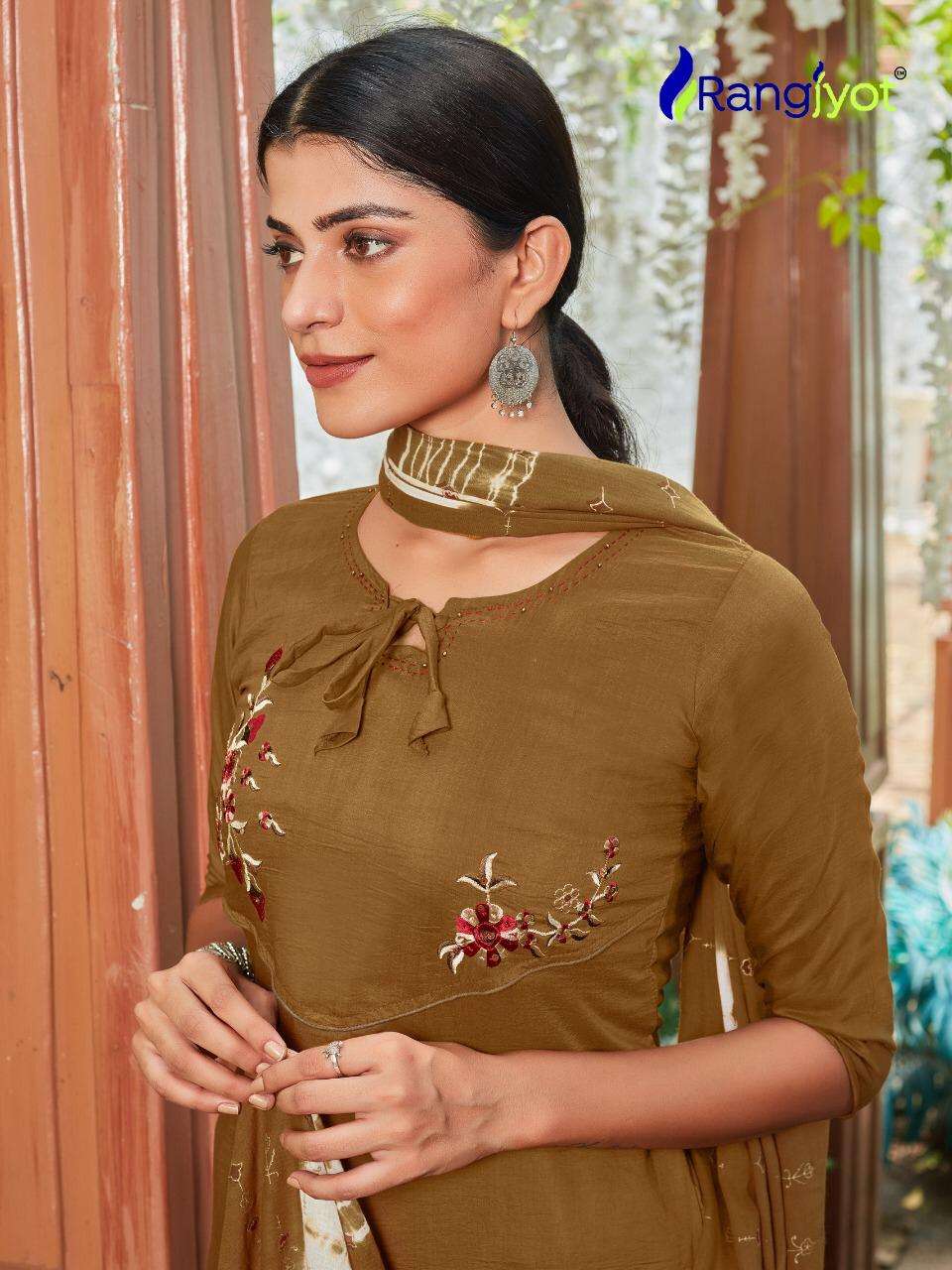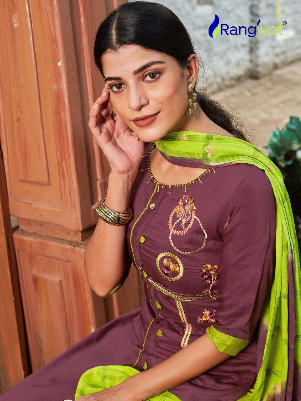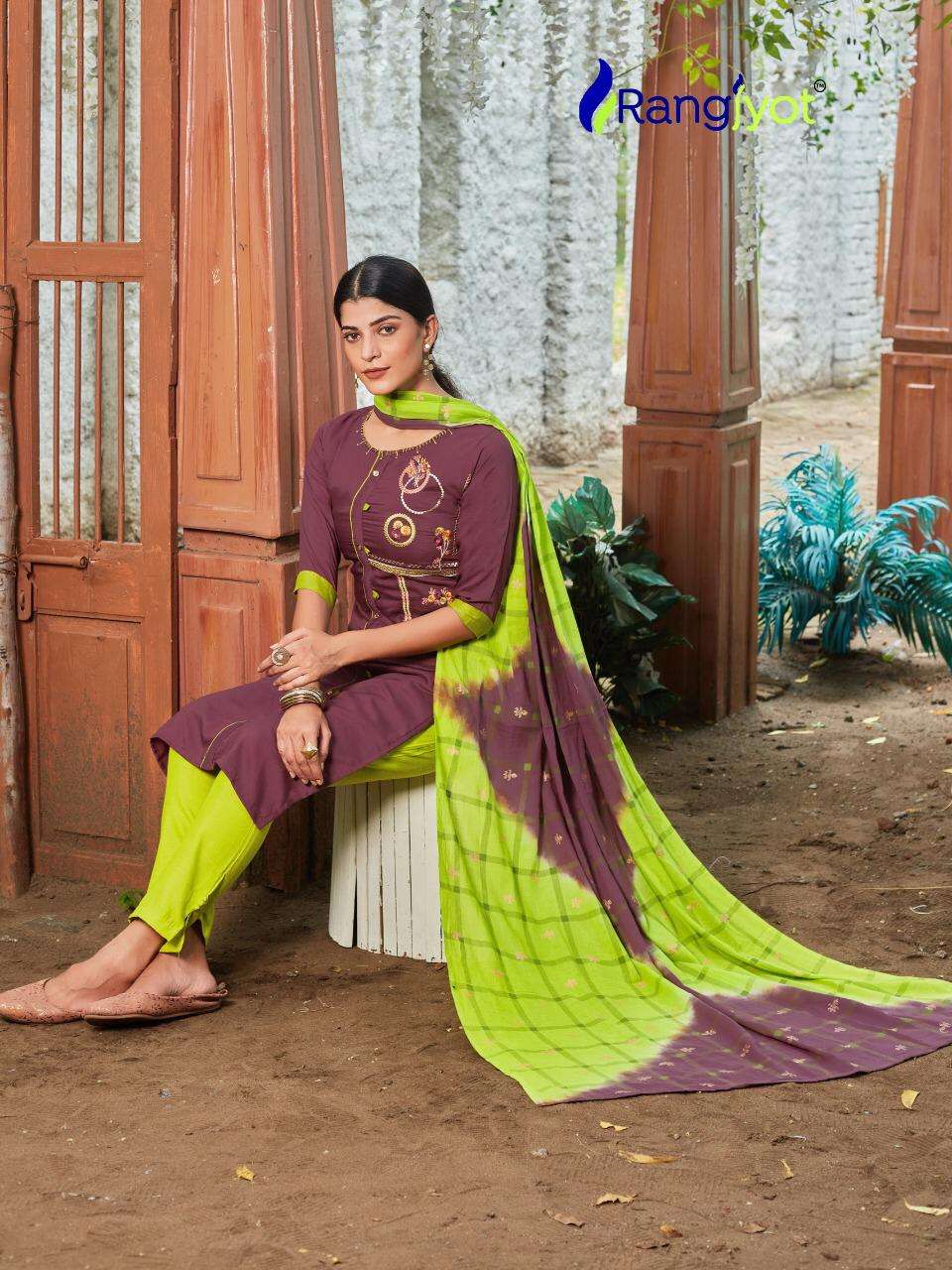 Rangjyot⢠".  Chitra Vol-1     Details Top :- Maska (Soft) Silk With Crep Inner Bottom :-  Soft Cotton Dupatta :- Pure Cotton Mal    Prise    :-  655/- + Gst Set to set Delivery 2 days    Size    :-  M to 3xl   Designs  :- 8 pcs |