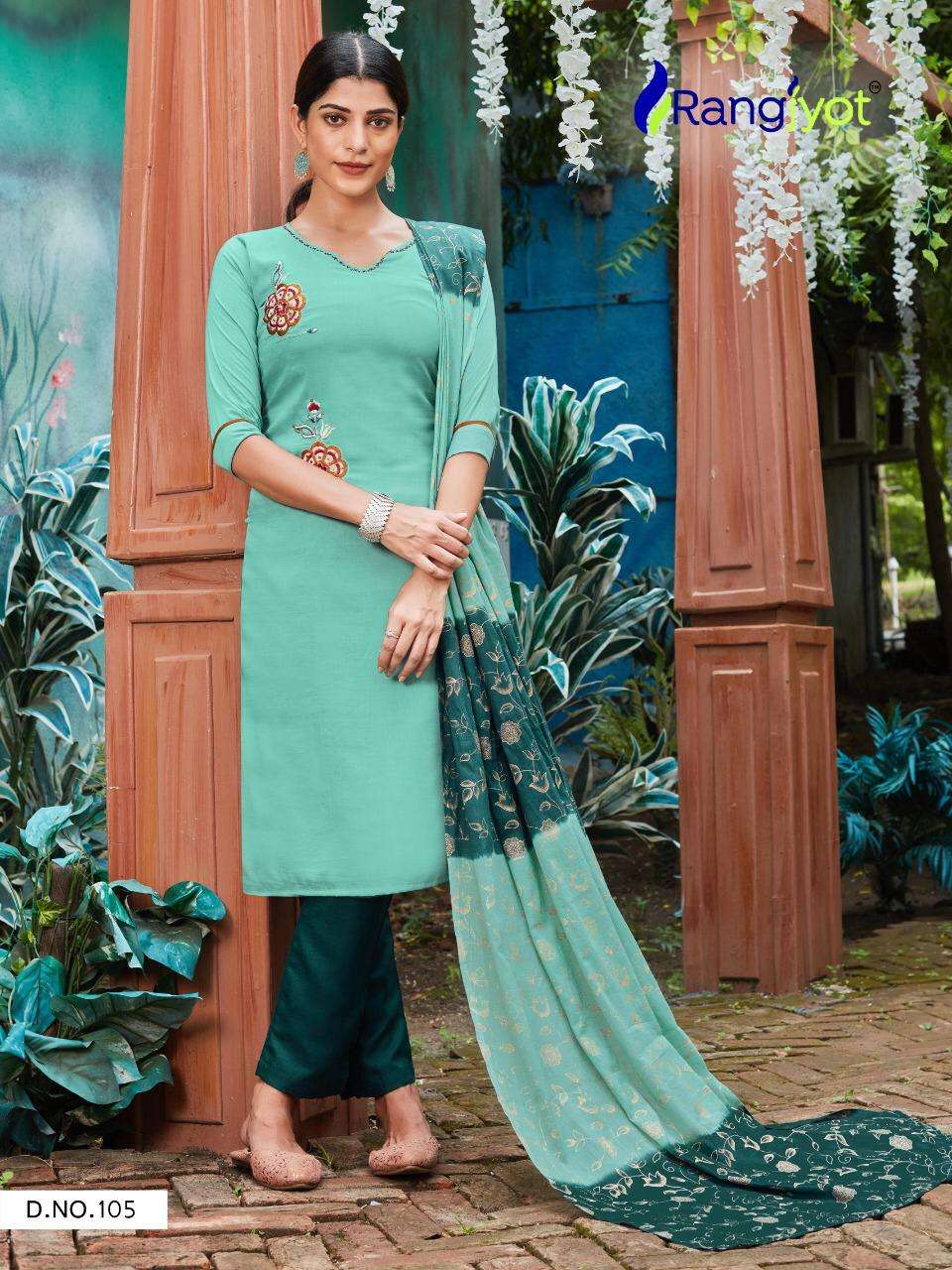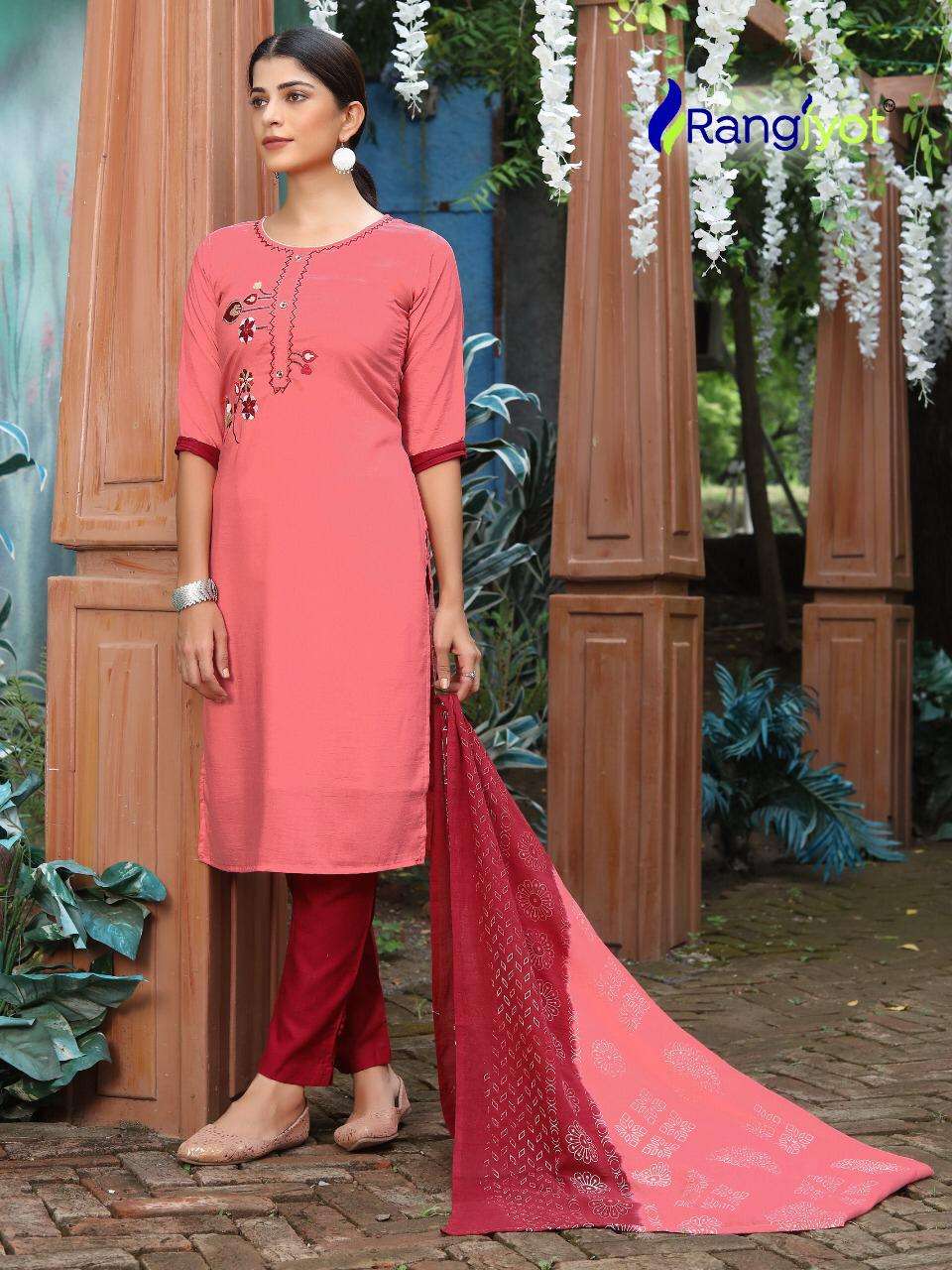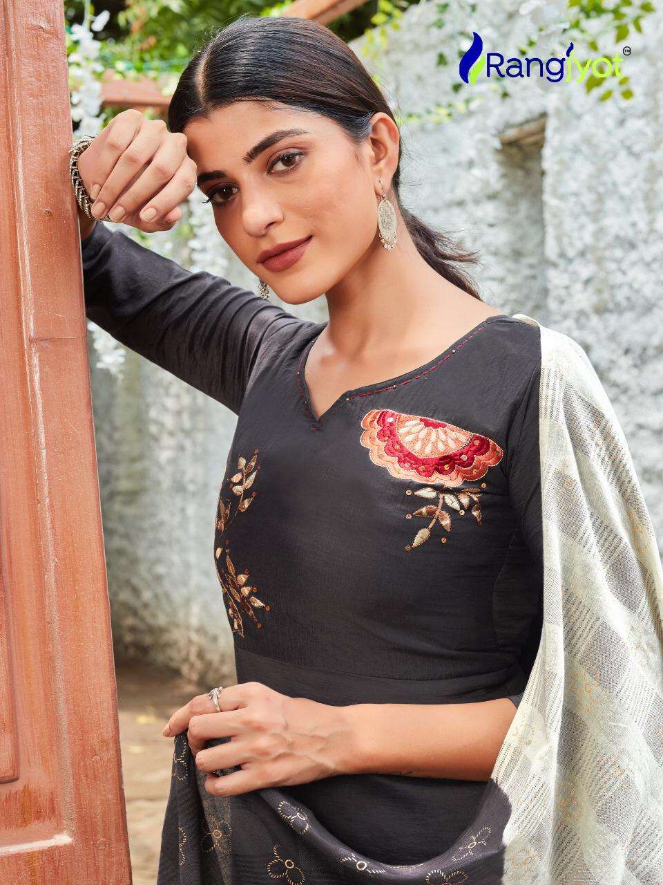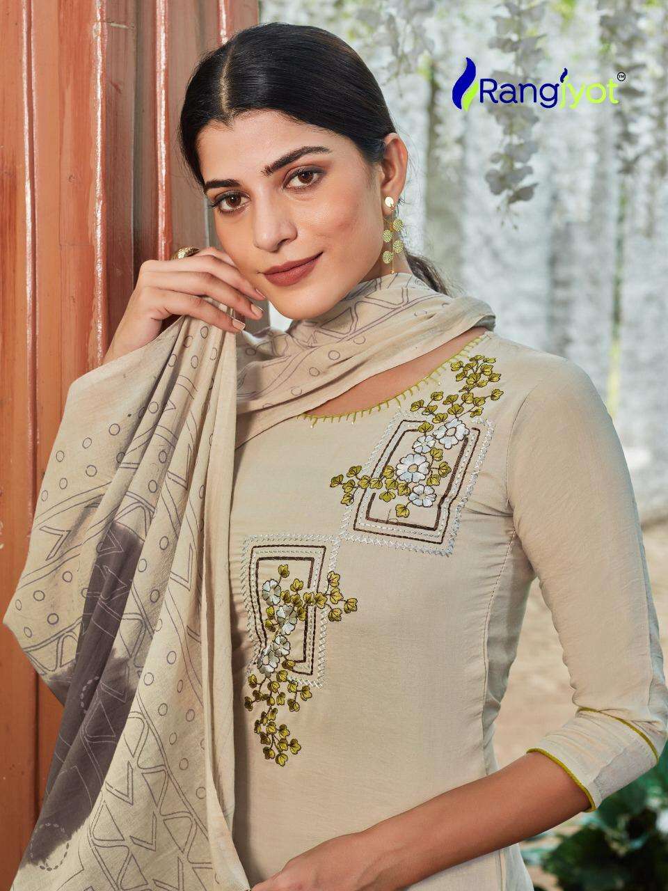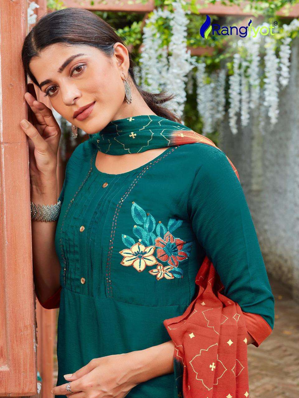 Rangjyot⢠".  Chitra Vol-1     Details Top :- Maska (Soft) Silk With Crep Inner Bottom :-  Soft Cotton Dupatta :- Pure Cotton Mal    Prise    :-  655/- + Gst Set to set Delivery 2 days    Size    :-  M to 3xl   Designs  :- 8 pcs |