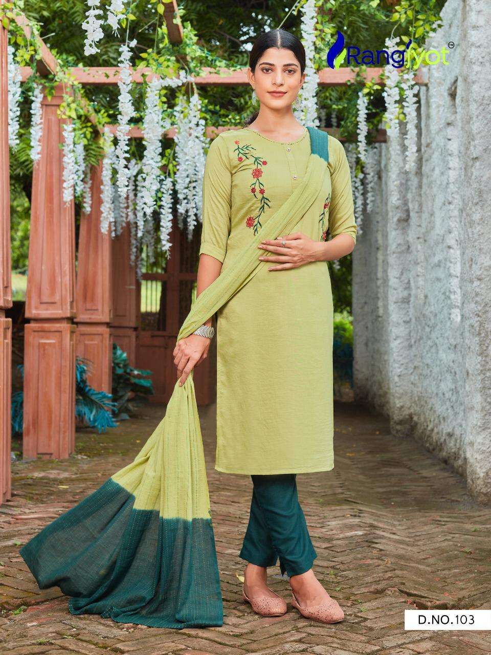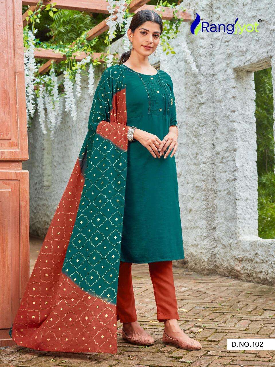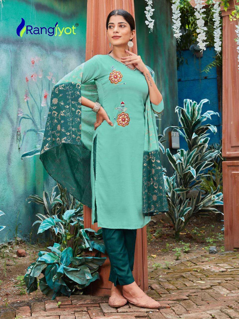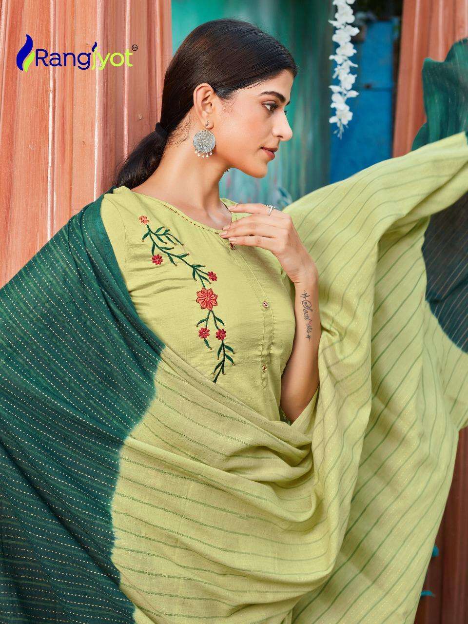 Rangjyot⢠".  Chitra Vol-1     Details Top :- Maska (Soft) Silk With Crep Inner Bottom :-  Soft Cotton Dupatta :- Pure Cotton Mal    Prise    :-  655/- + Gst Set to set Delivery 2 days    Size    :-  M to 3xl   Designs  :- 8 pcs |