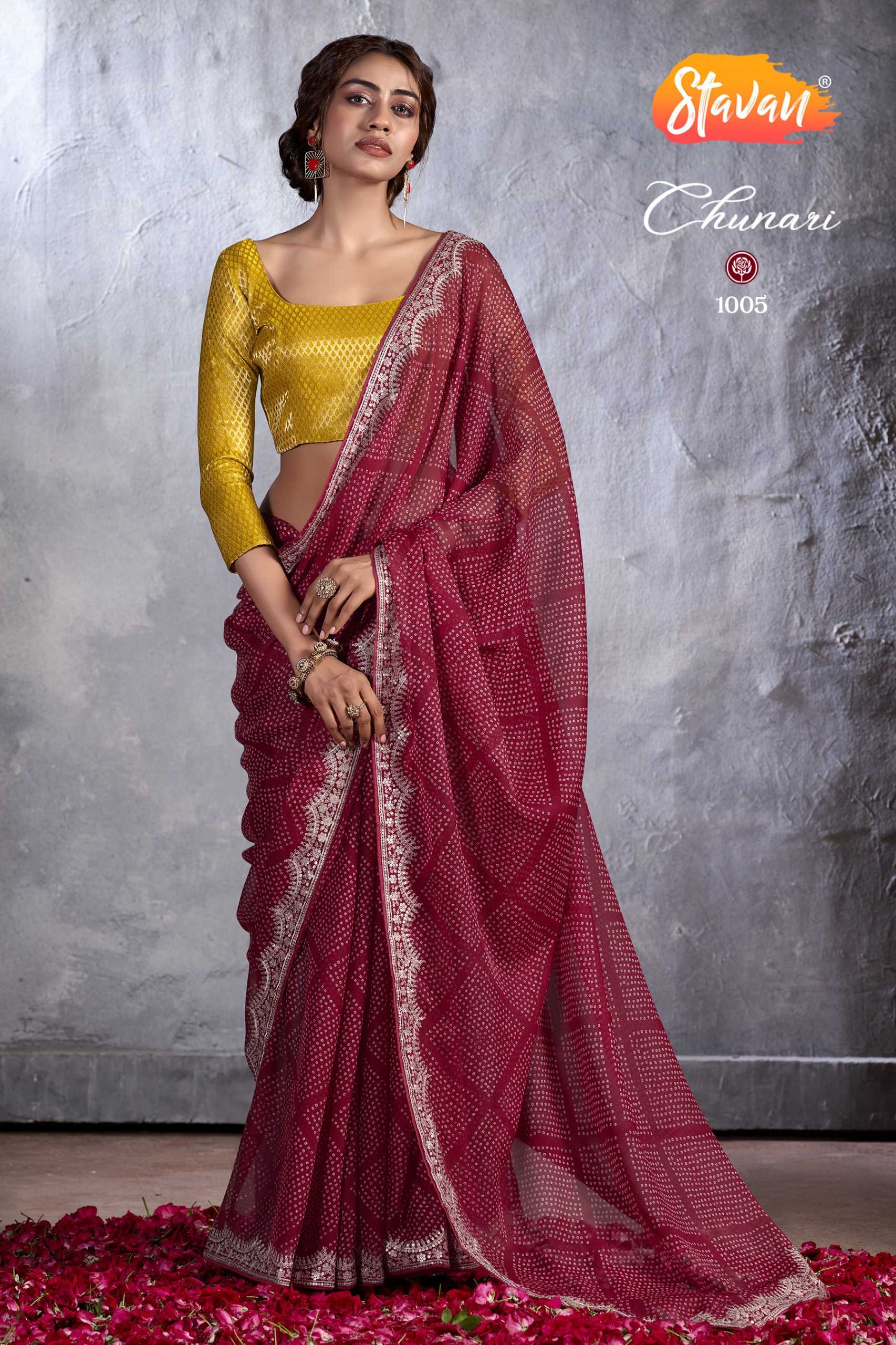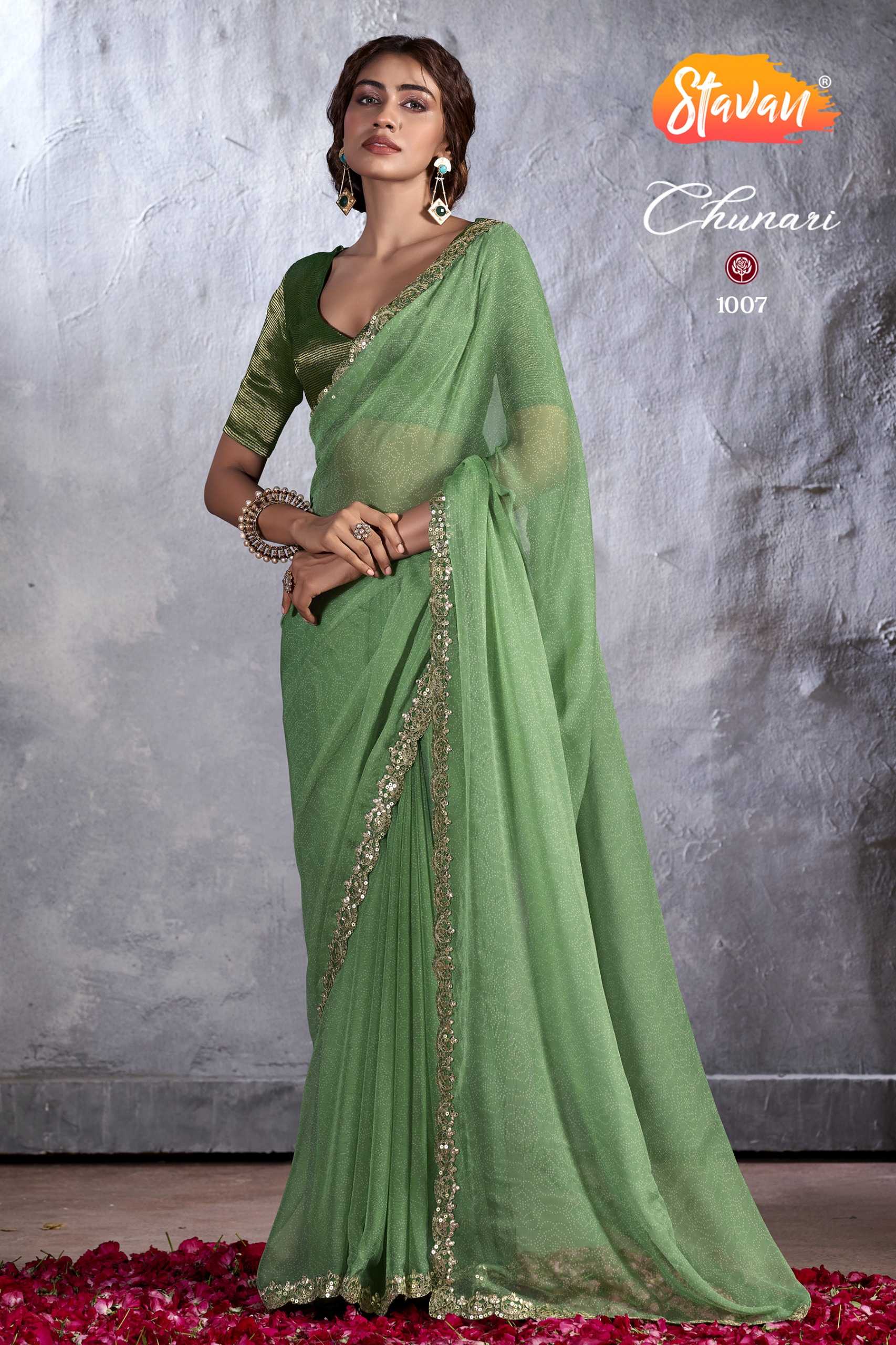 Most Awaited Concept with an amazing catalogue 🔥 Brand - Stavan ➡️Catalog - Chunari ➡️Fabric - Pure Chiffon With Cutwork Embroidery Work C Pallu Border With Jacquard blouse ➡️Rate - 875+5% 18 pc set #We always Trust in Quality 😍 |