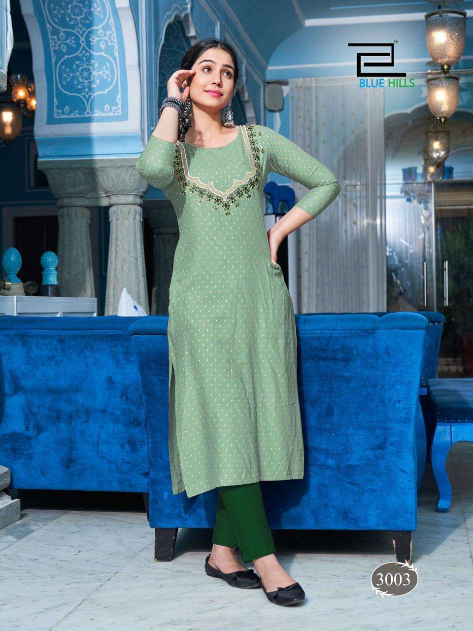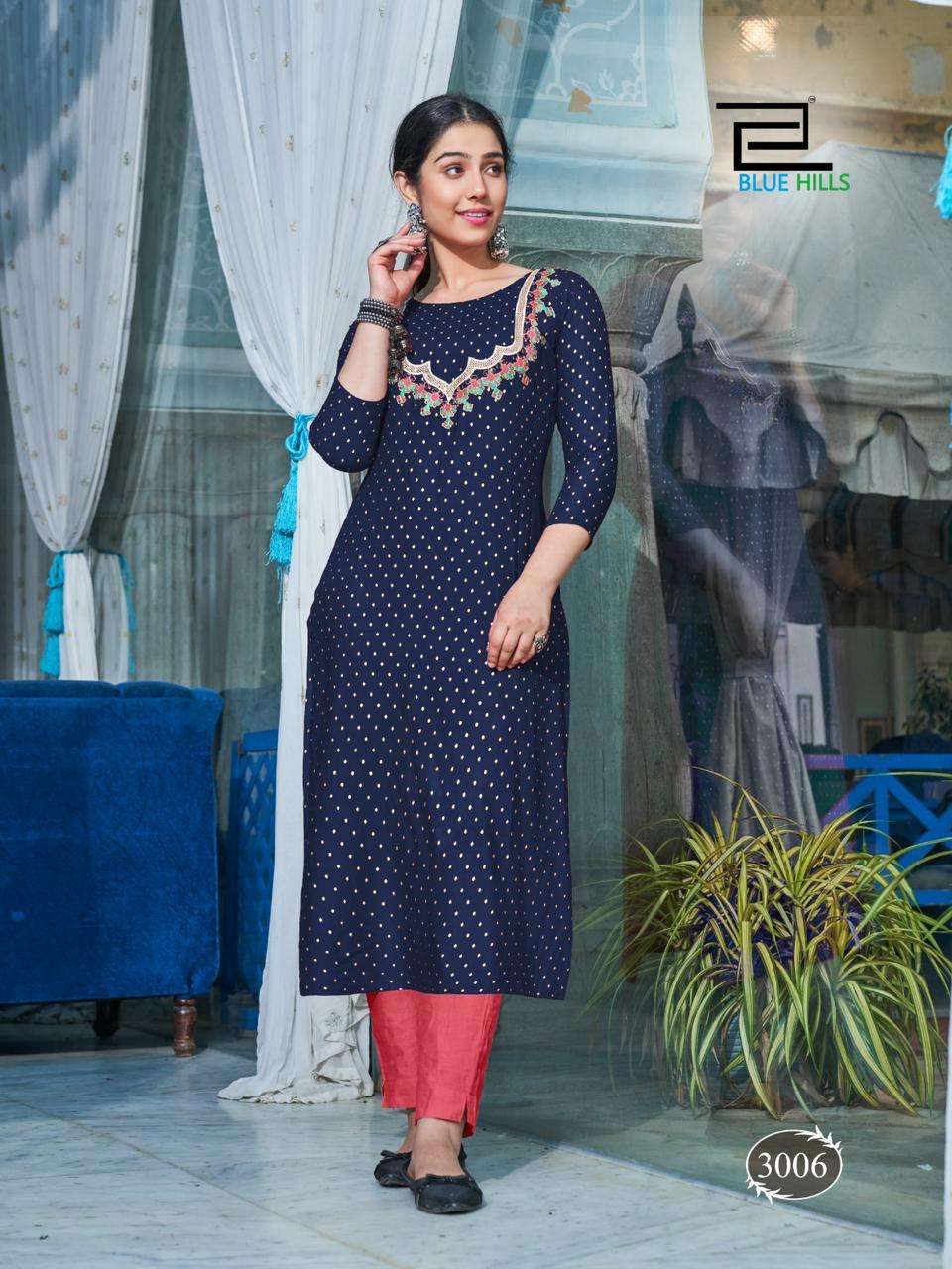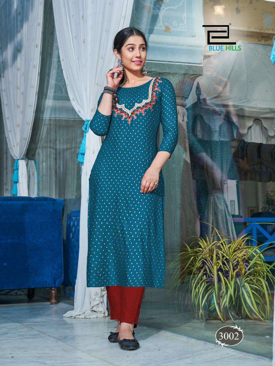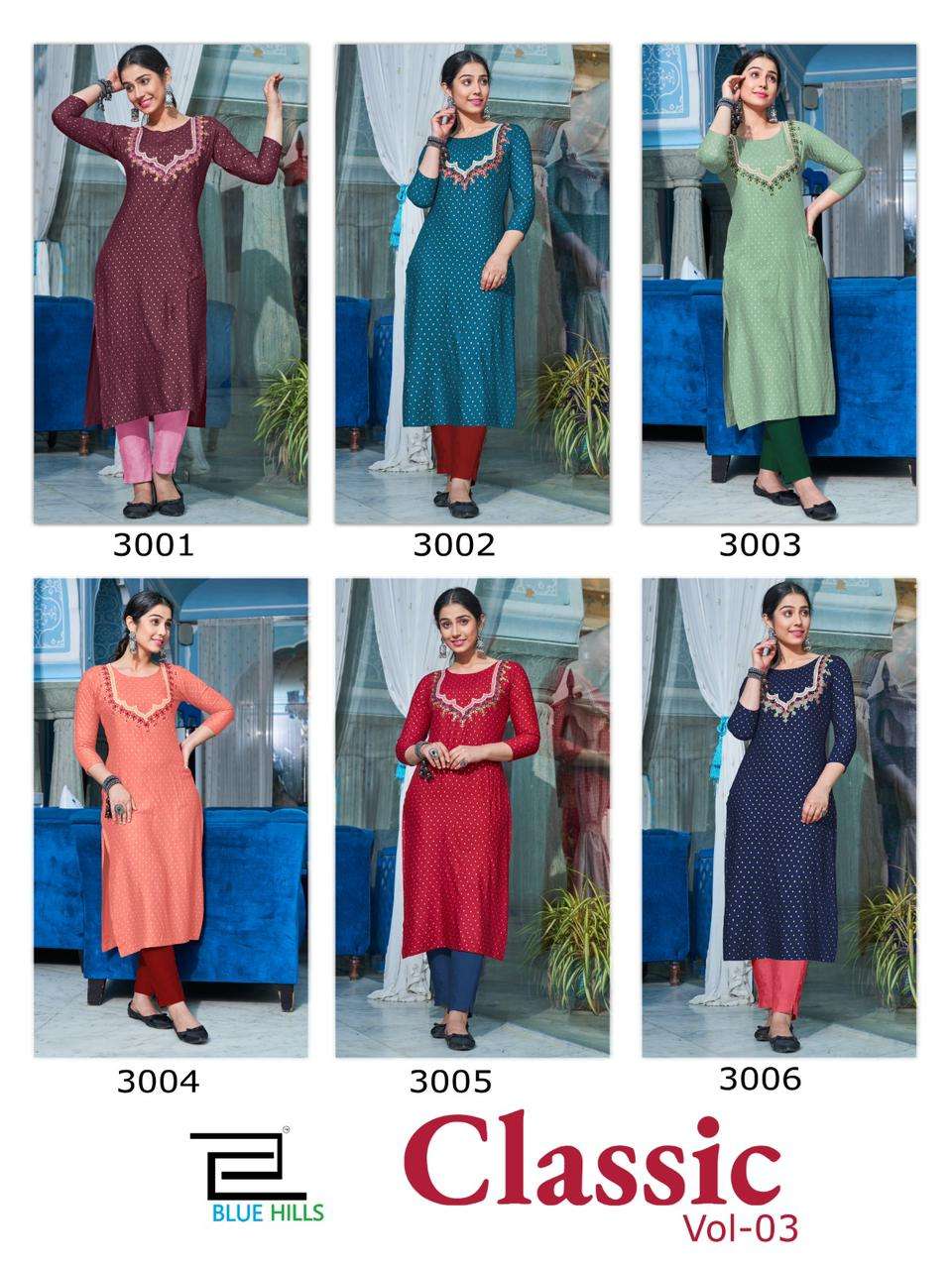 classic vol 3 by blue hills designer foil print with work stitch kurtis collection