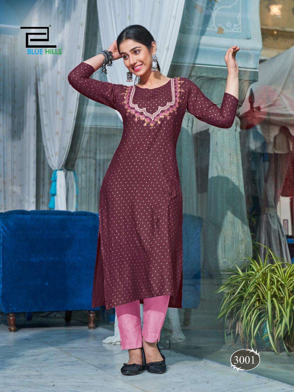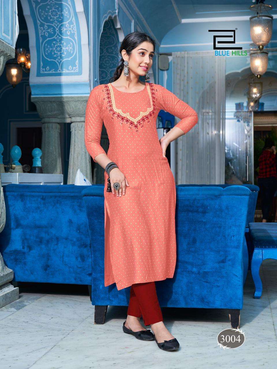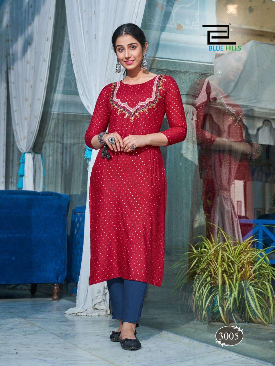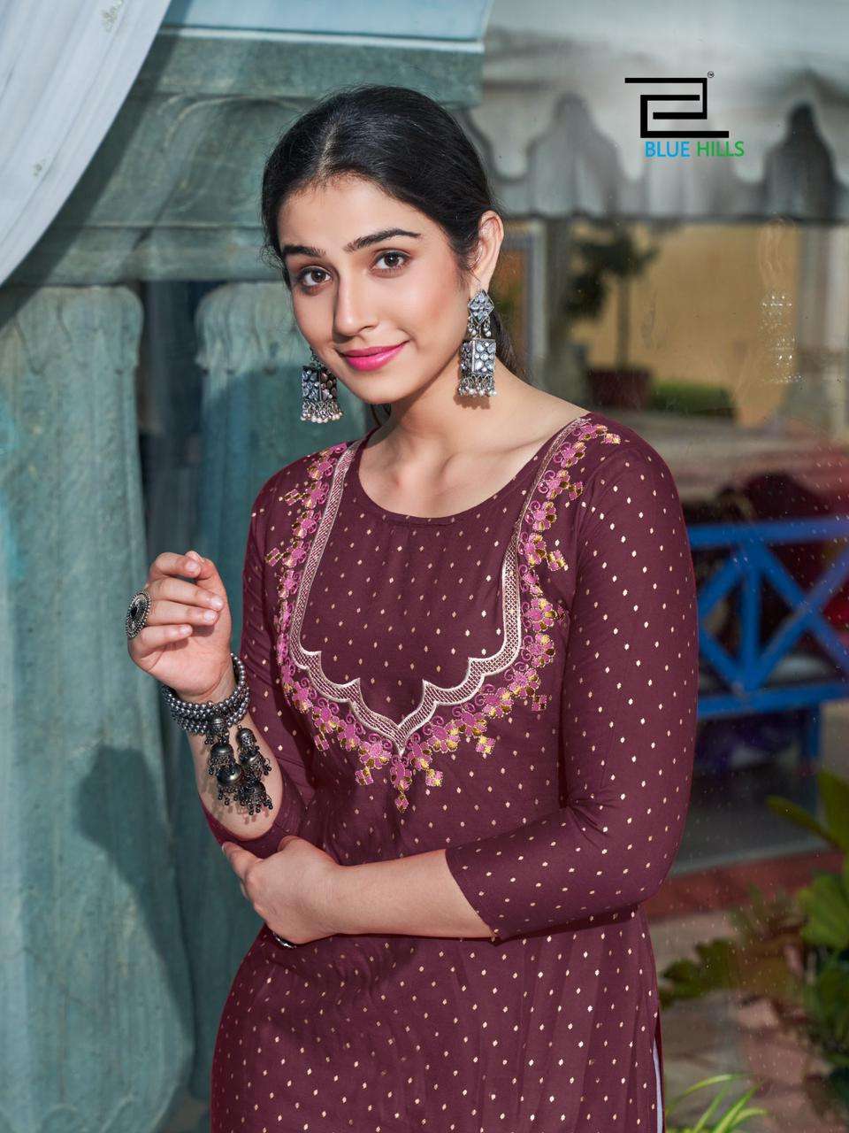 classic vol 3 by blue hills designer foil print with work stitch kurtis collection