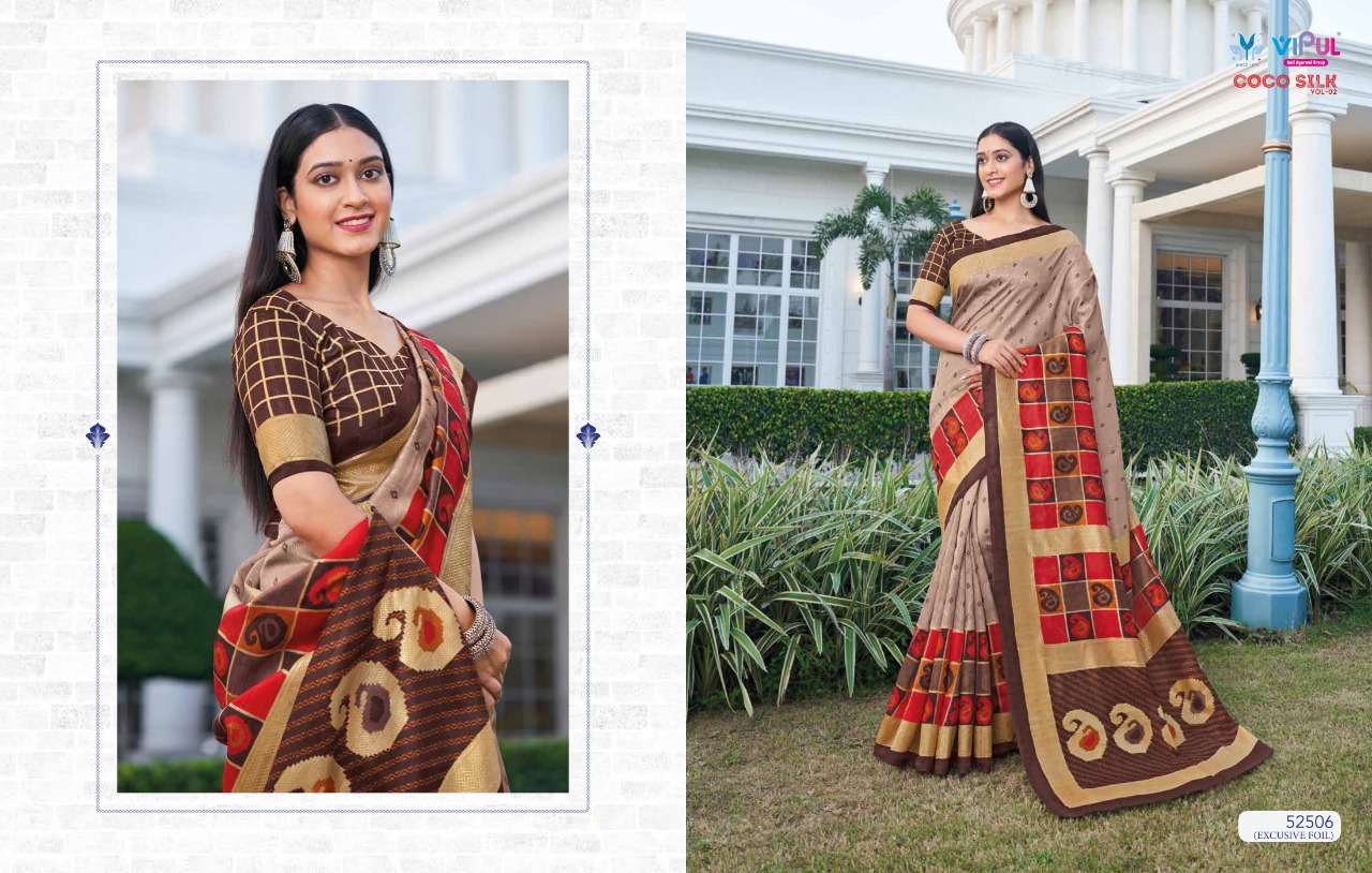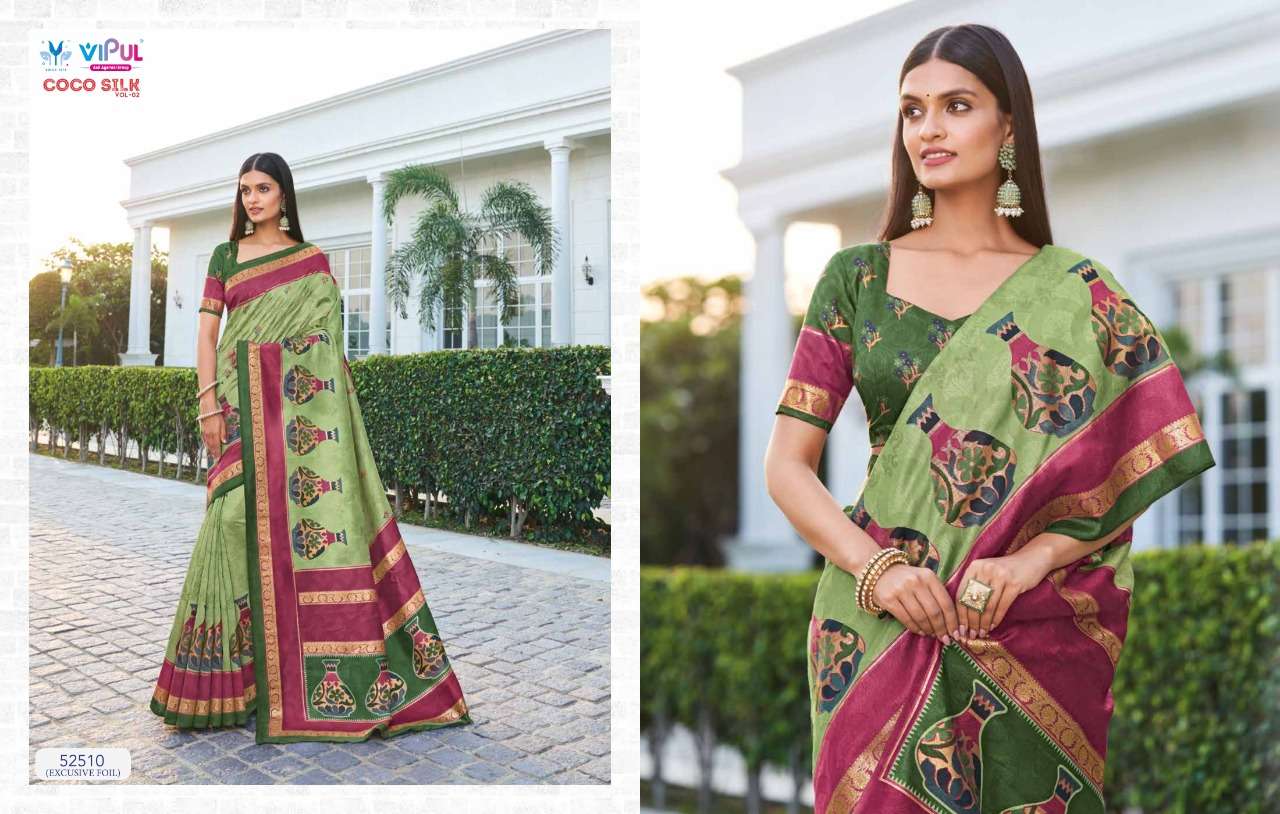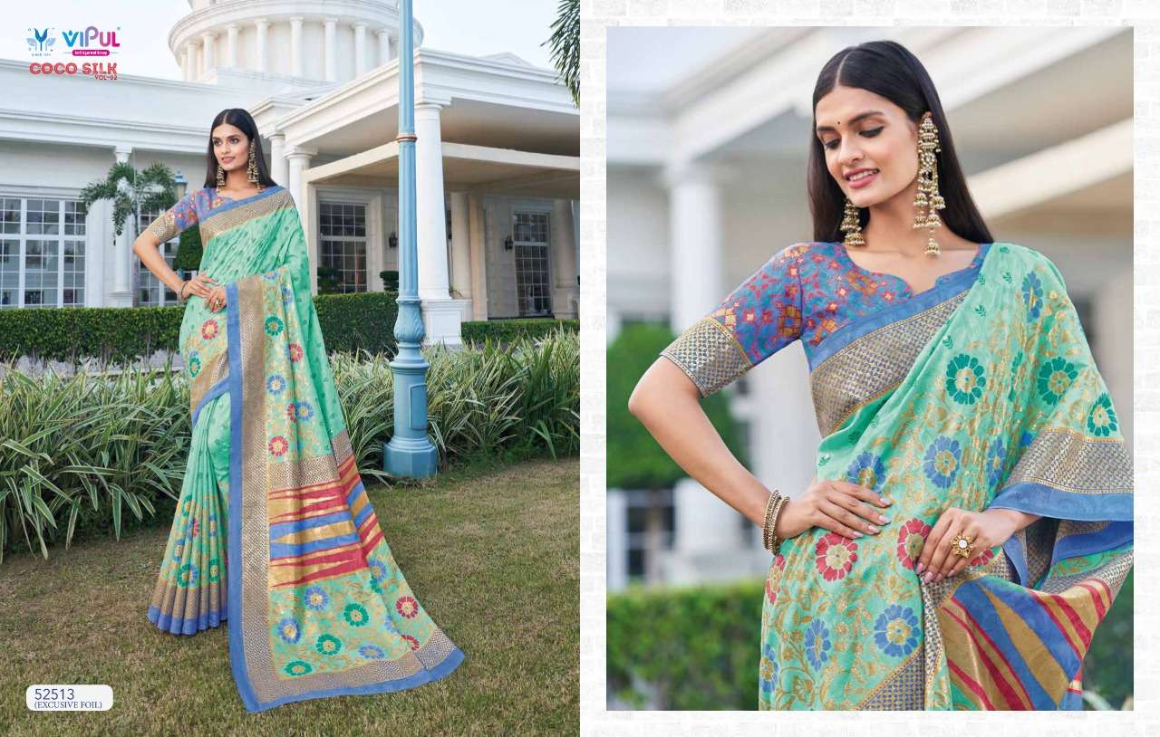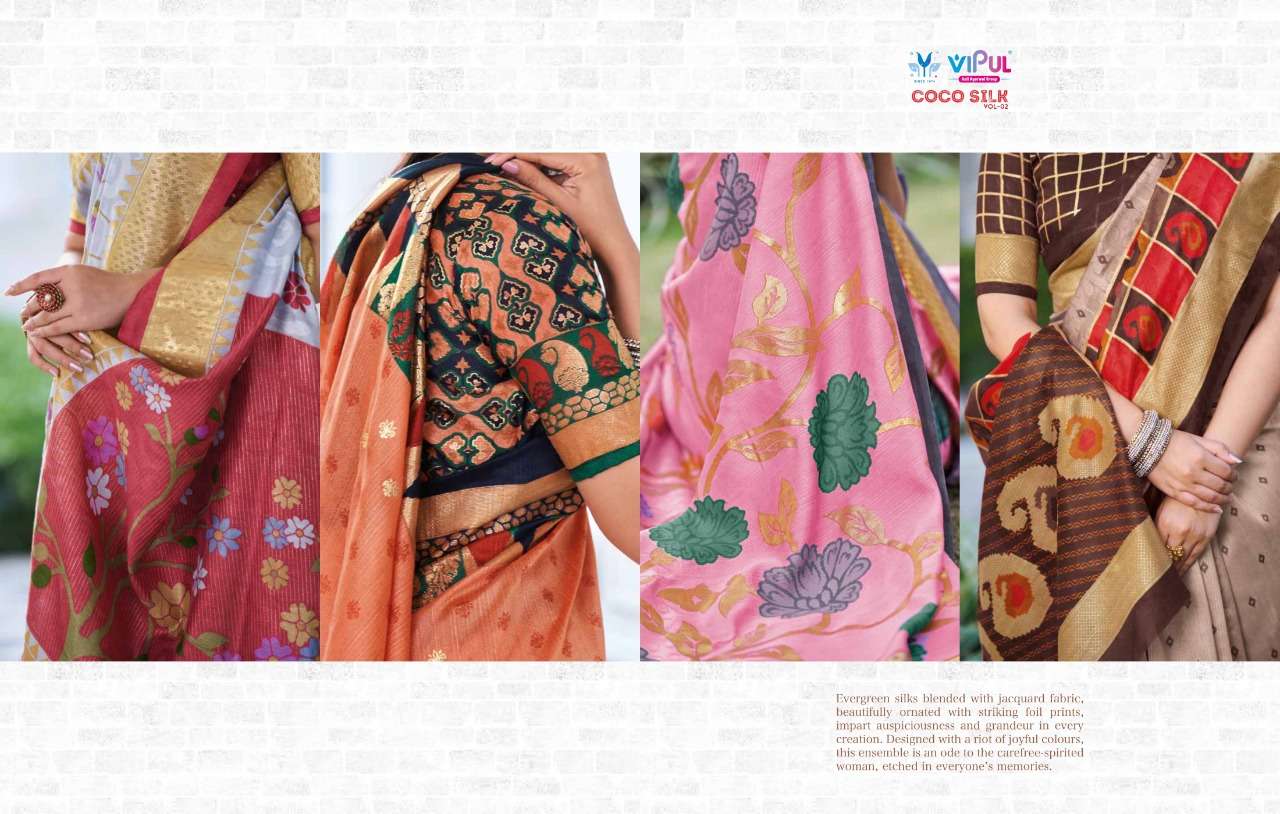VIPUL COCO SILK VOL 2 The stylish Range in a gist,an exbaustive range of collection that bright back sobriety in style...! FABRIC- Jacquard Silk With Foil RATE-832/- |