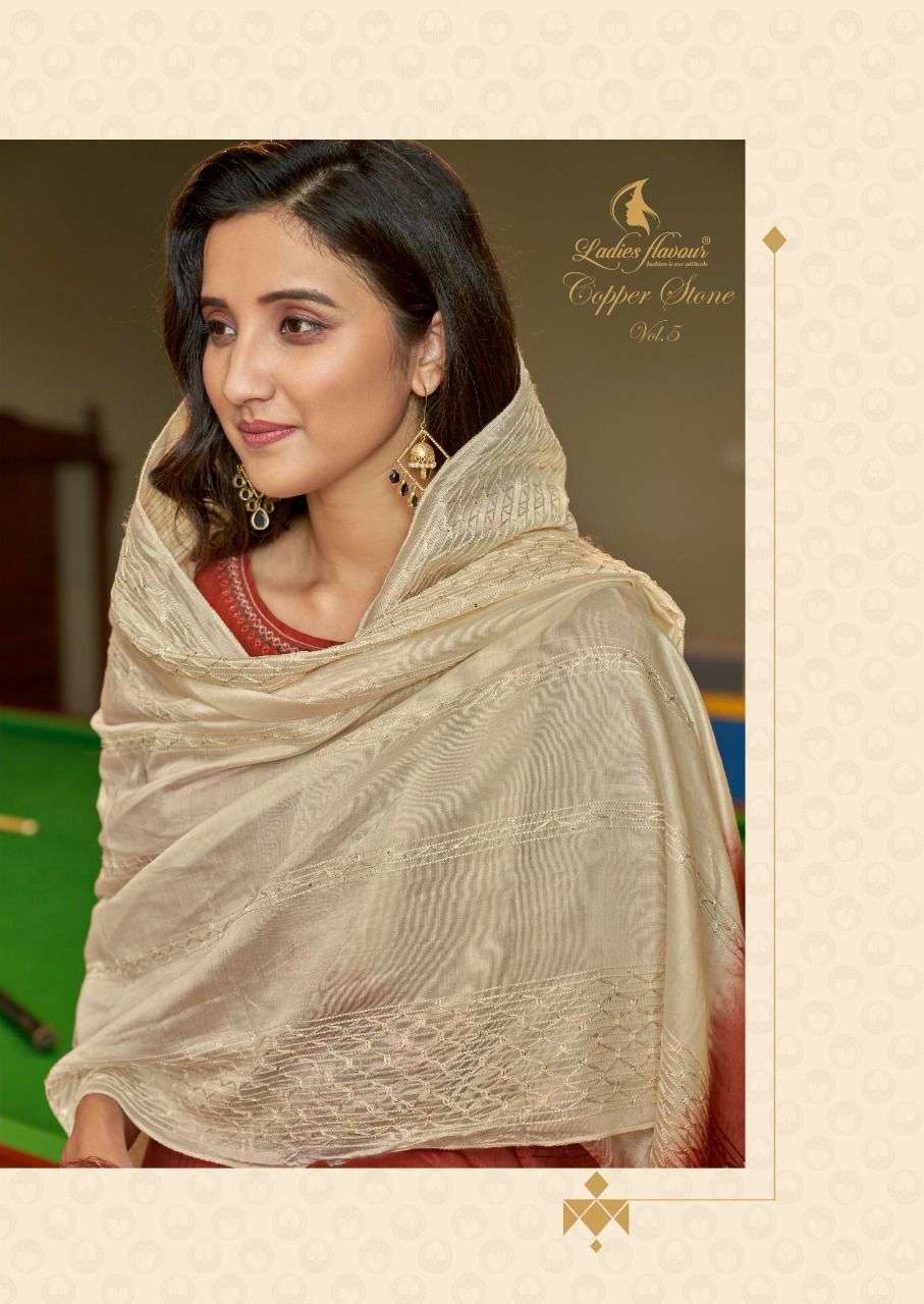 Ladies Flavour Brand Name : Ladies Flavour Catalog : Copper Stone Vol 5 Design : 6 Fabric :- Top :- Pure Naylon Viscose With Embroidery With Heavy Khatli work Bottom :- Cotton Slub Lycra With Embtoidery Work Dupptta :- Pure Naylon Viscose With Weaving Sequance Size : M(38), L(40), XL(42), 2XL(44), 3XL(46)  Rate :- 1195/- Set to set Disptach :- Within 1 days |