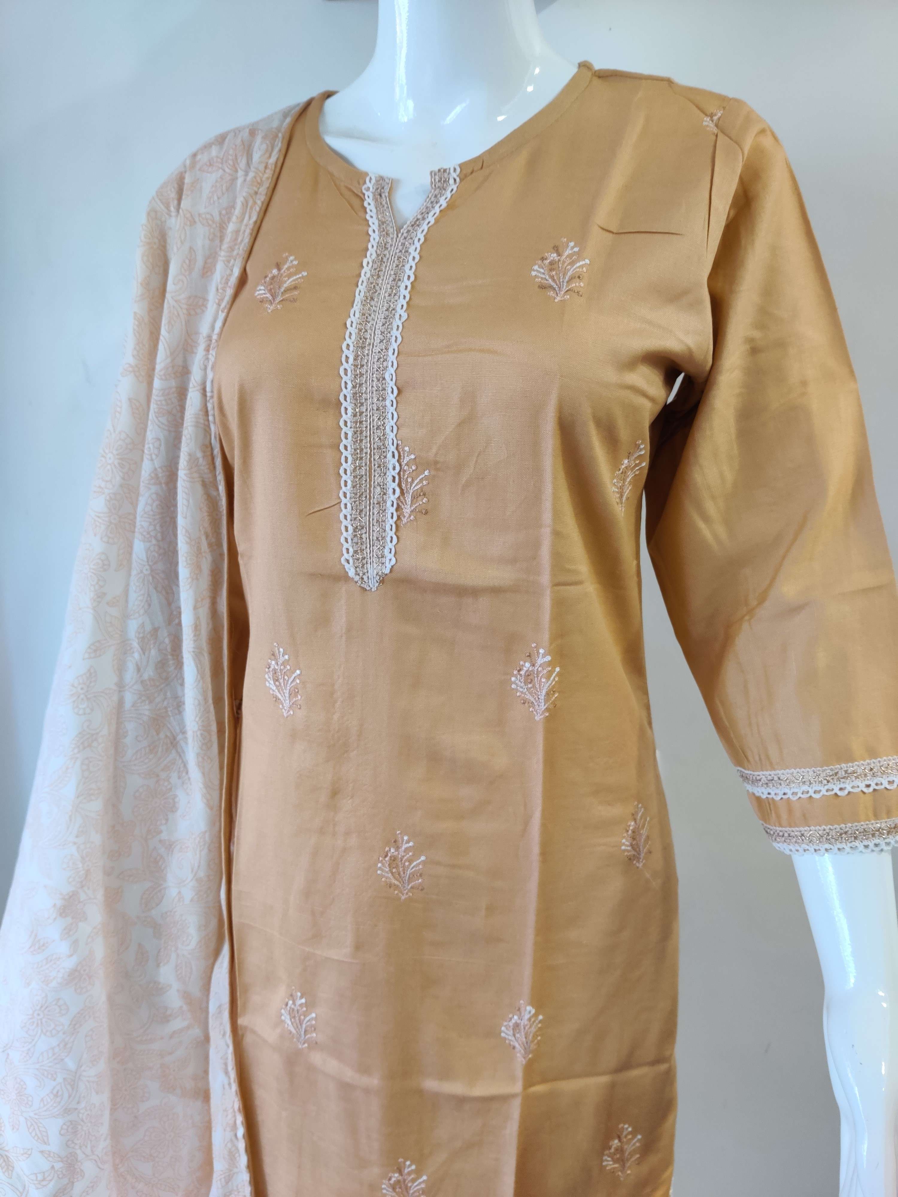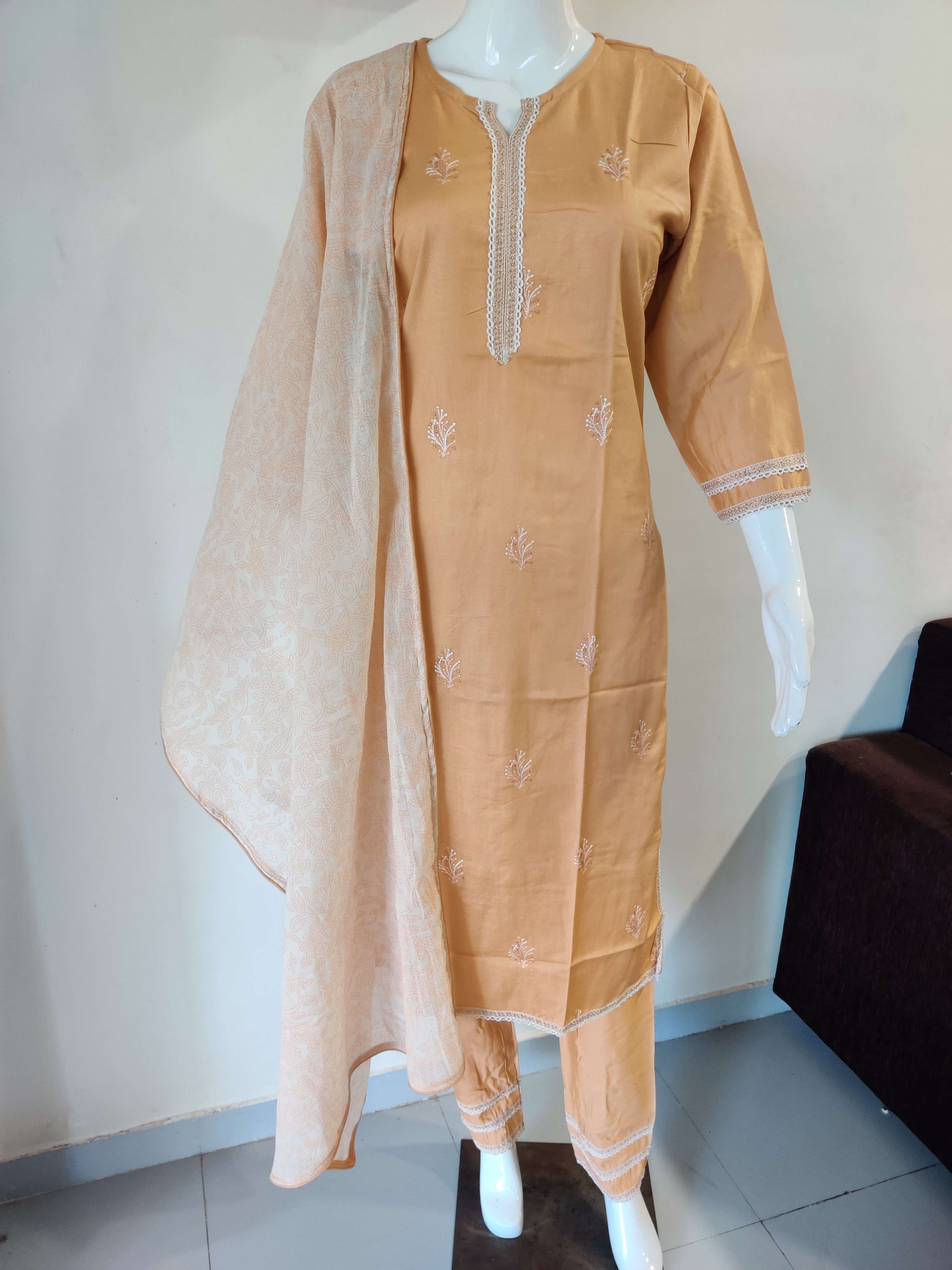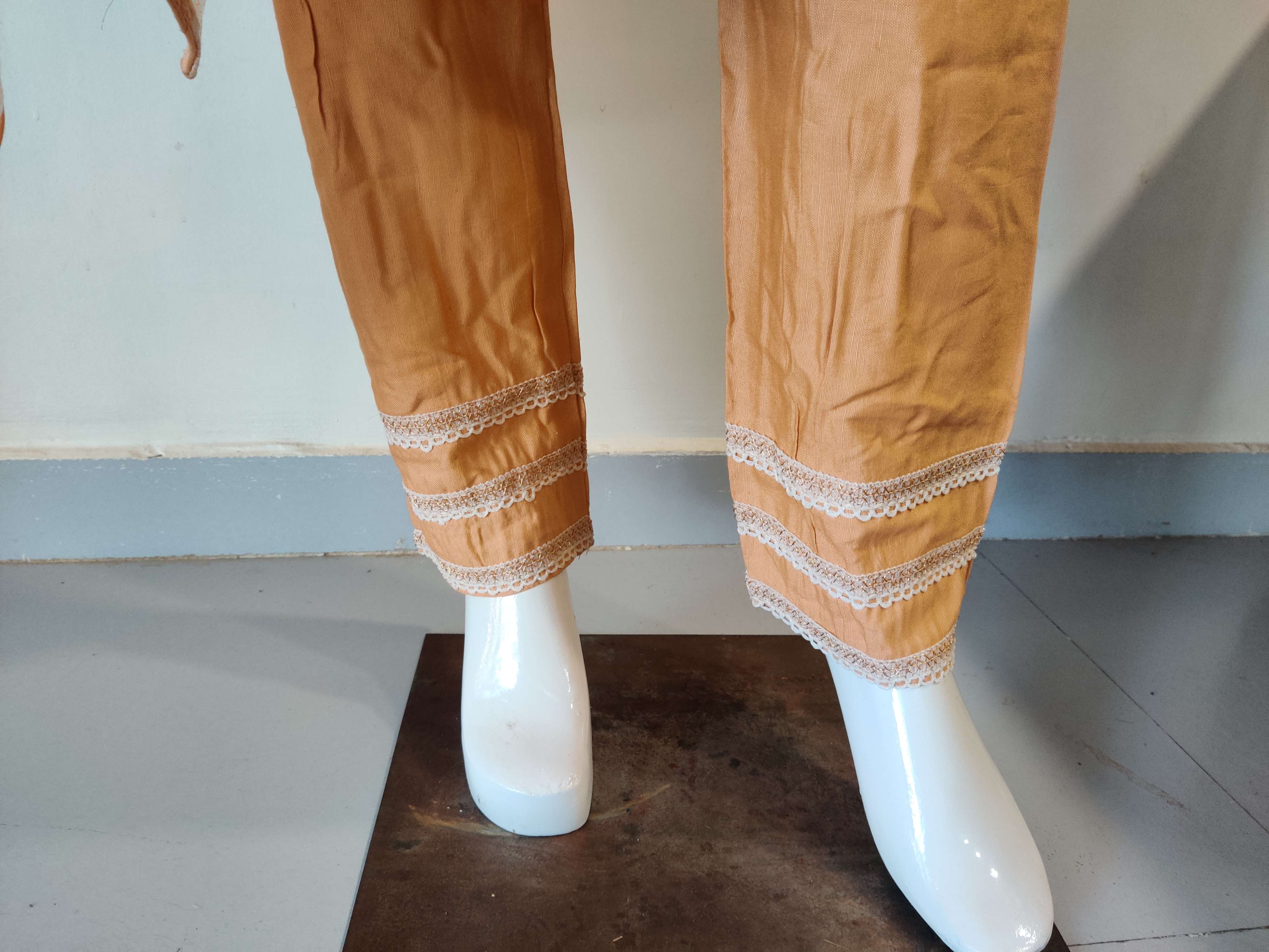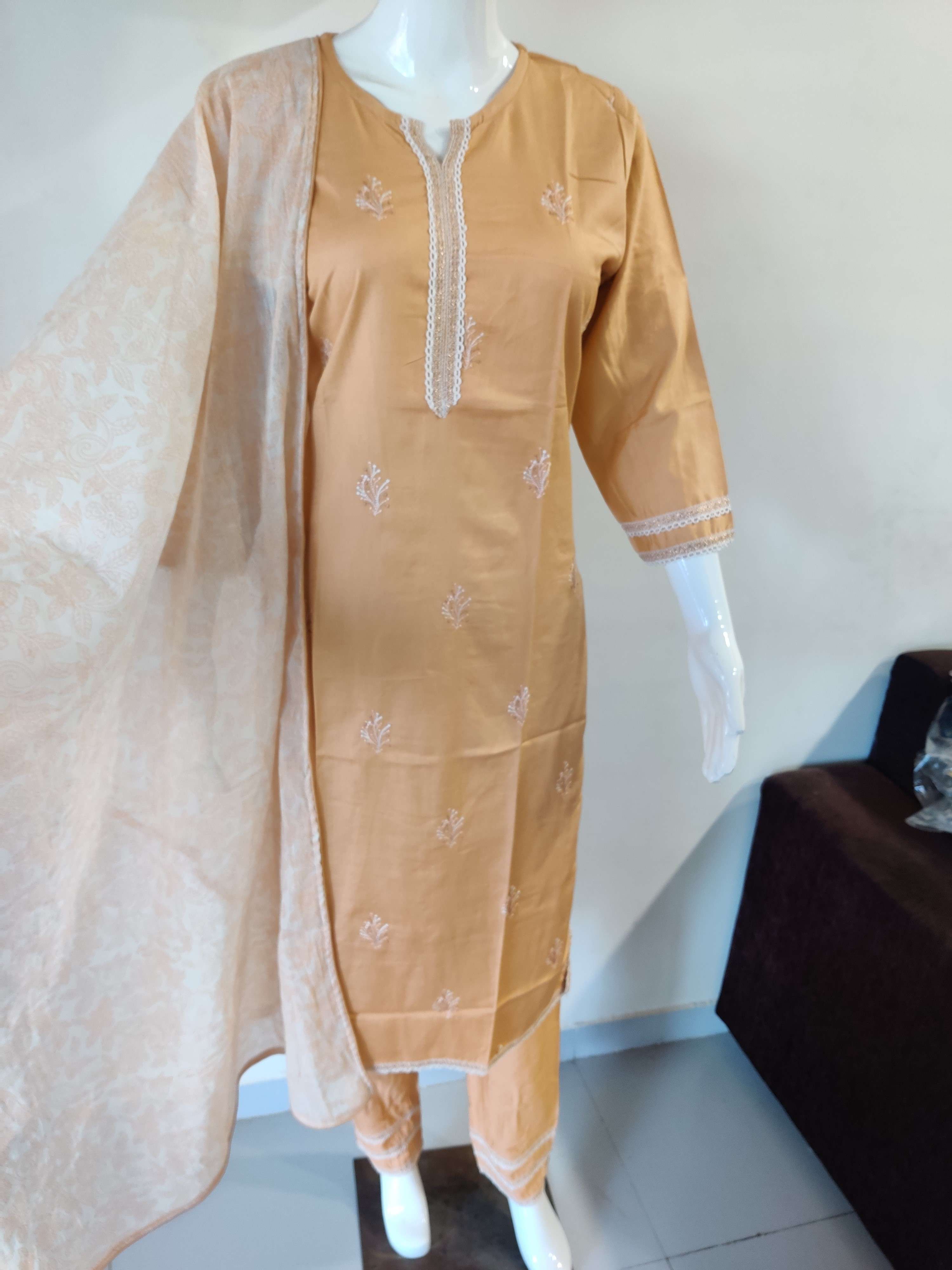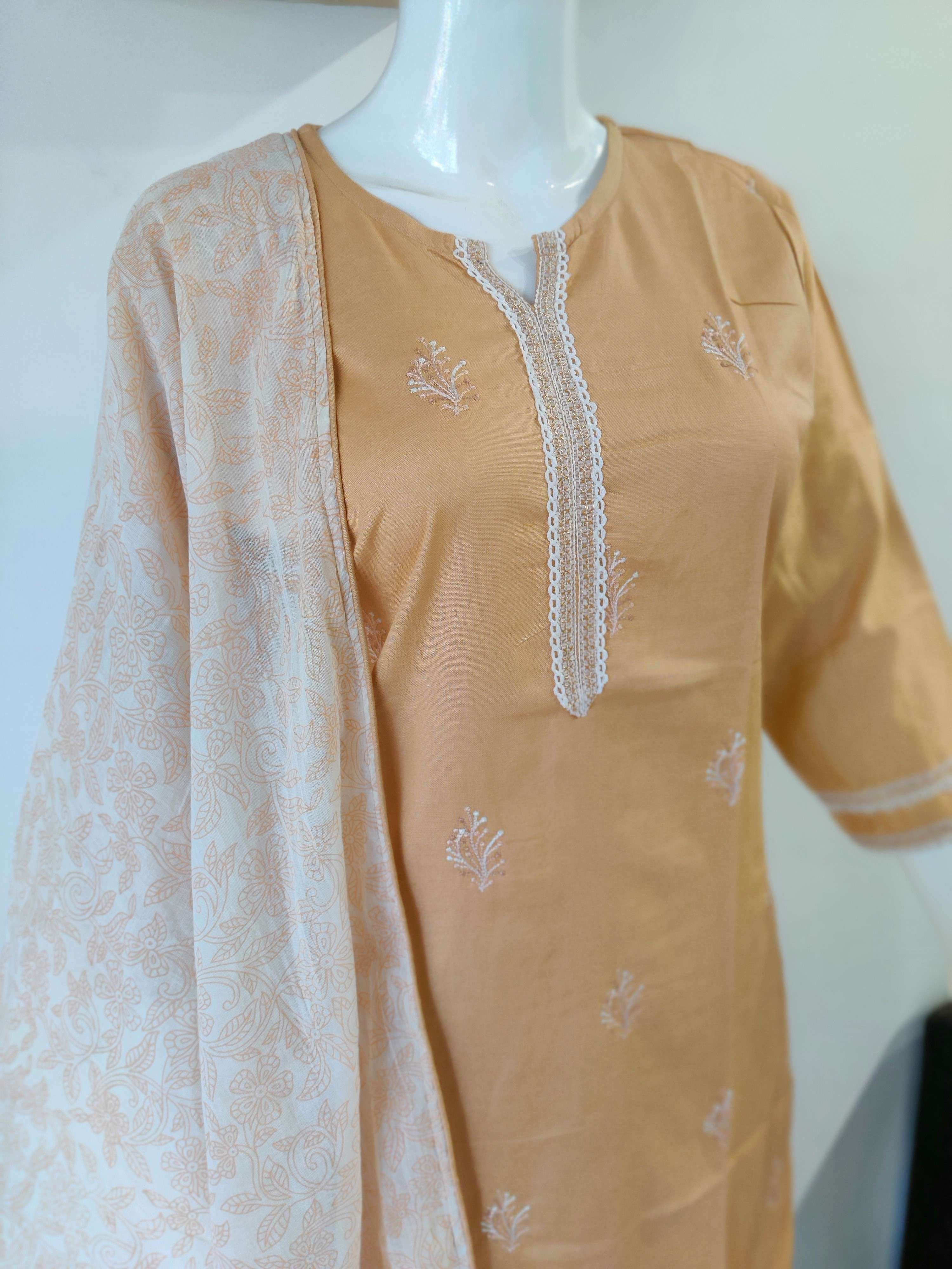 Cotton flex top and pants with embroidery and lacework with Mul  Block design dupatta. setwise - sizes - M, L, XL, XXL rate : Rs 765 + 5 % gst |