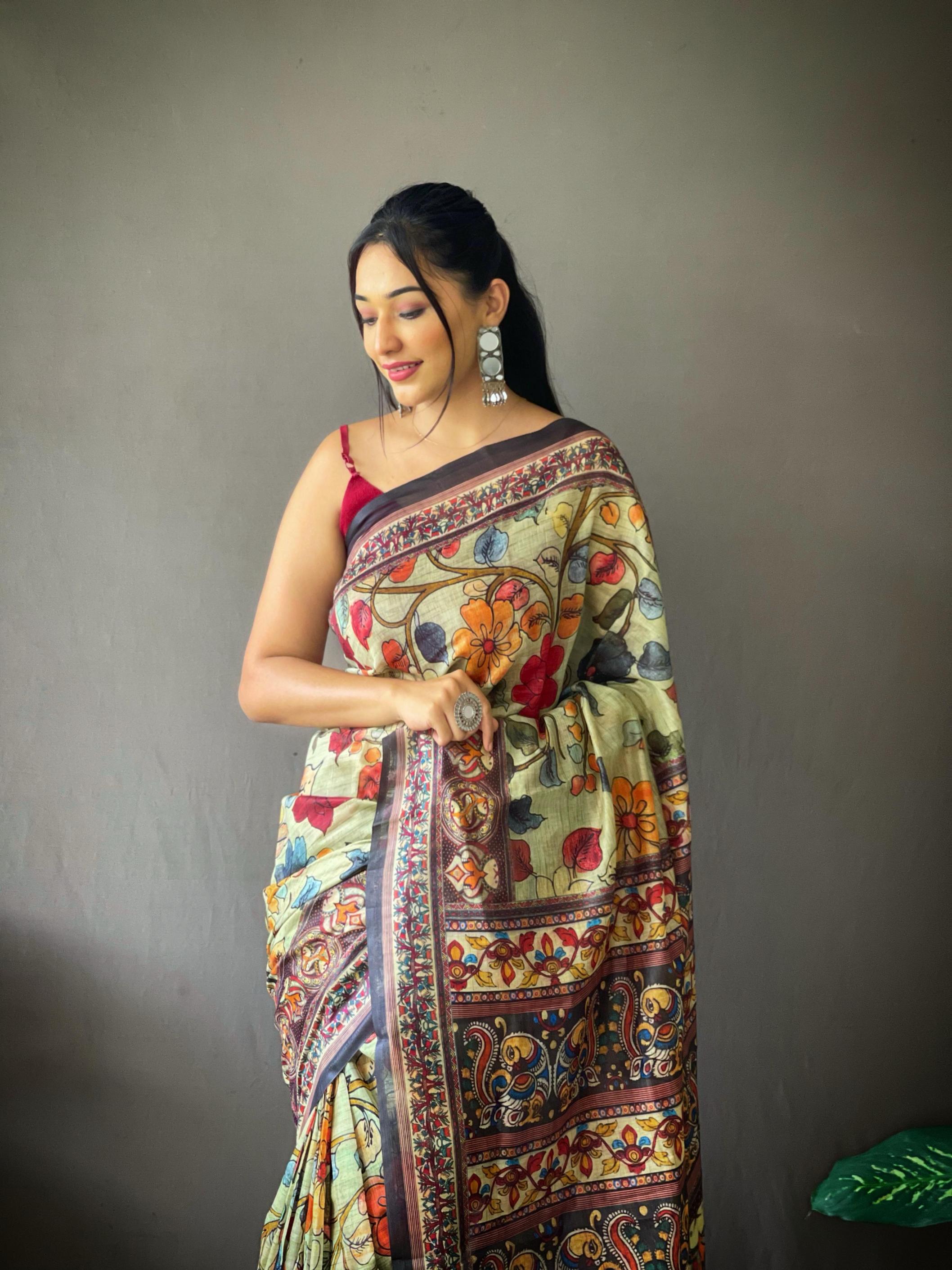 CATALOG: COTTON KALAMKARI 1 Beautiful Cotton Sarees With Kalamkari Digital Printed With Contrast Kalamkari Printed Border and Pallu attached with Tassels PRICE: 699/- +GST |