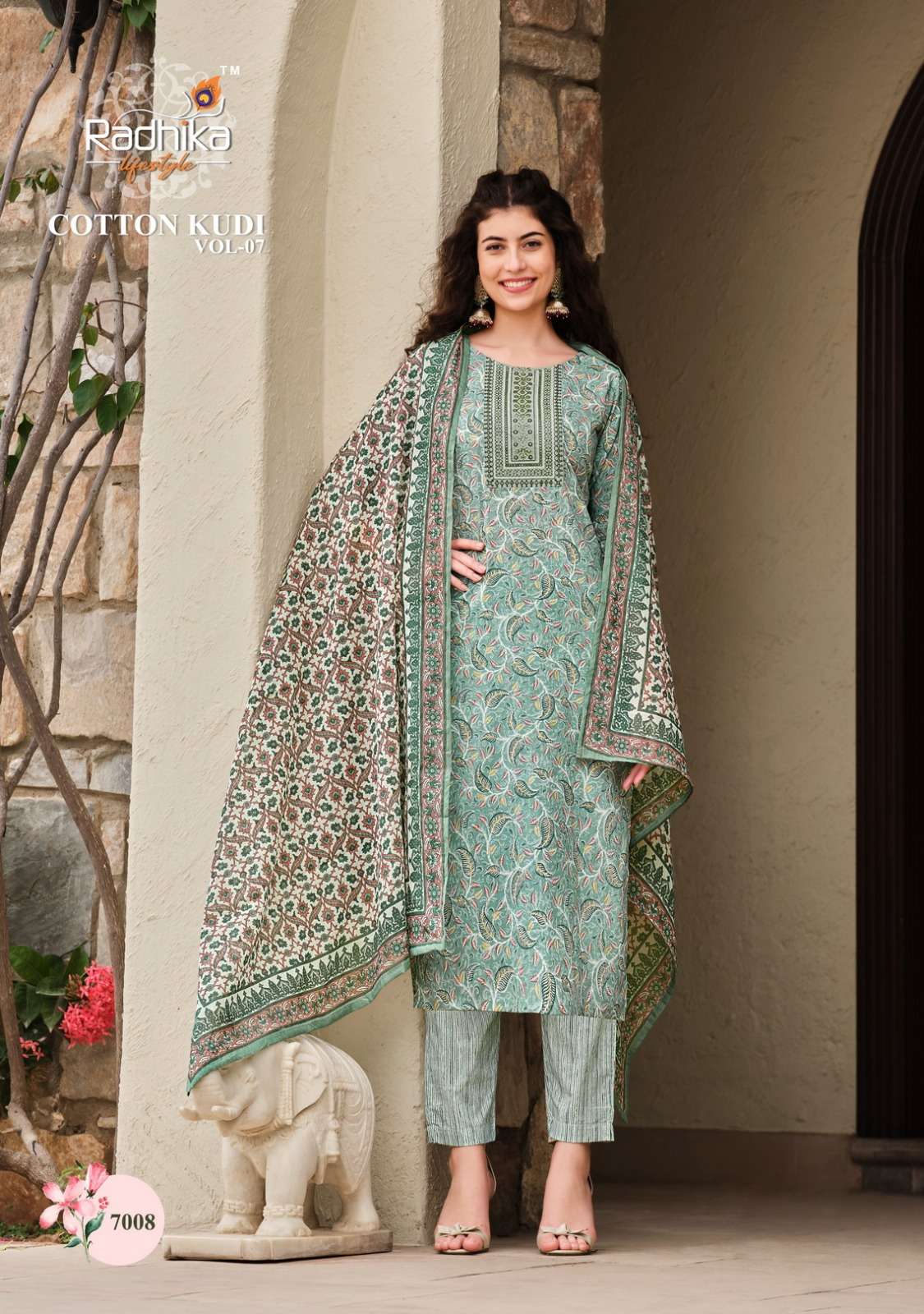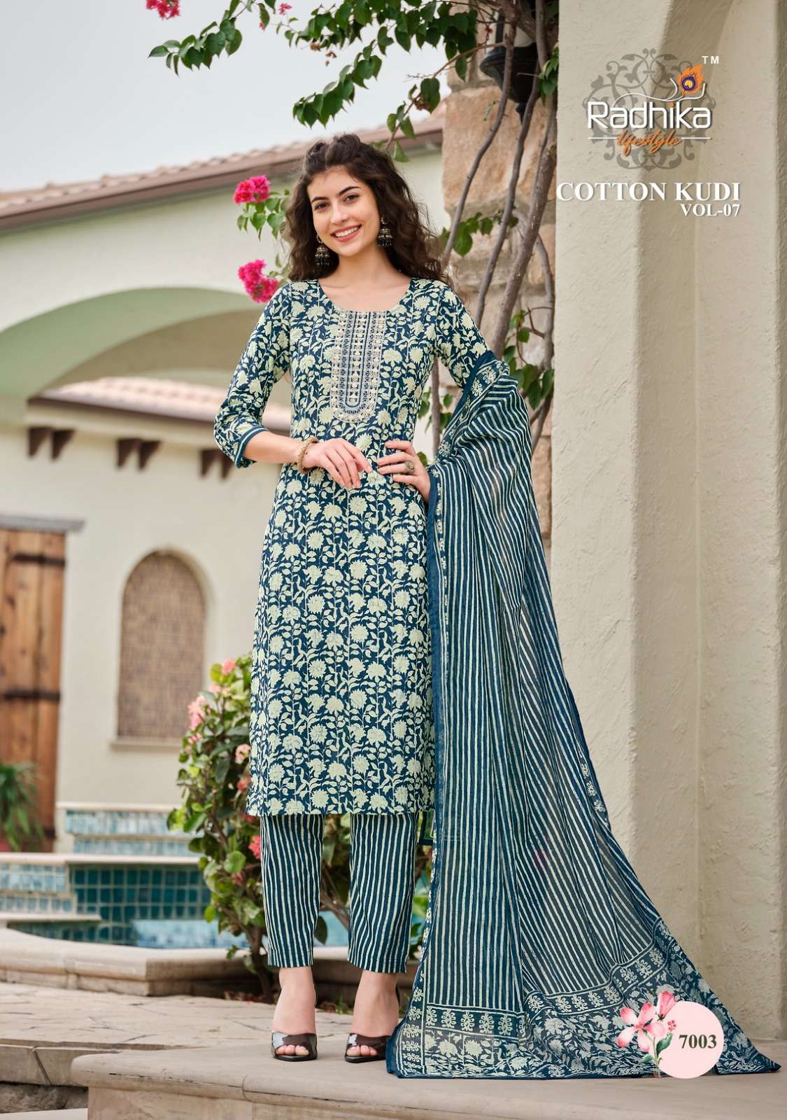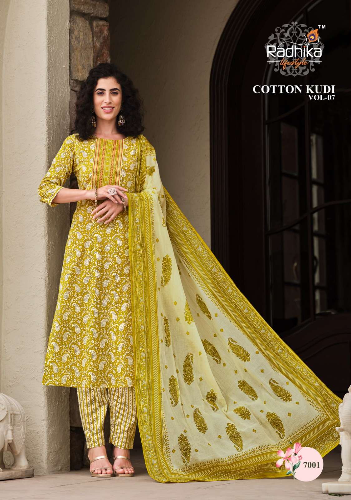 cotton kudi vol 7 by radhika lifestyle fancy 3pcs set beautiful cotton kurti with printed pants and dupatta