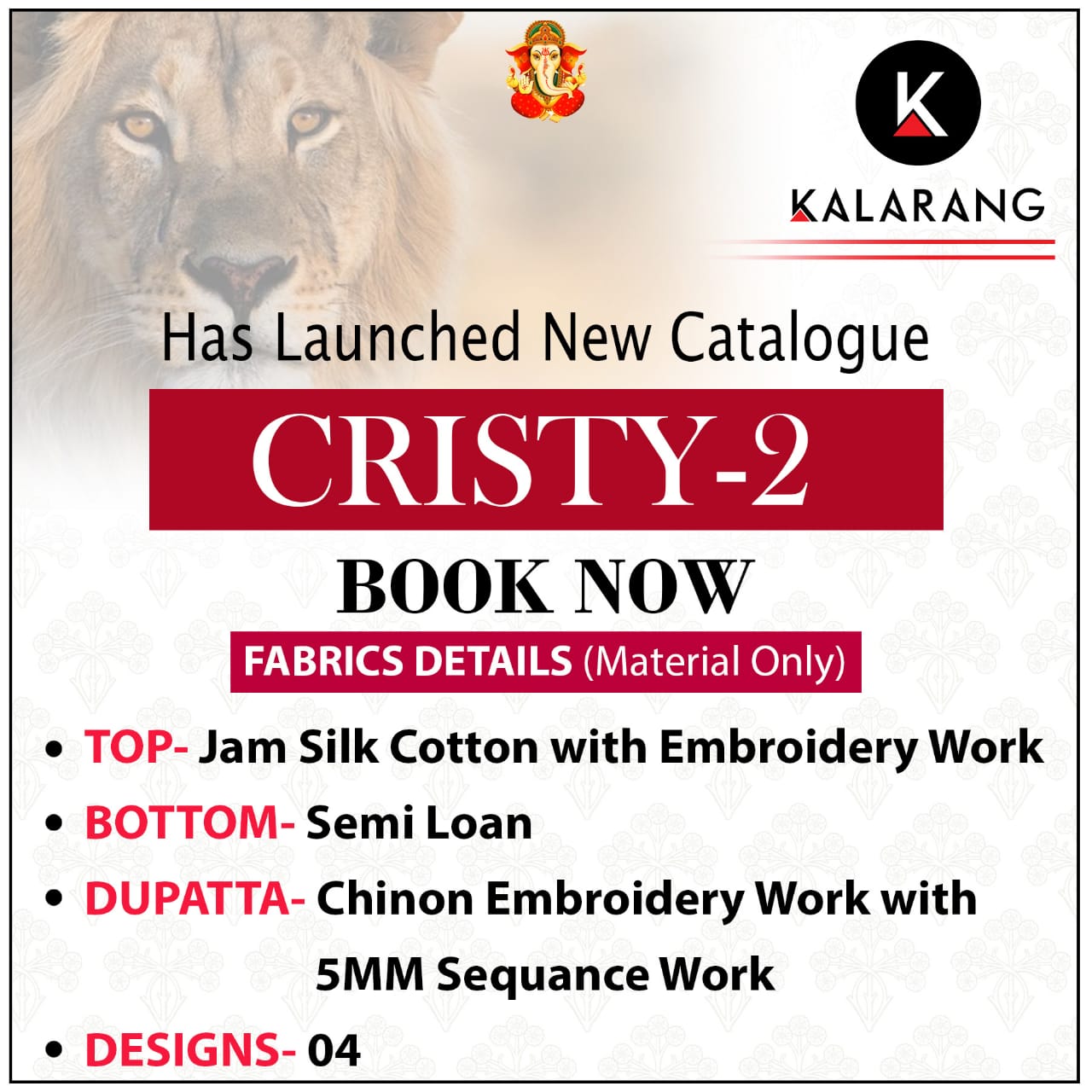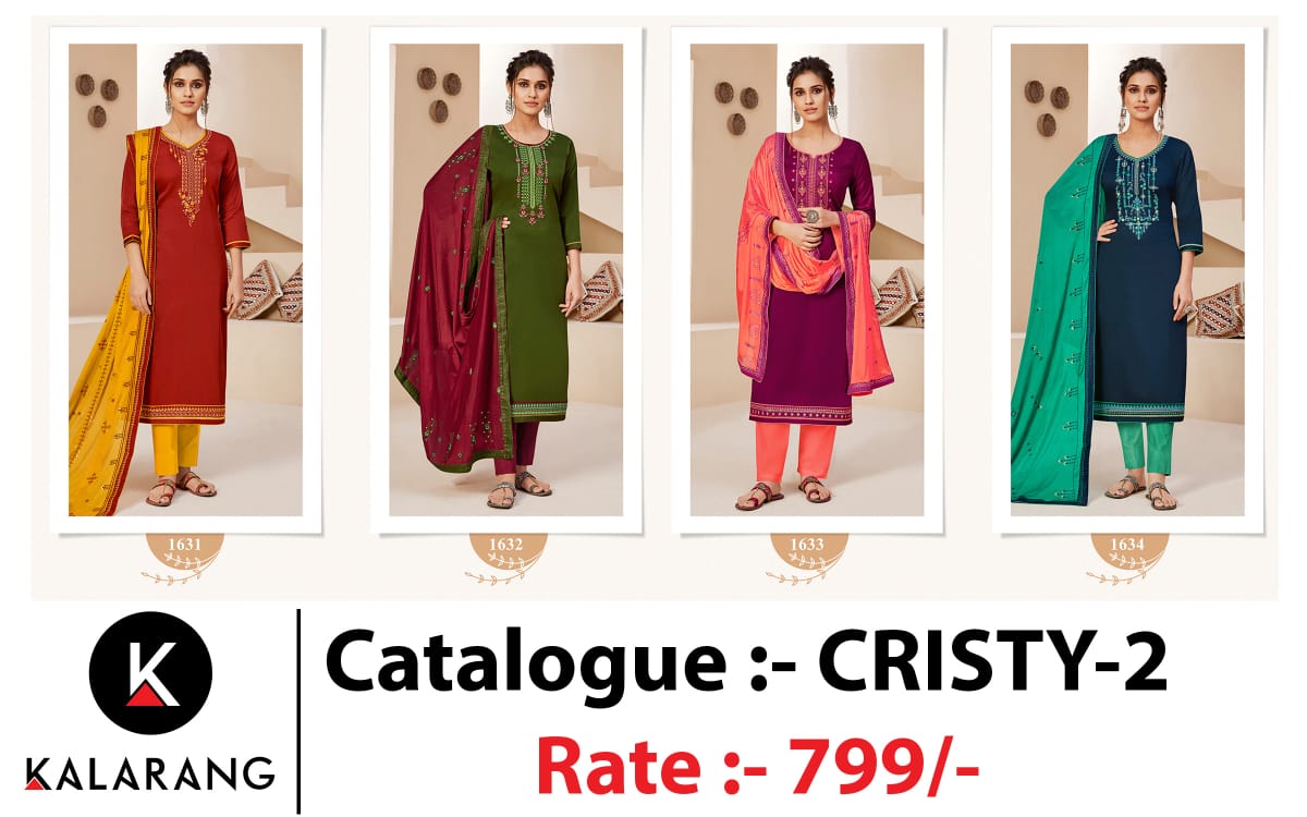 📌 KALARANG has launched Catalog name : * CRISTY VOL-2 * 🔸 Fabric Details 🔸 👚Top:- Jam Silk Cotton with Embroidery Work 👖Bottom:- Semi Loan 🧣Dupatta:- Chinon Embroidery Work With 5MM Sequance Work 👜Total Design:- 4 Rate 799/. Set to set ⏰Dispatching 5 to 6 days later |