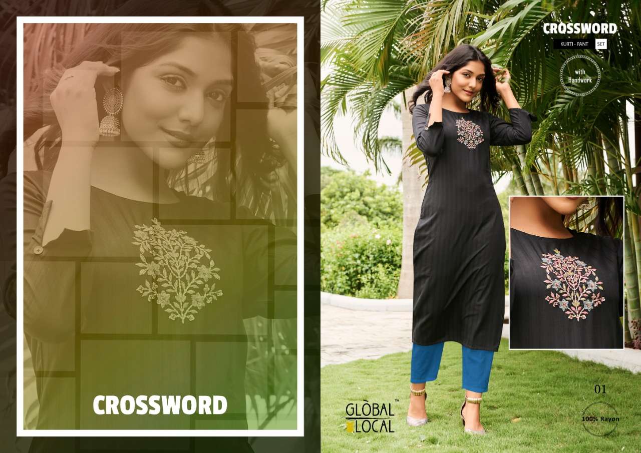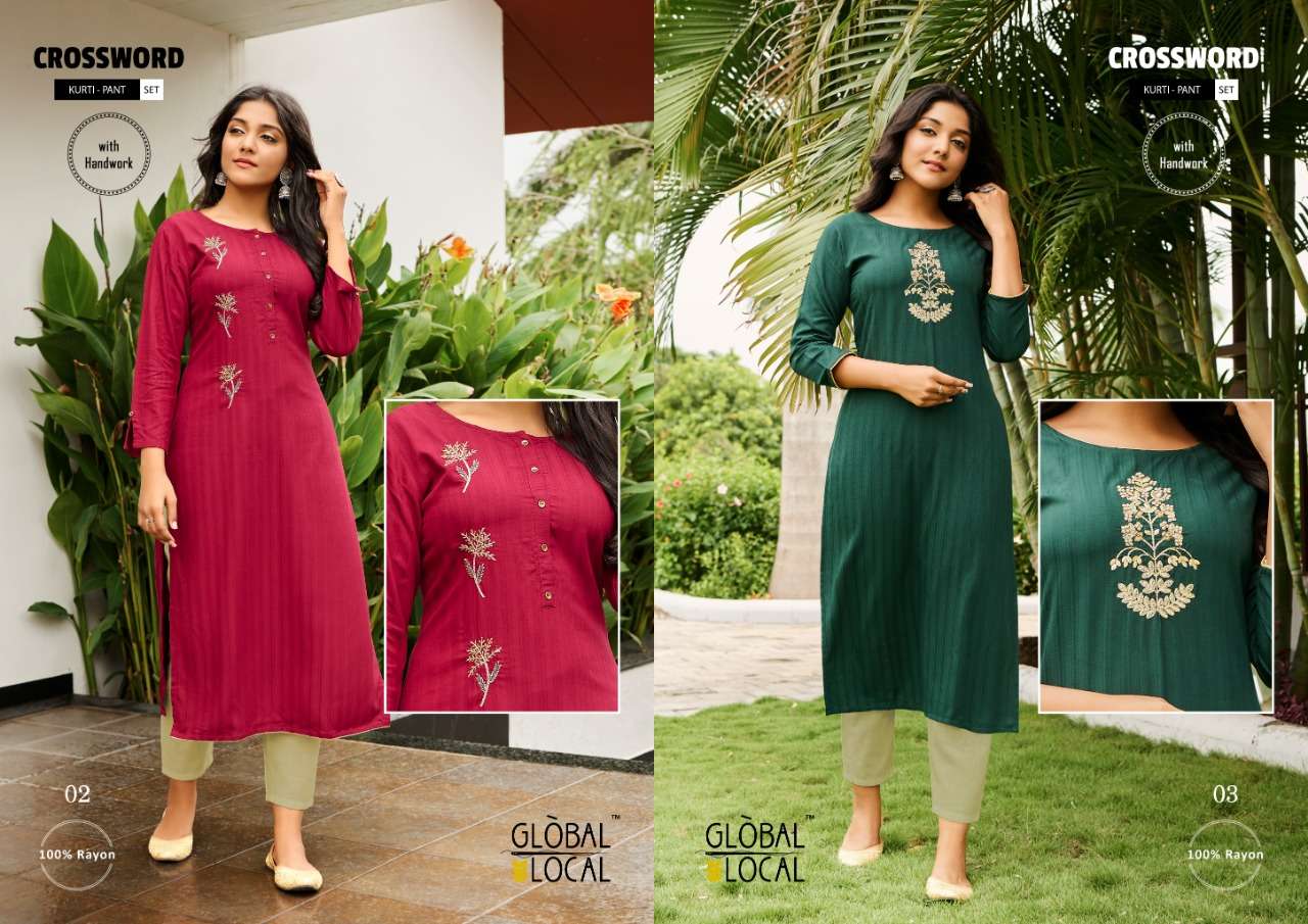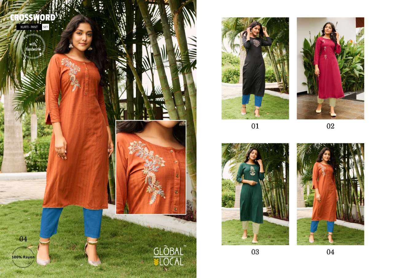 Catalog : CROSSWORD Style : Kurti + Pant Combo set BRAND : GLOBAL LOCAL⢠TYPE :  Handwork Embroidered kurtis in 100% patterned rayon with rayon pants SIZES : S to 3XL RATE : 730/-(Kurti with pants) Pieces:  4 per Bag |