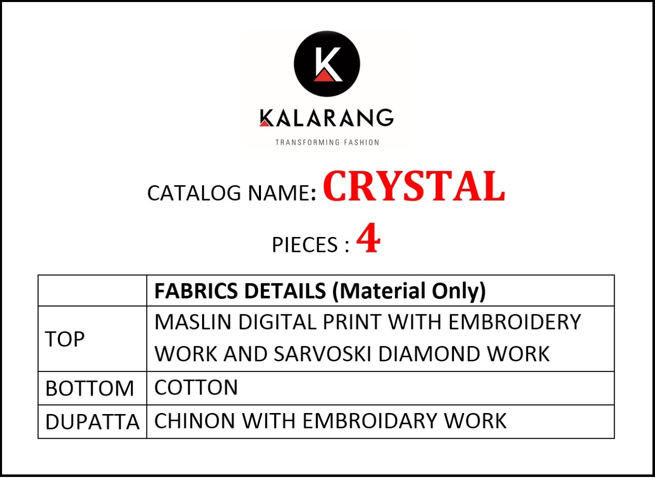 Catalog name : CrystalFabric Details âªTop:- MASLIN DIGITAL PRINT WITH EMBROIDERY WORK AND SARVOSKI DIAMOND WORK âªBottom:- COTTON âªDupatta:- CHINON WITH EMBROIDERY WORK âªTotal Design:- 4 â°Dispatching 5 to 6 days later PRICE 895+GST |