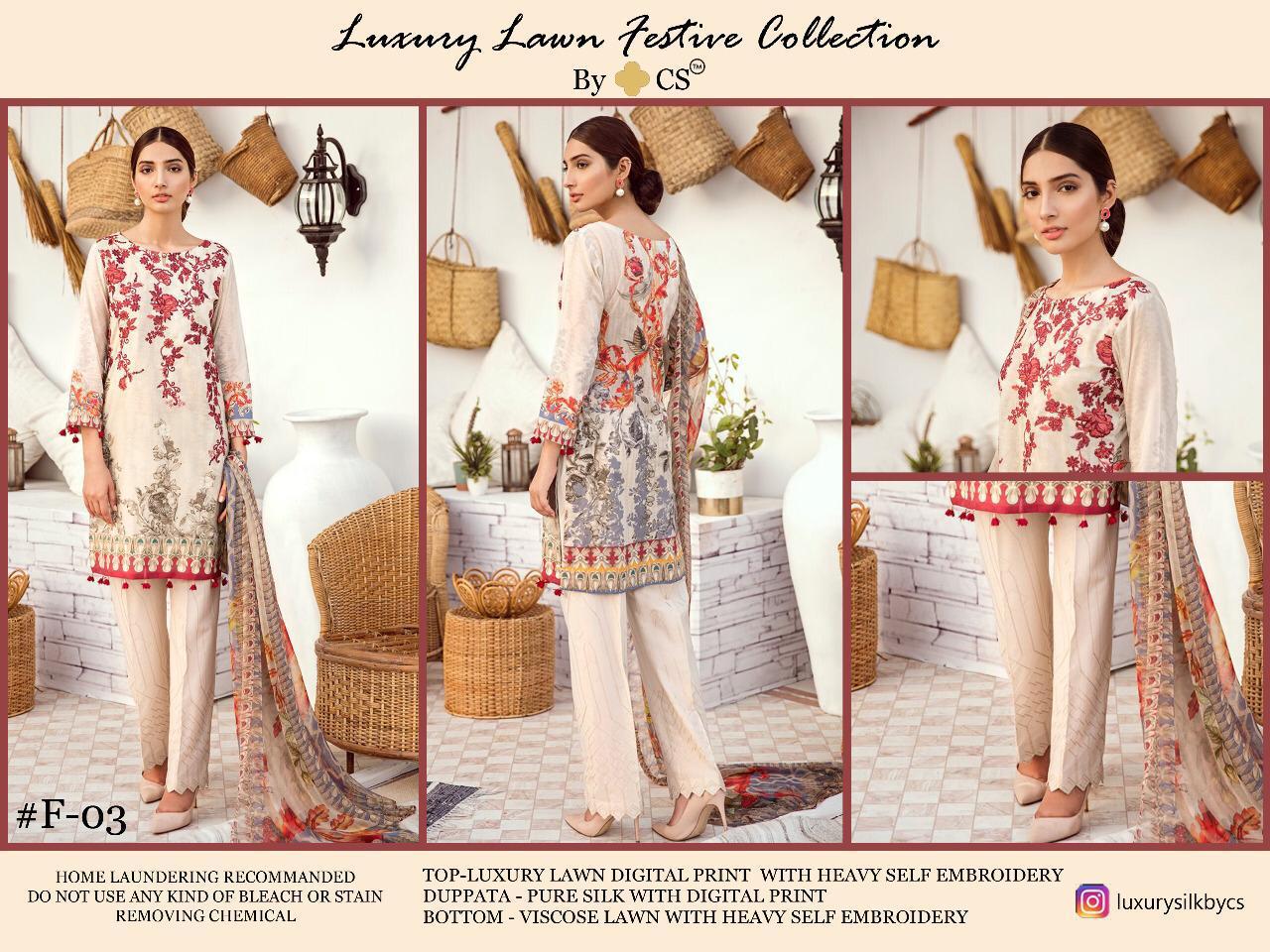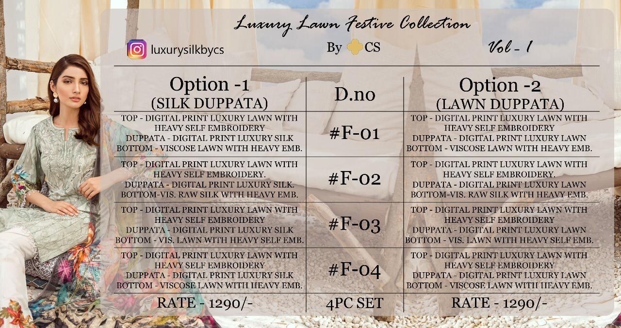 LUXURY LAWN FESTIVE COLLECTION VOL 1 â Fabric Details â âª Top : Luxury Lawn Digital Print with heavy Self Embroidery ⪠Sleeves : luxury lawn digital print ⪠DUPATTA: Pure Silk with Fully Digital Print ⪠Bottom : Original RAW SILK Lawn (Soft Fabric) embroidered (Self Embroidery in all pieces) Price:- Rs 1290/- |