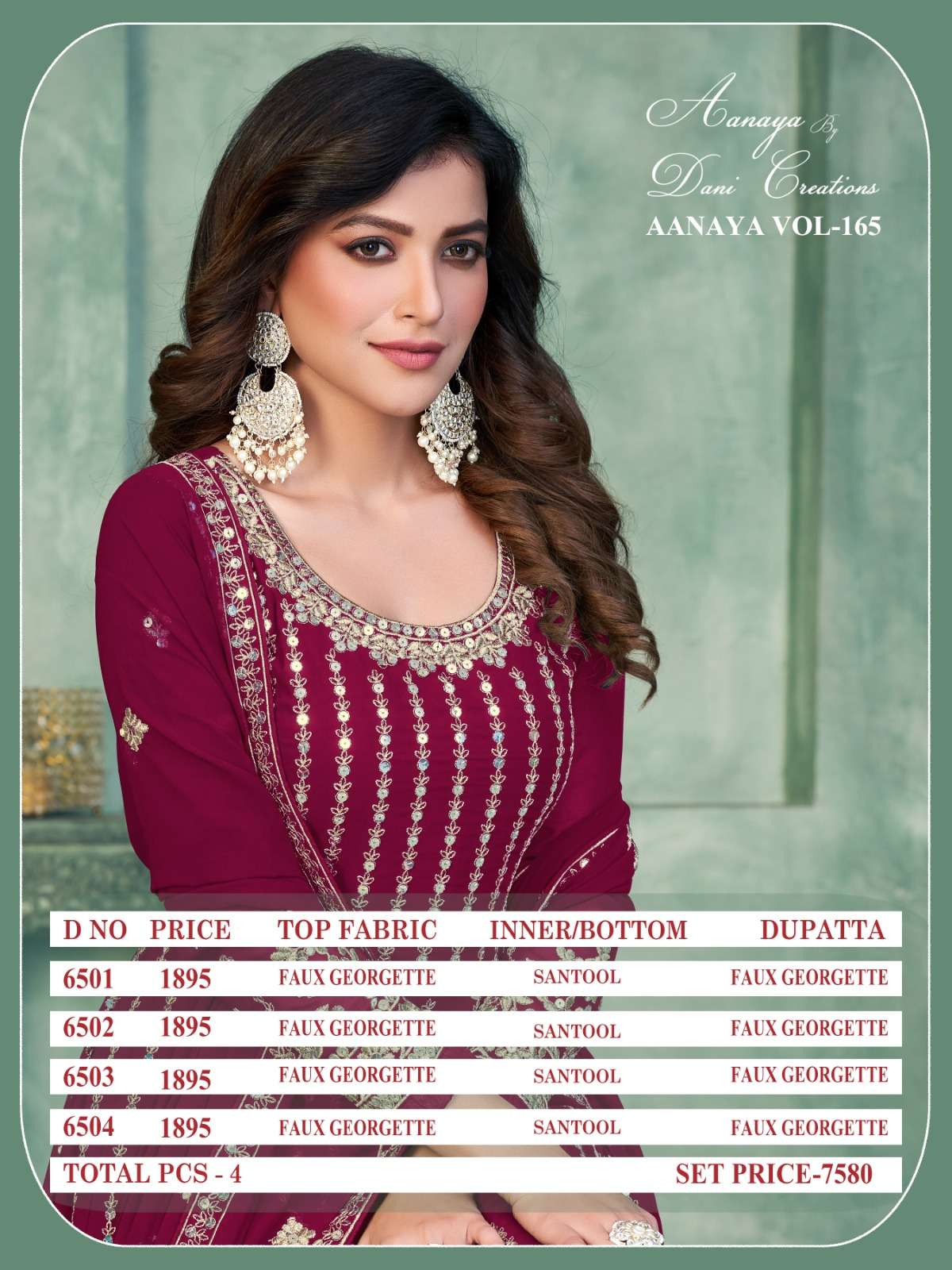 Dear sir, AANAYA VOL-165 (6500 series) Top. – FAUX GEORGETTE inner/ bottom - SANTOOL Dupatta – FAUX GEORGETTE Price :- 1895/- RS
