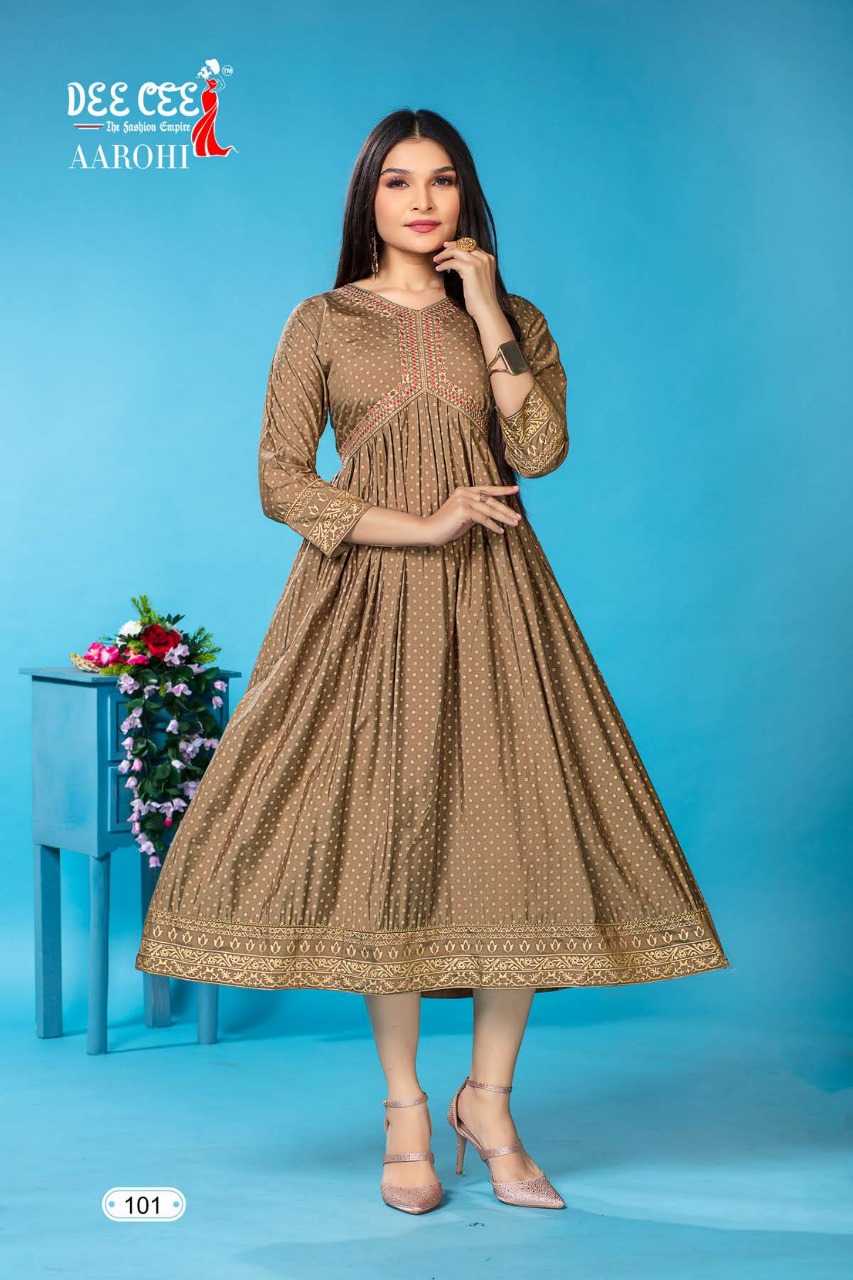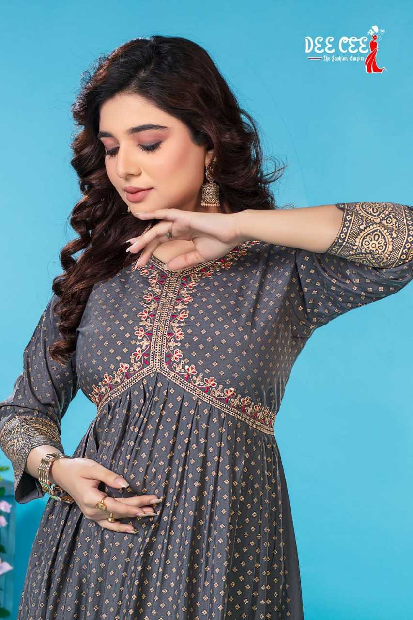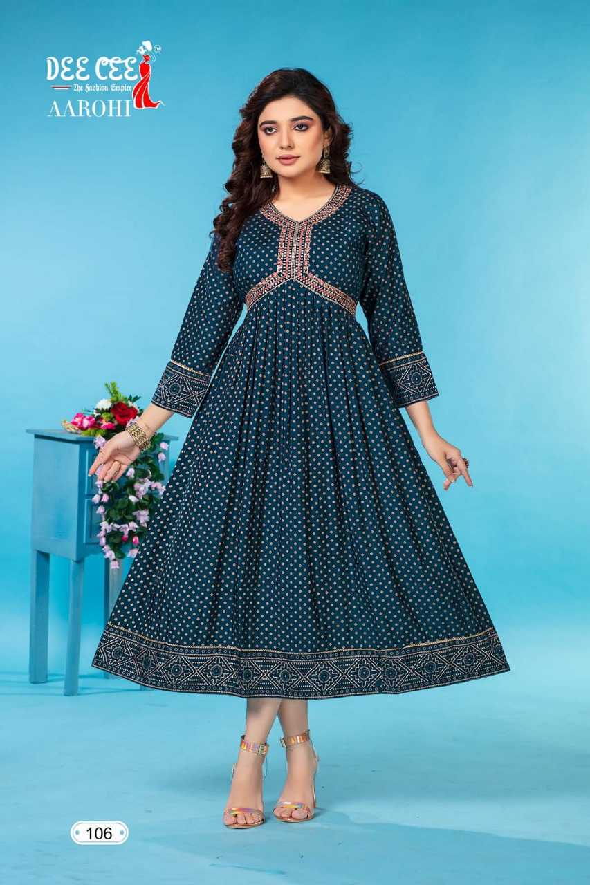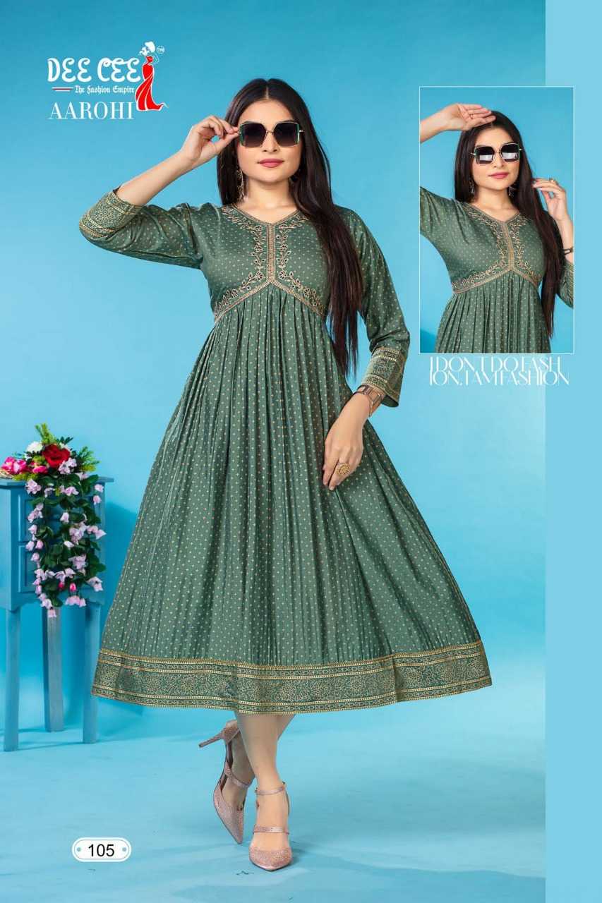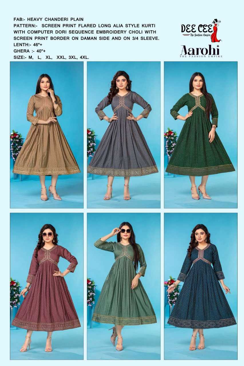 dee cee aarohi stitched alia cut flair long kurti festive wear collection