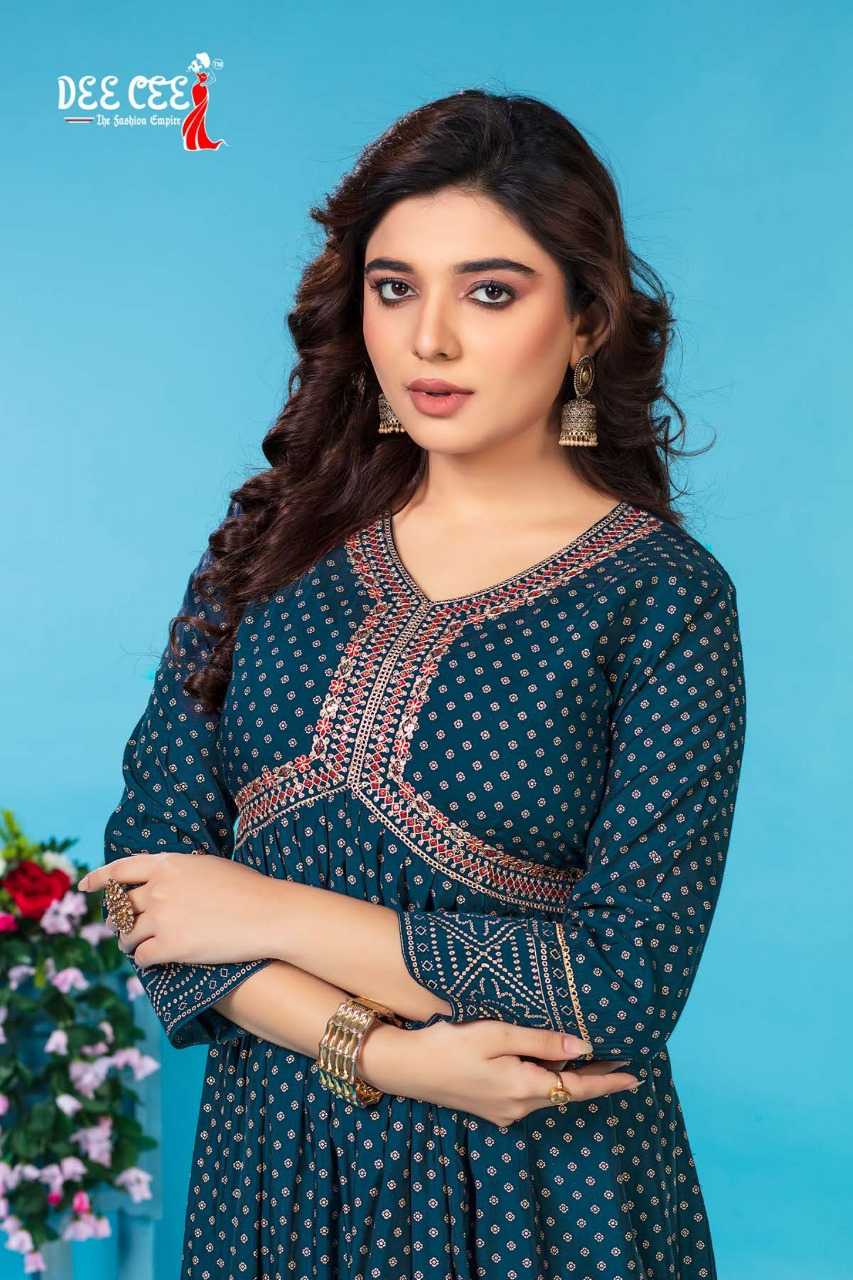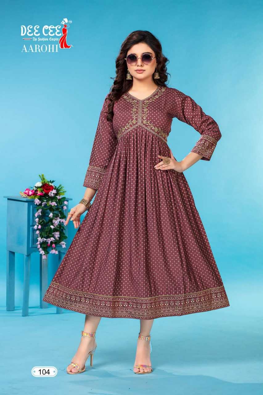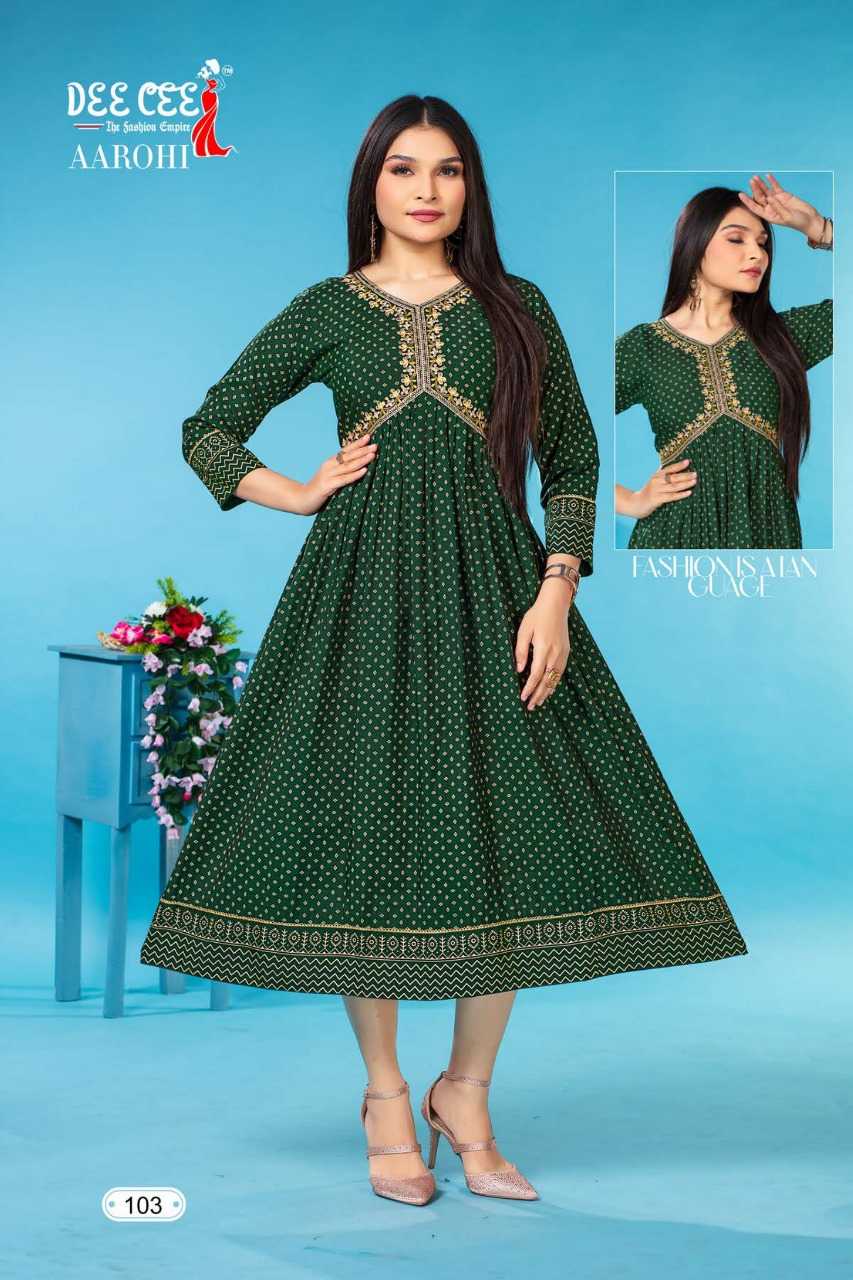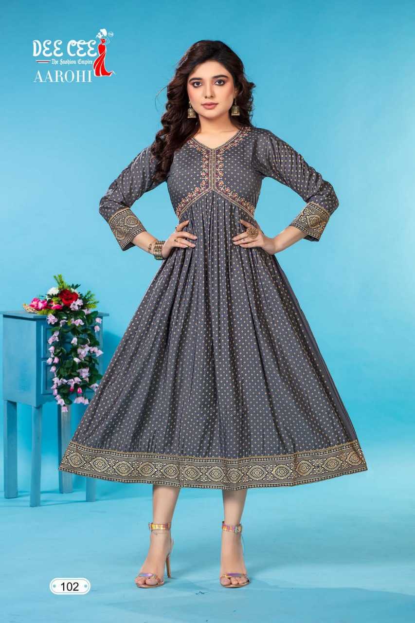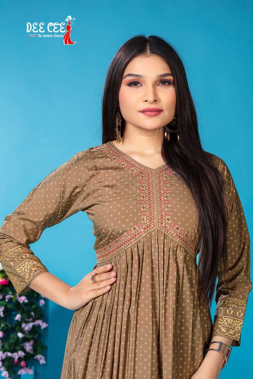 dee cee aarohi stitched alia cut flair long kurti festive wear collection