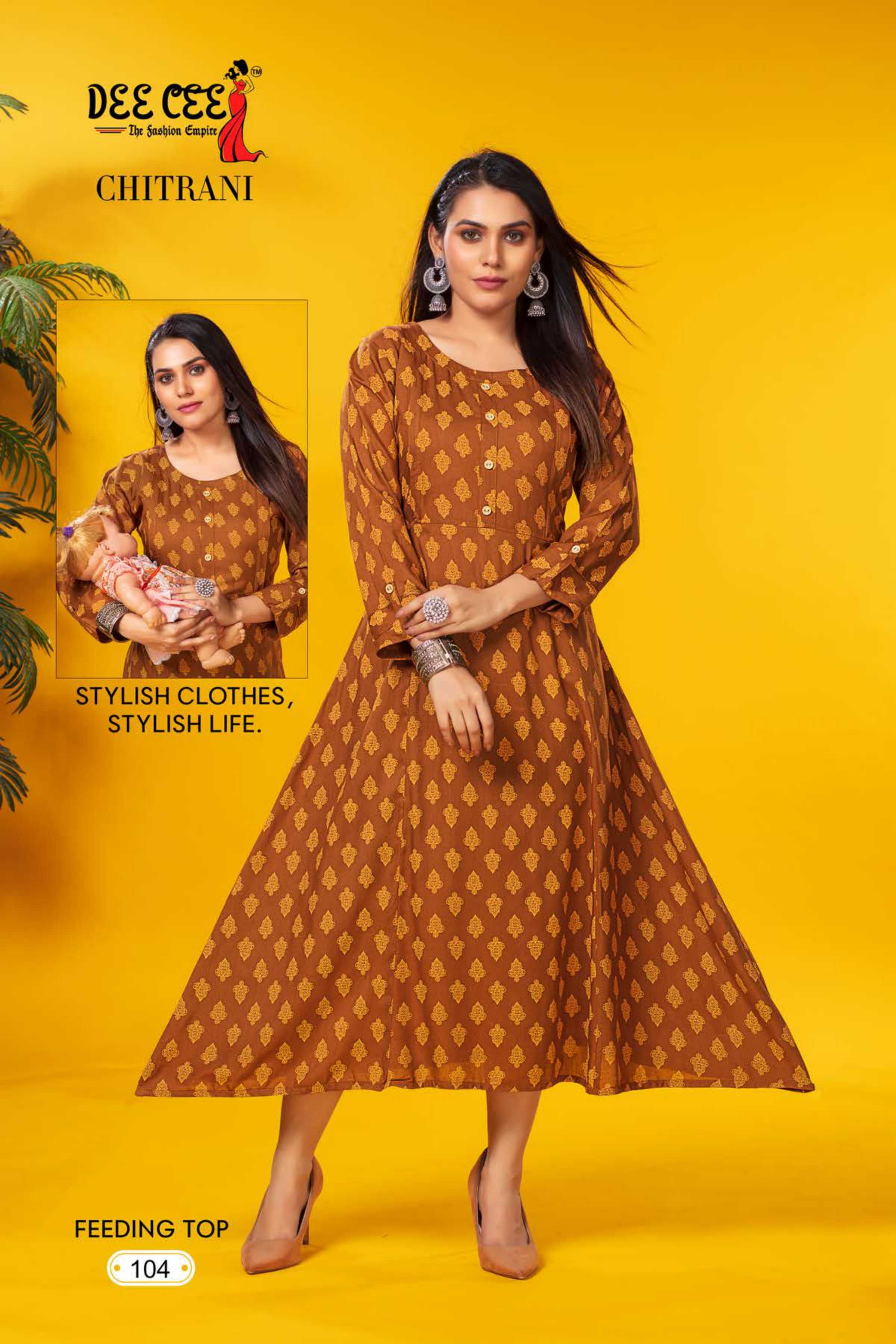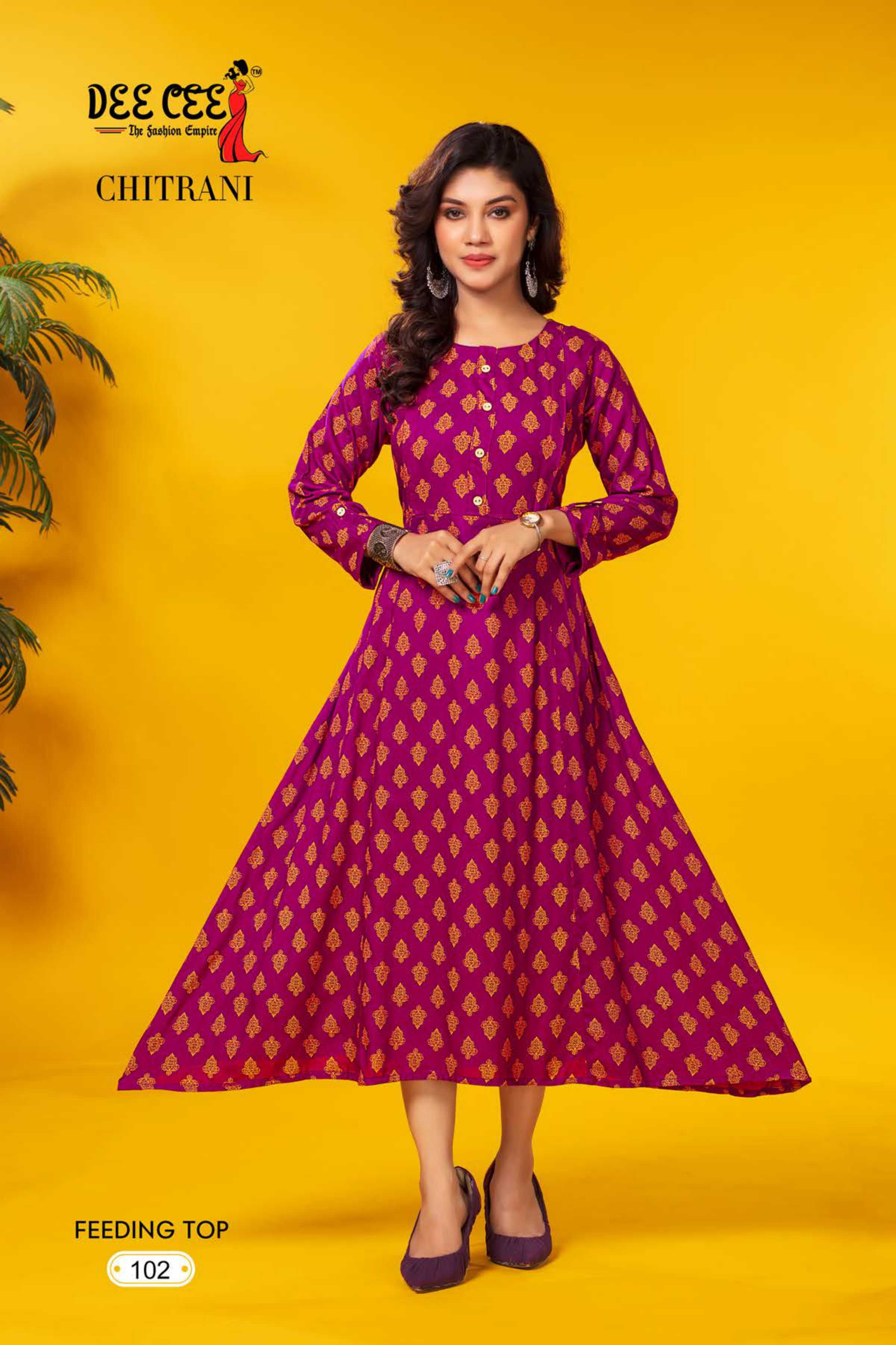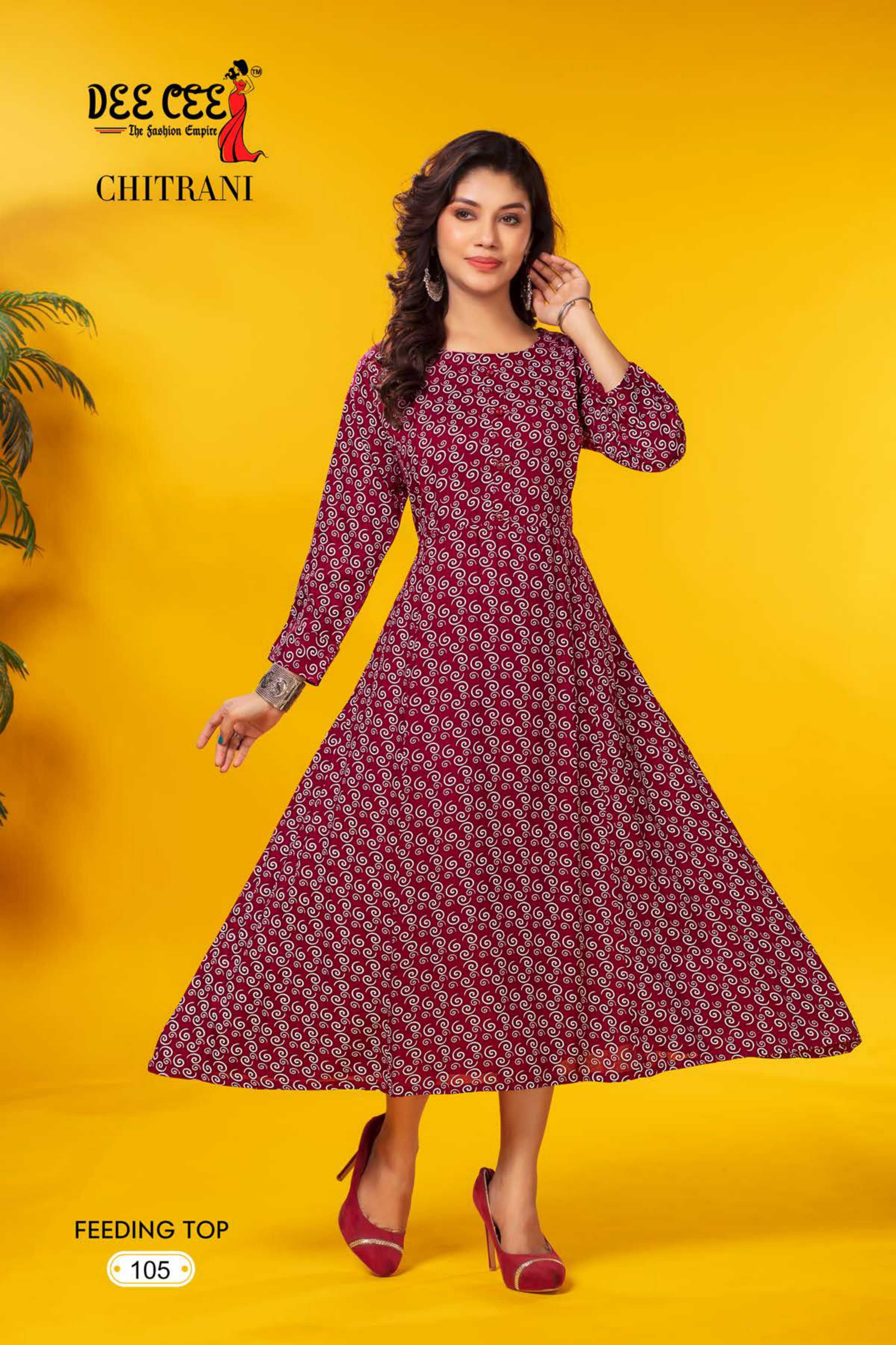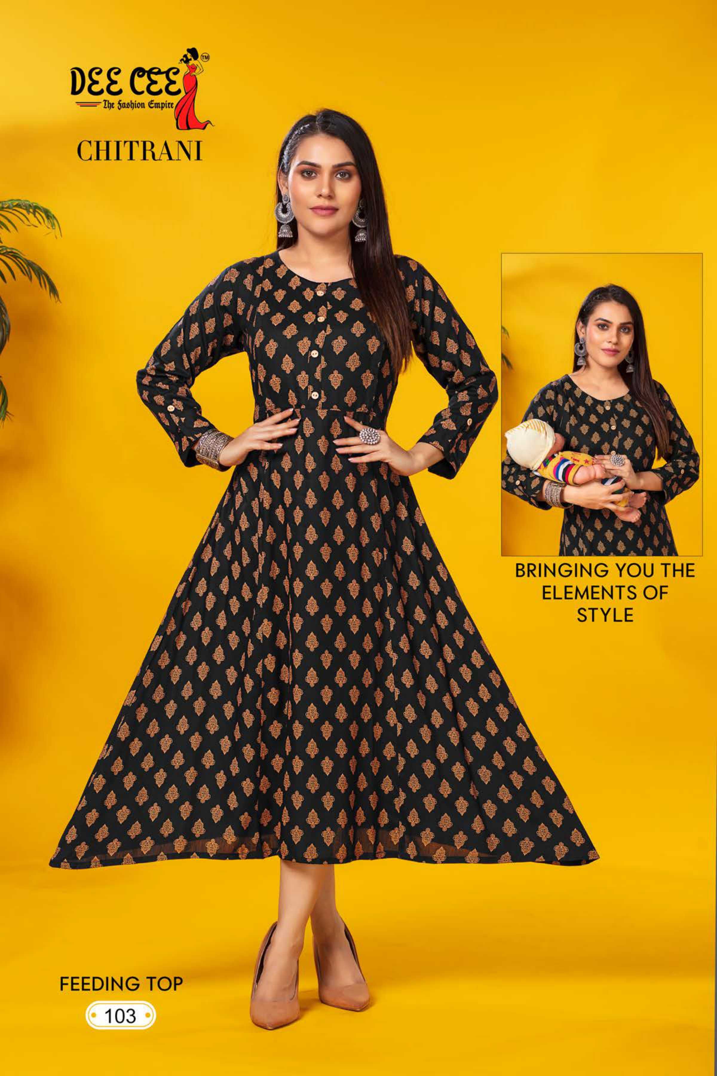 dee cee chitrani stitched rayon kali style flair long feeding kurti