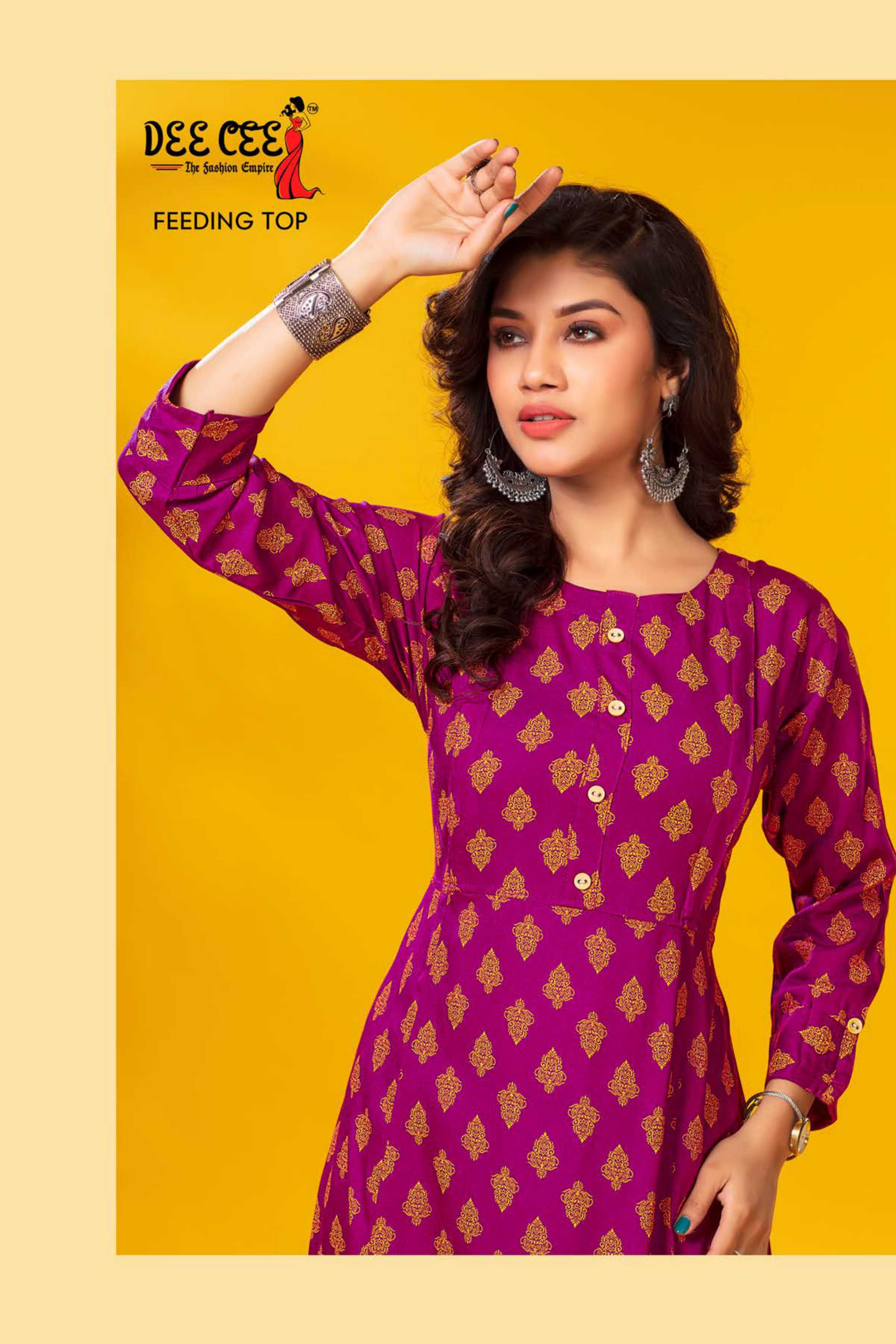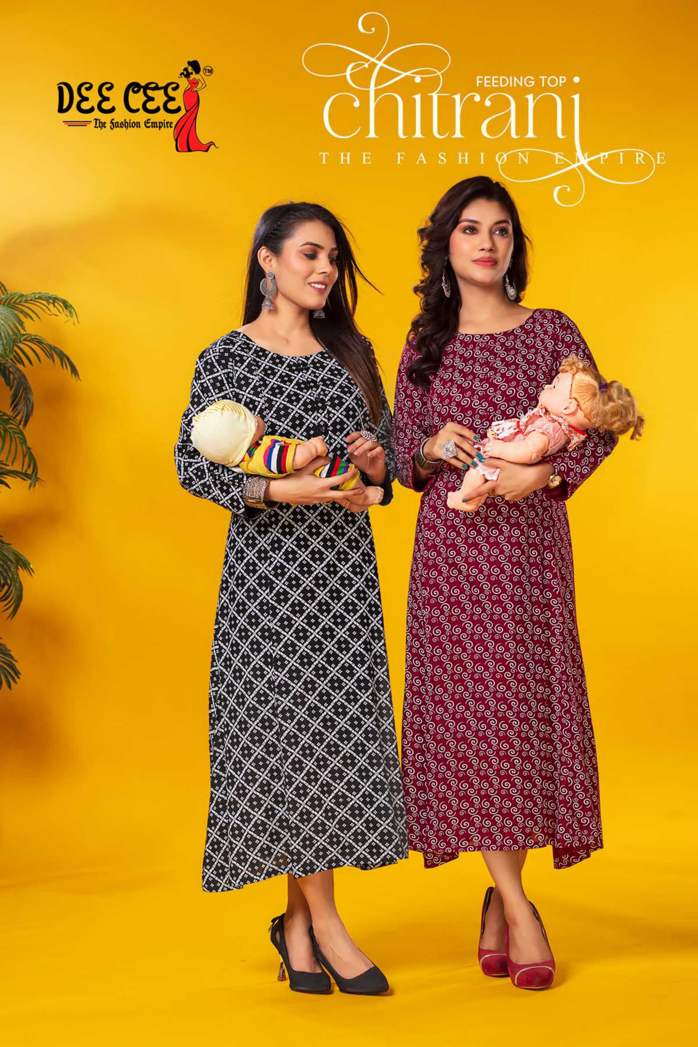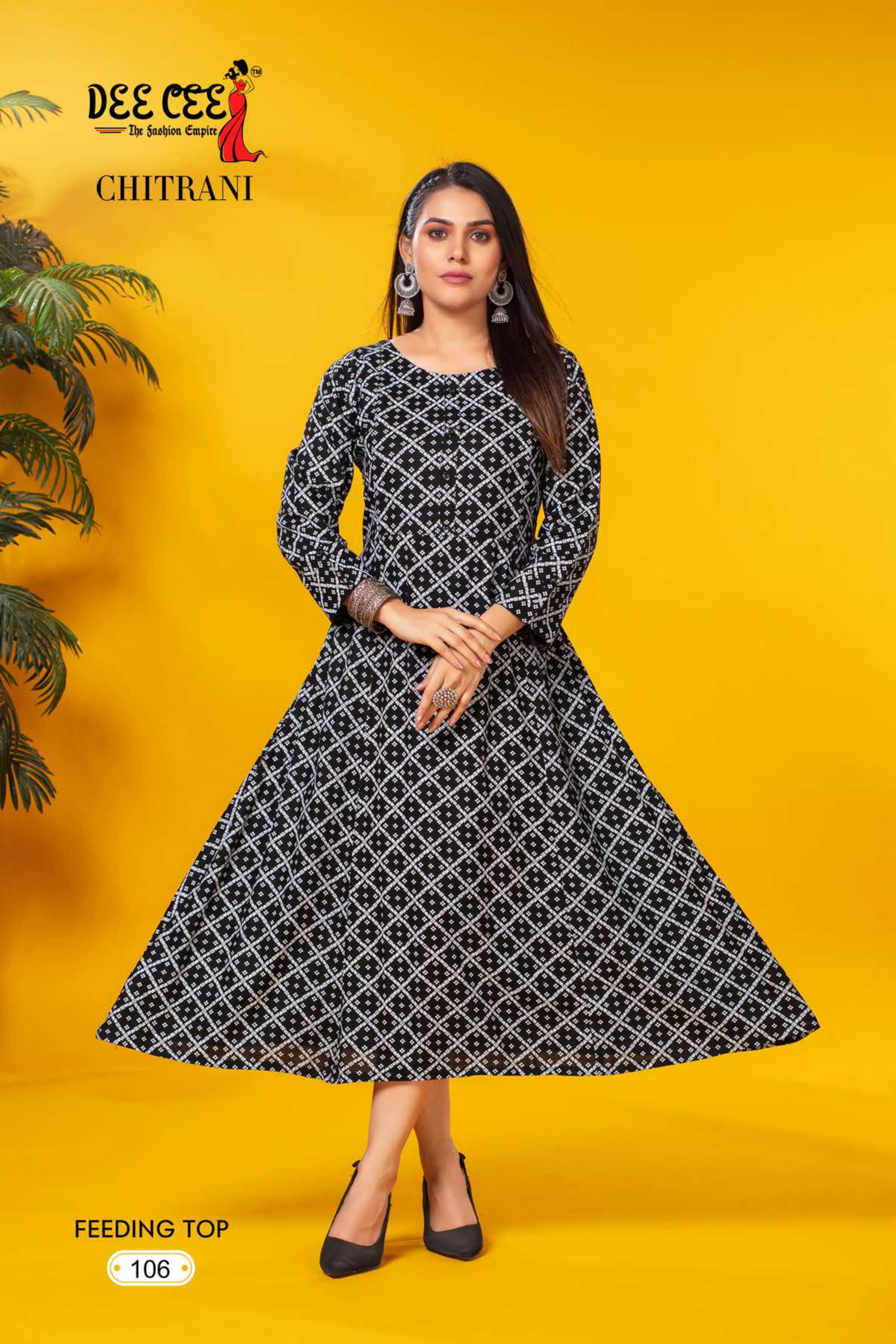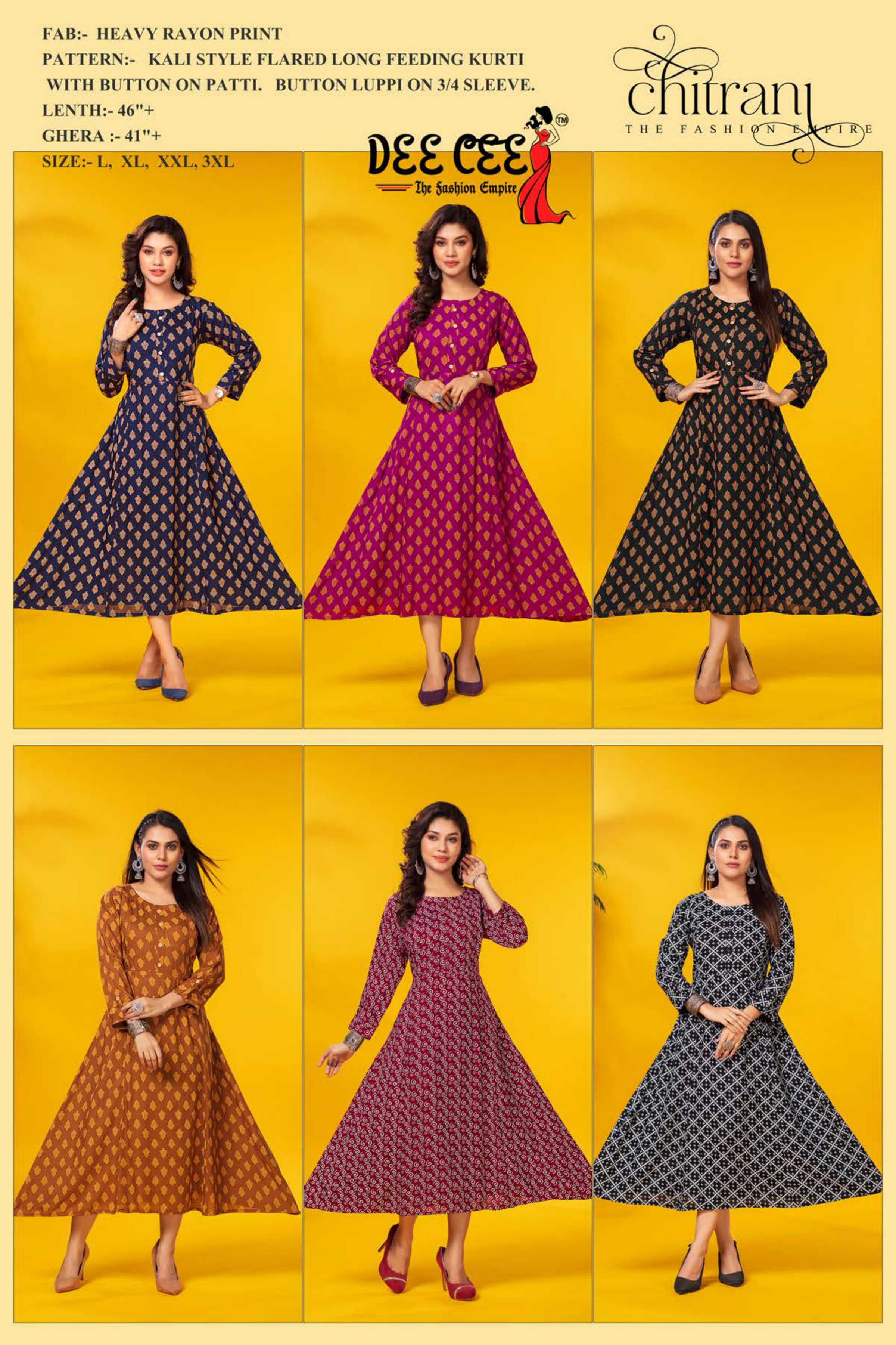 dee cee chitrani stitched rayon kali style flair long feeding kurti