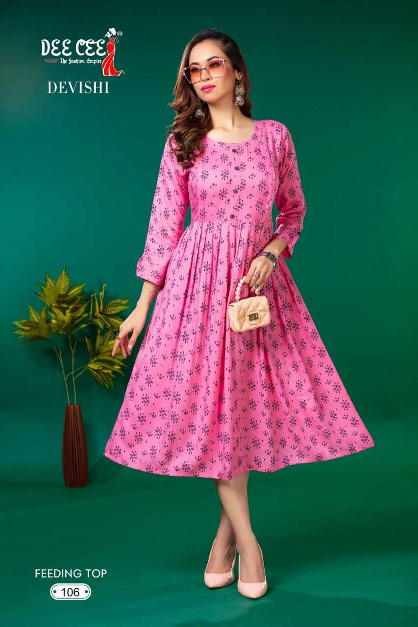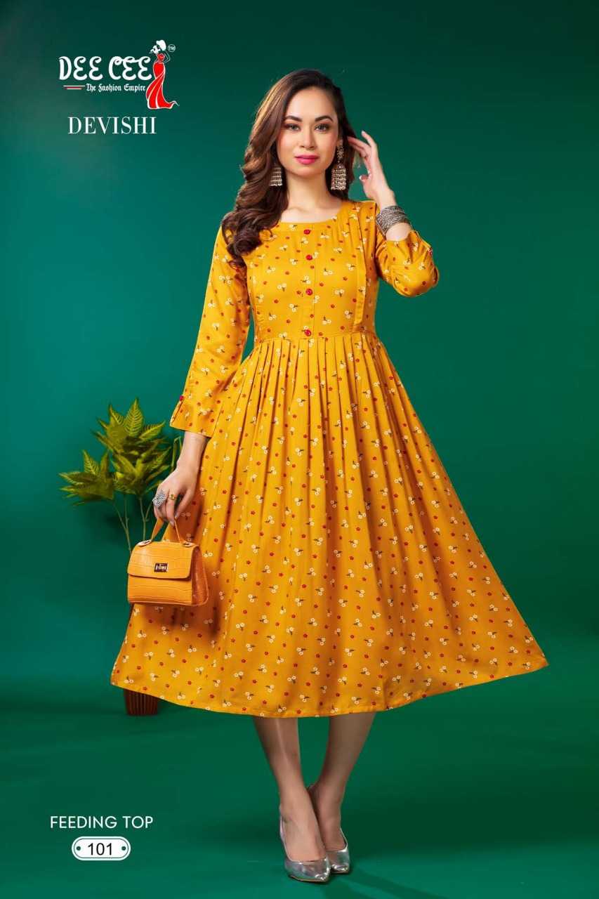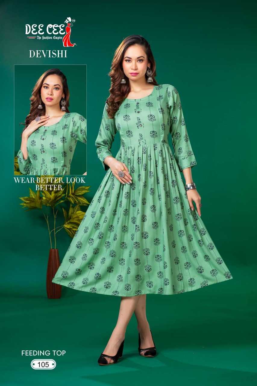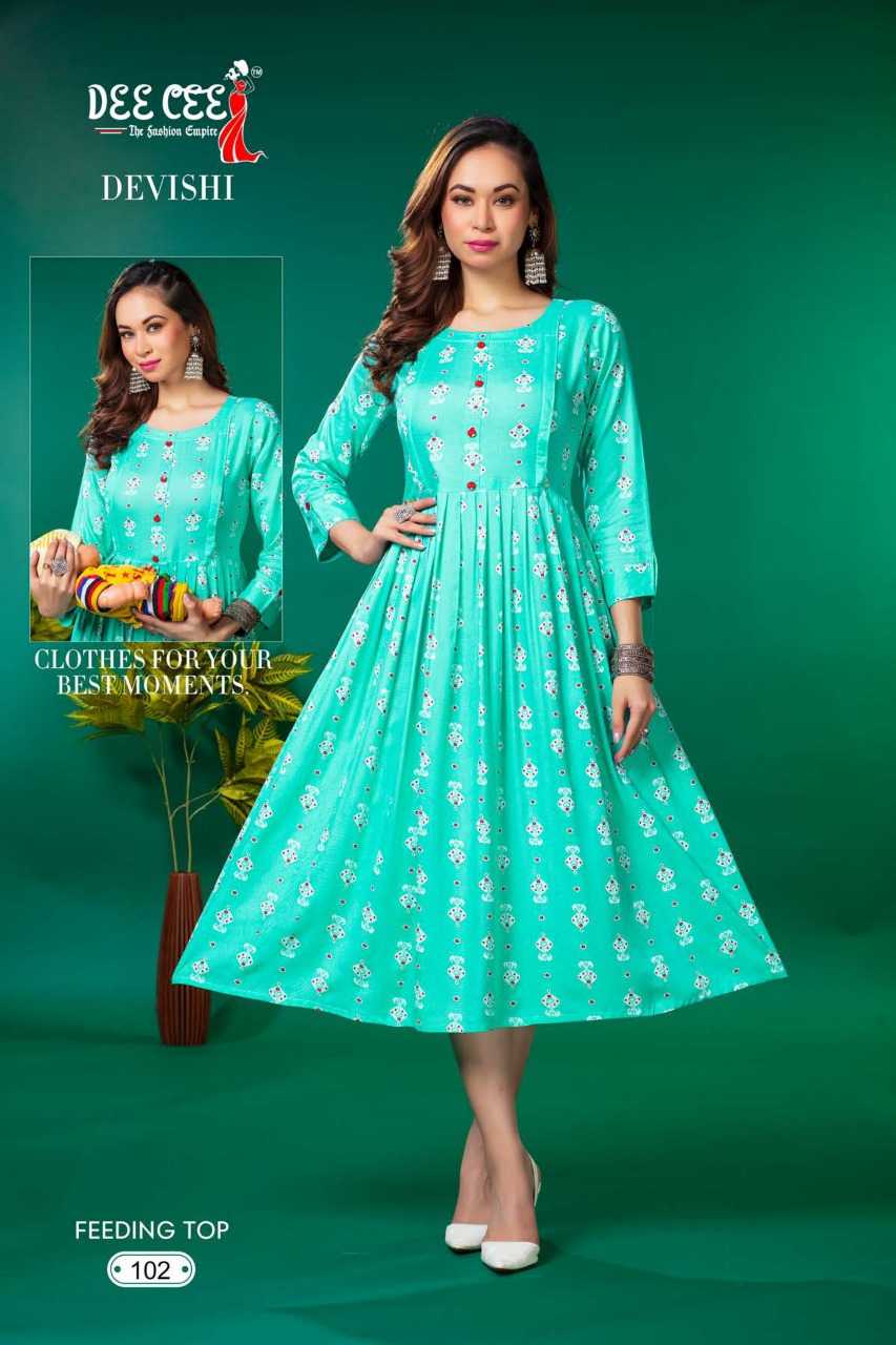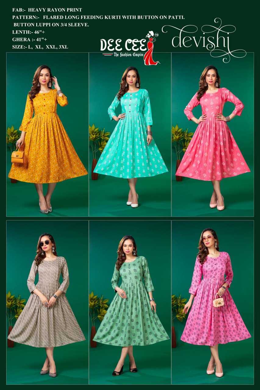 dee cee devishi readymade rayon flair long feeding kurti