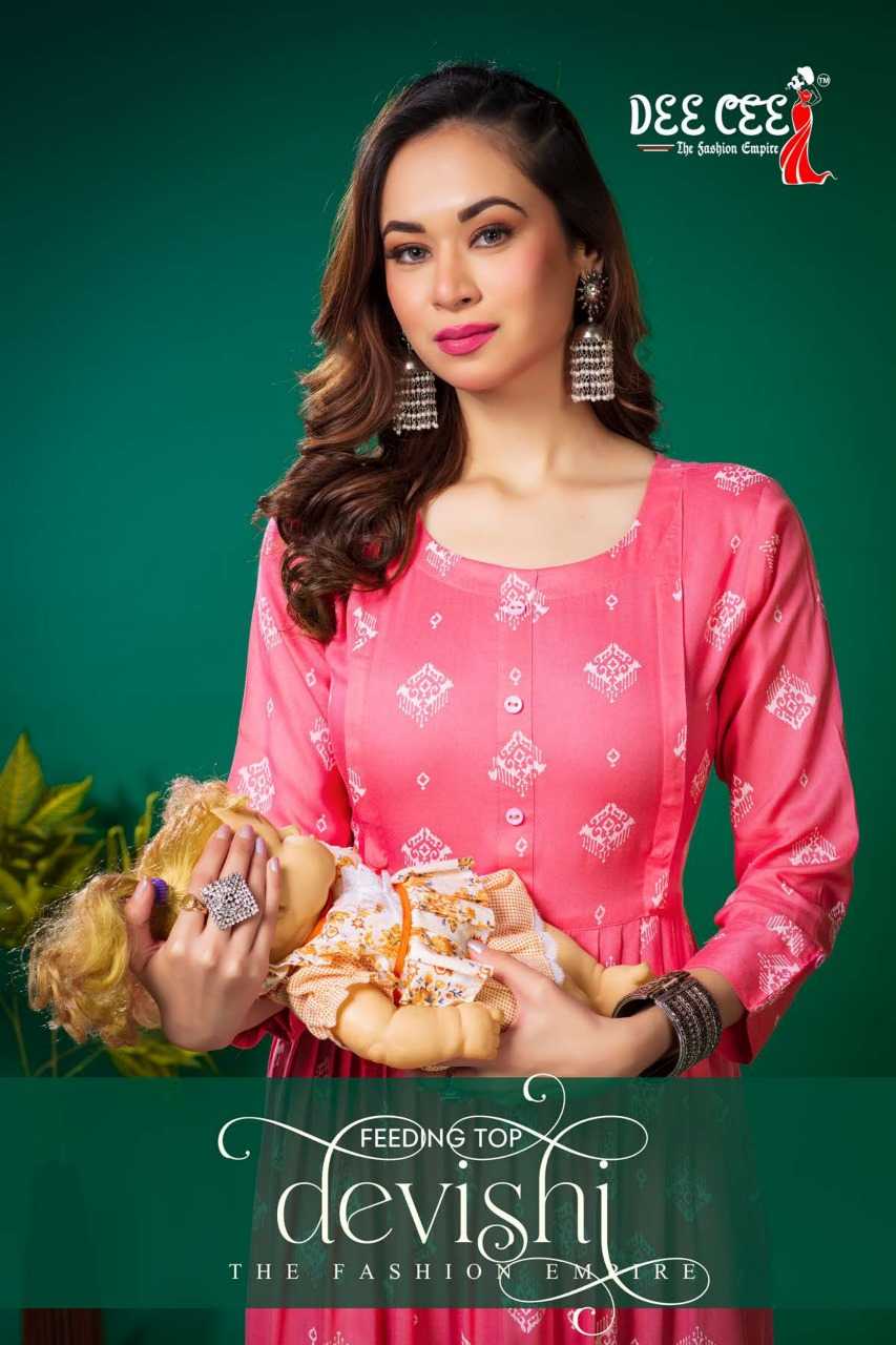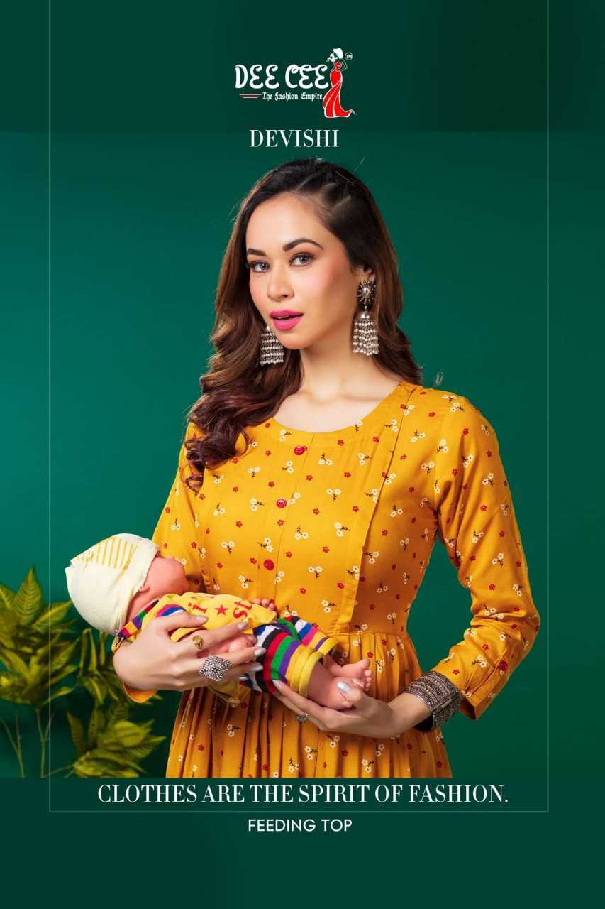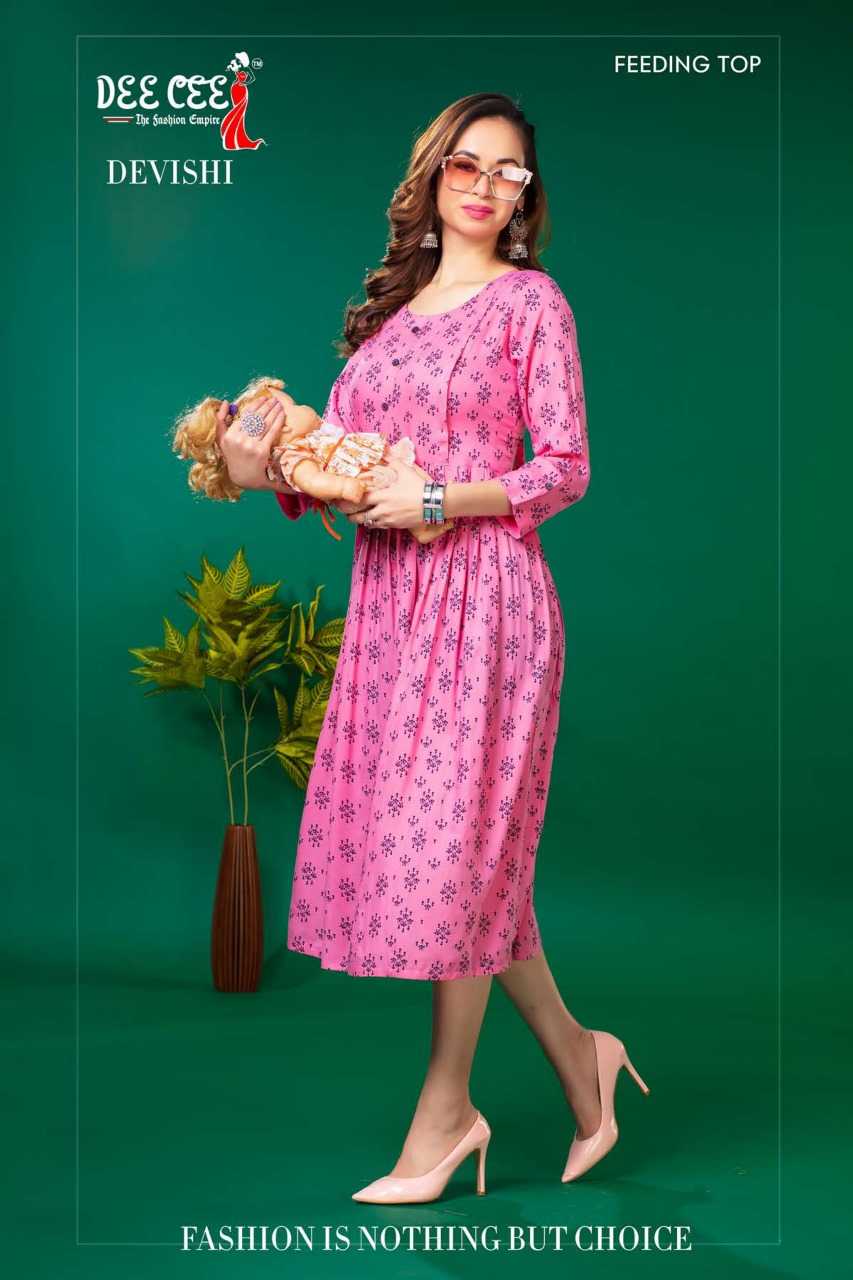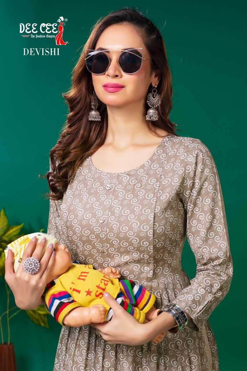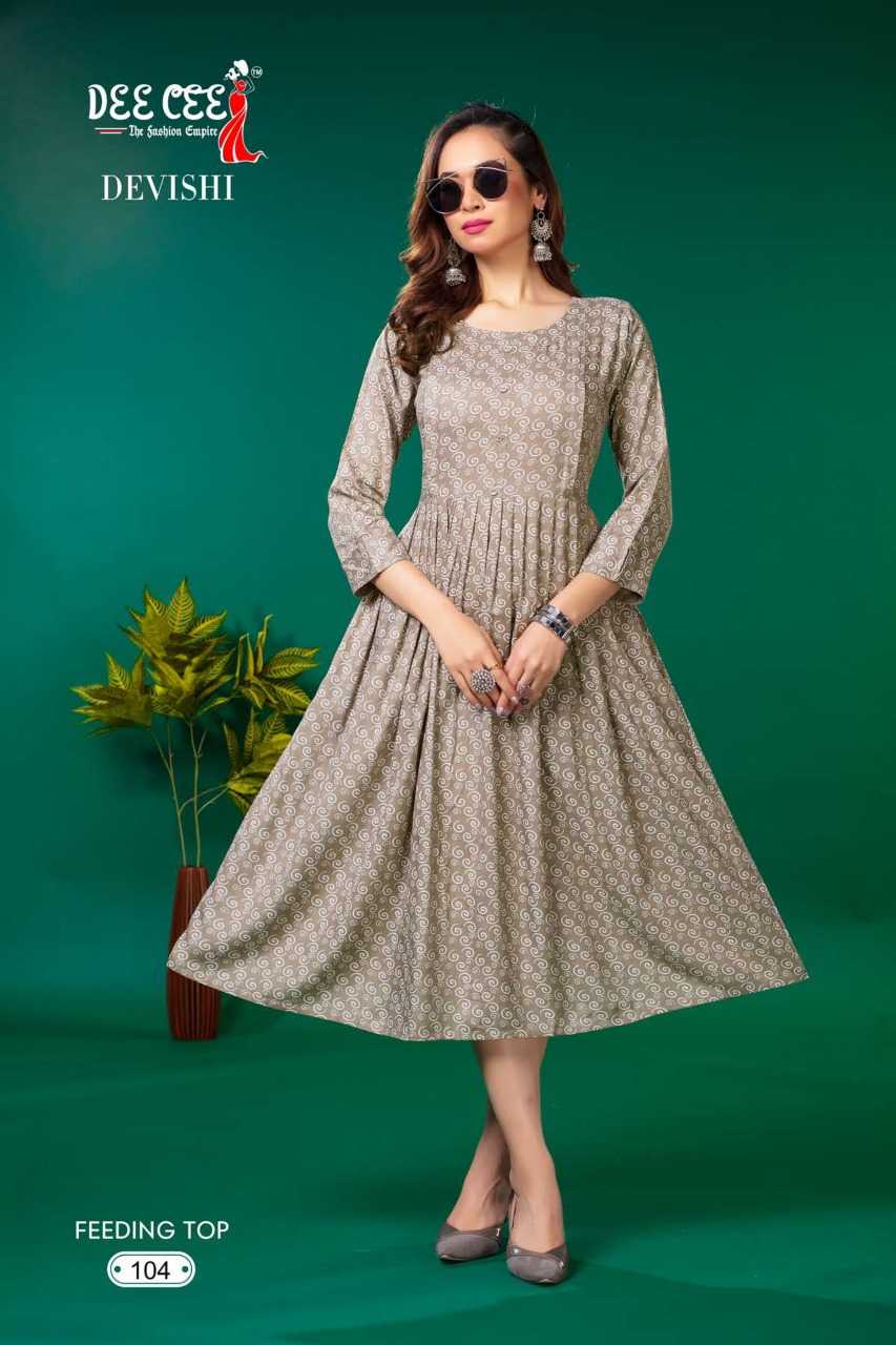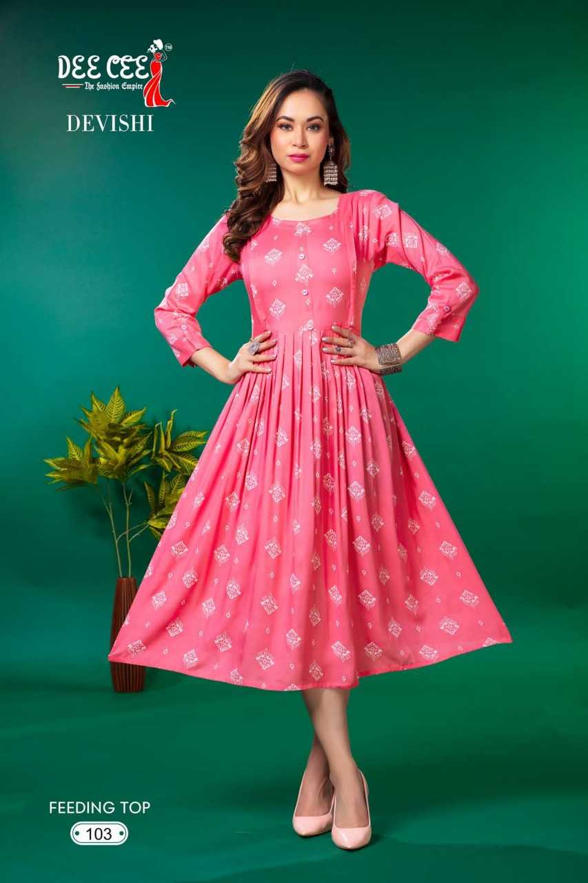 dee cee devishi readymade rayon flair long feeding kurti