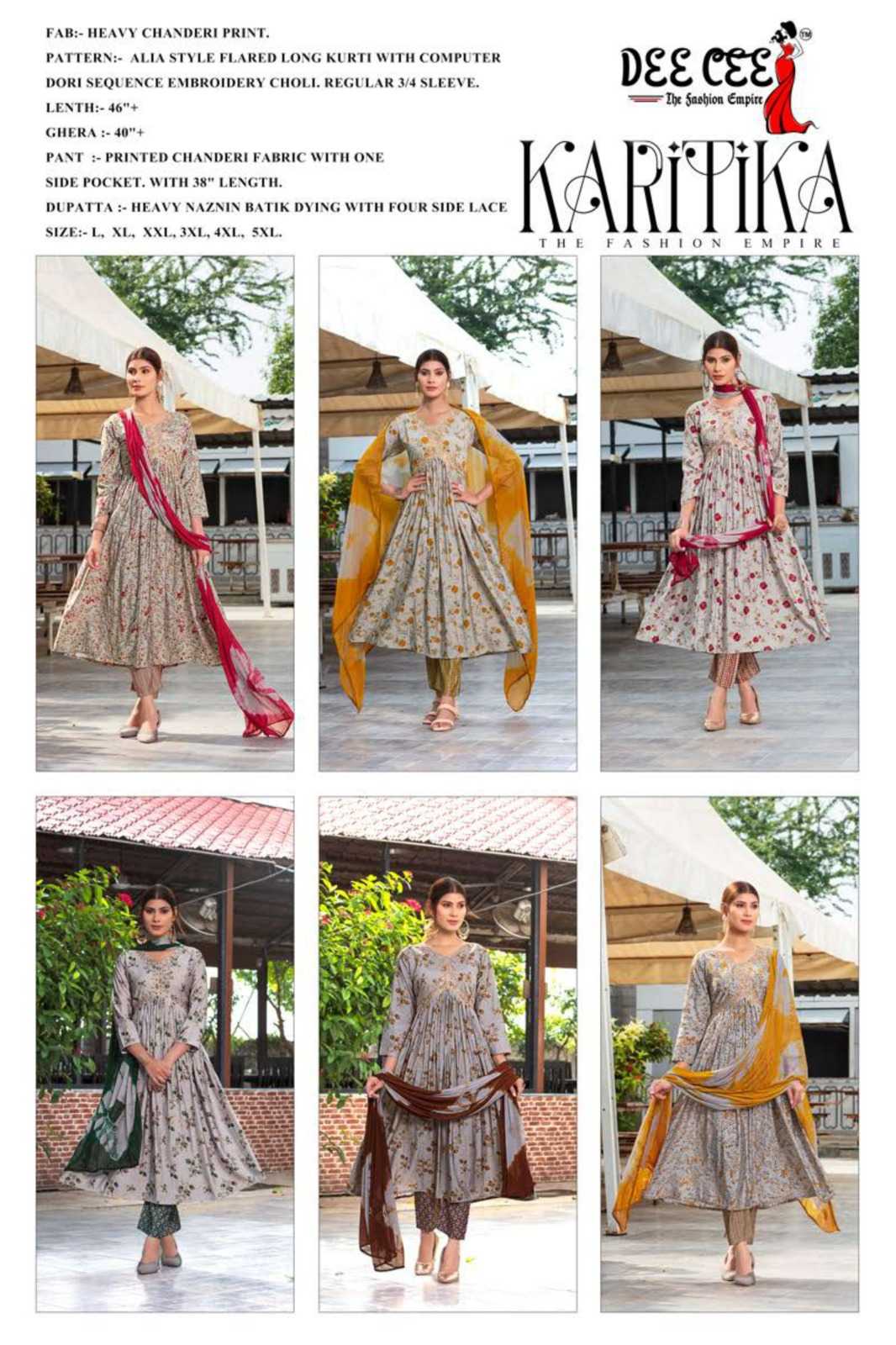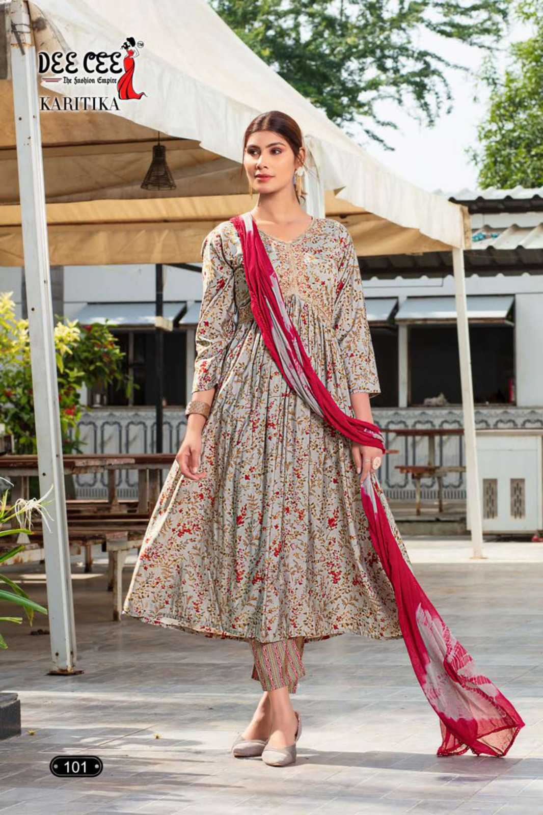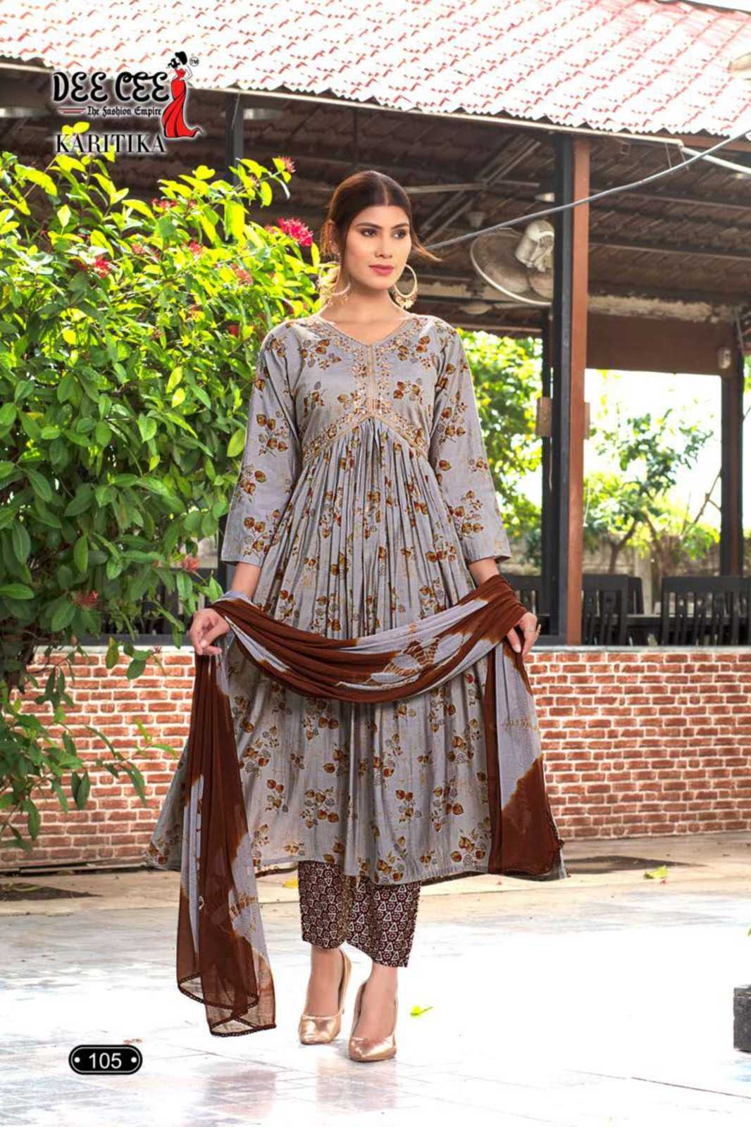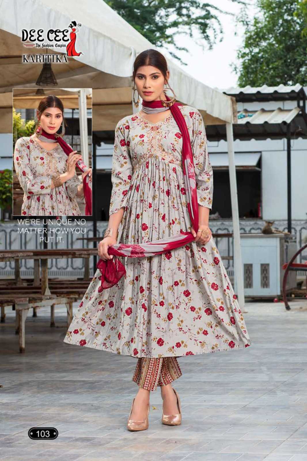 dee cee karitika fancy adorable alia cut flared long kurti with pant and dupatta