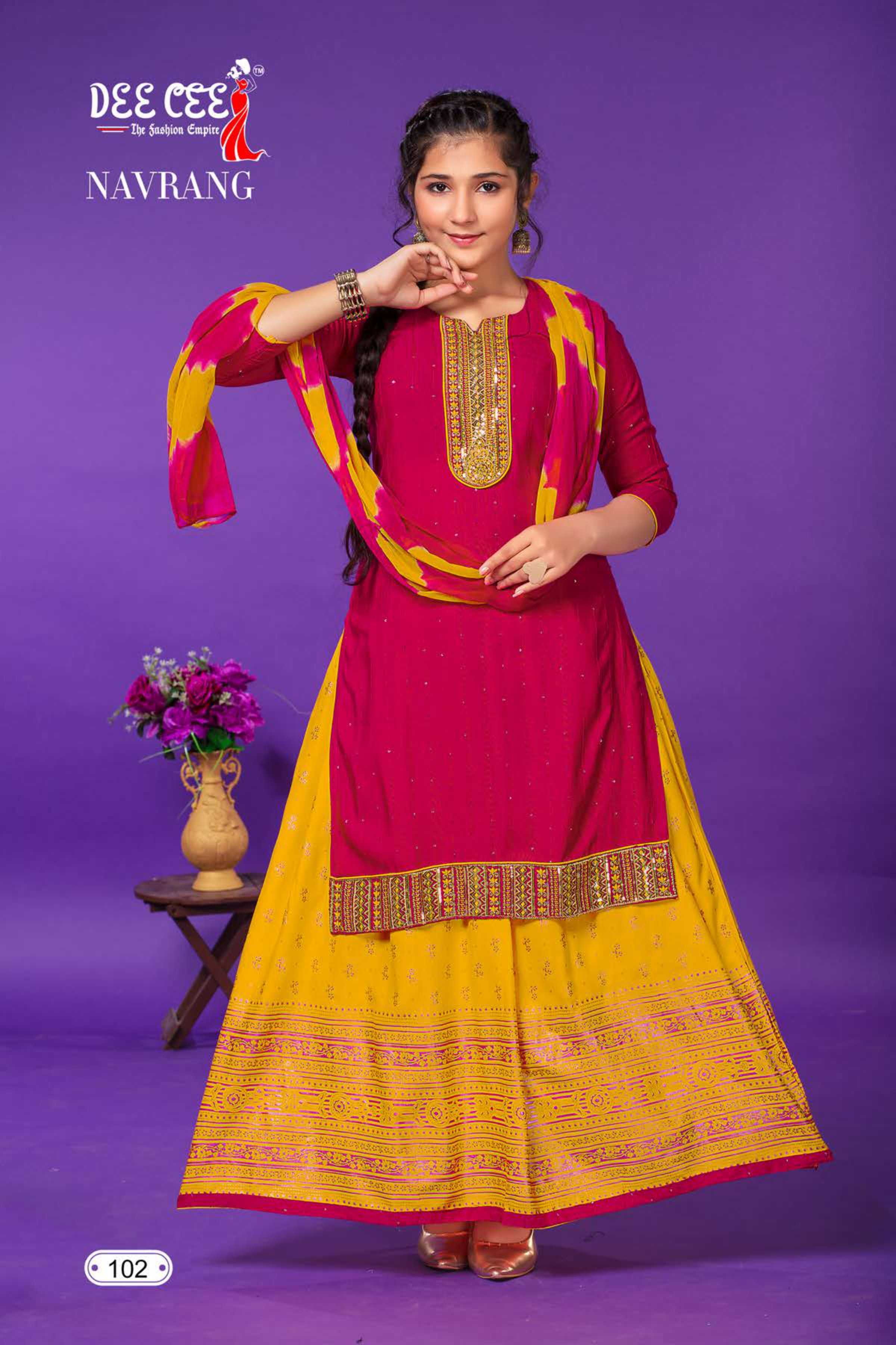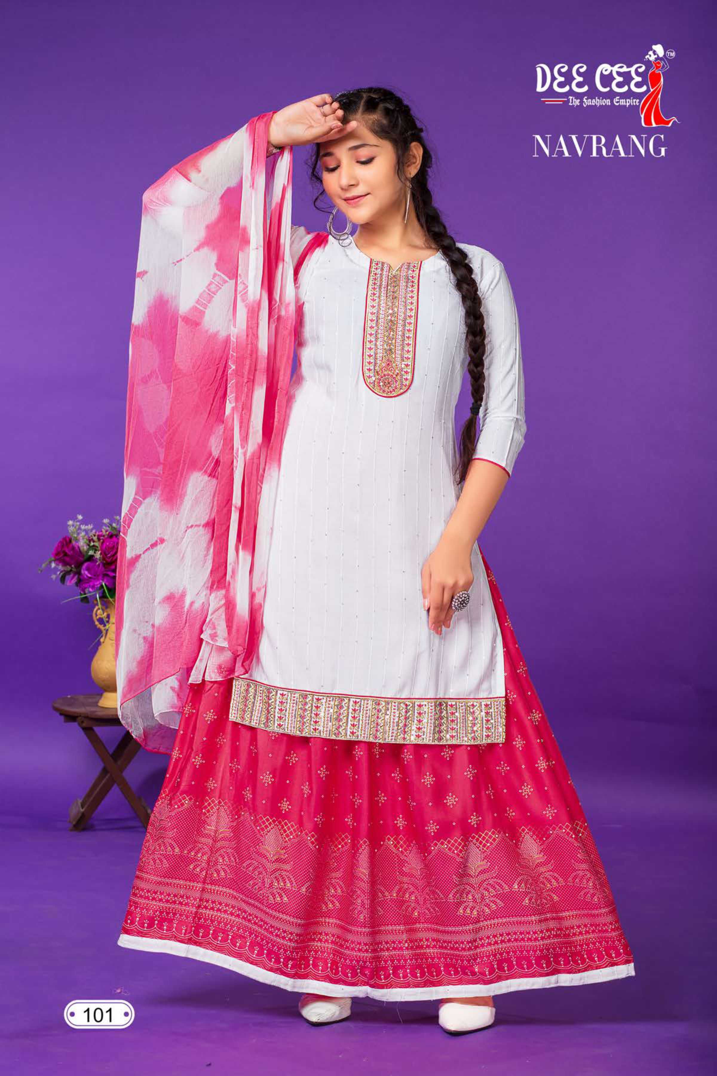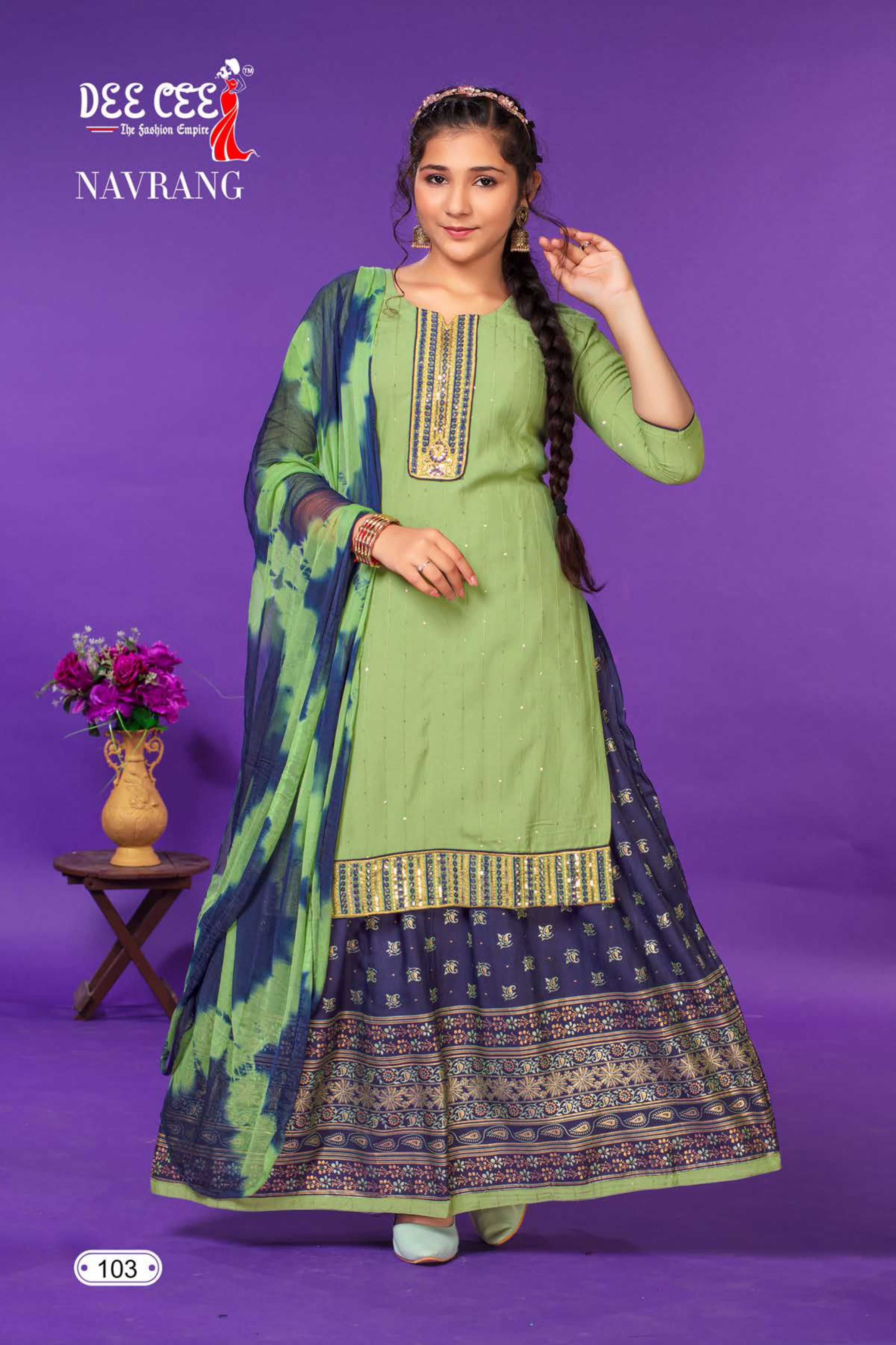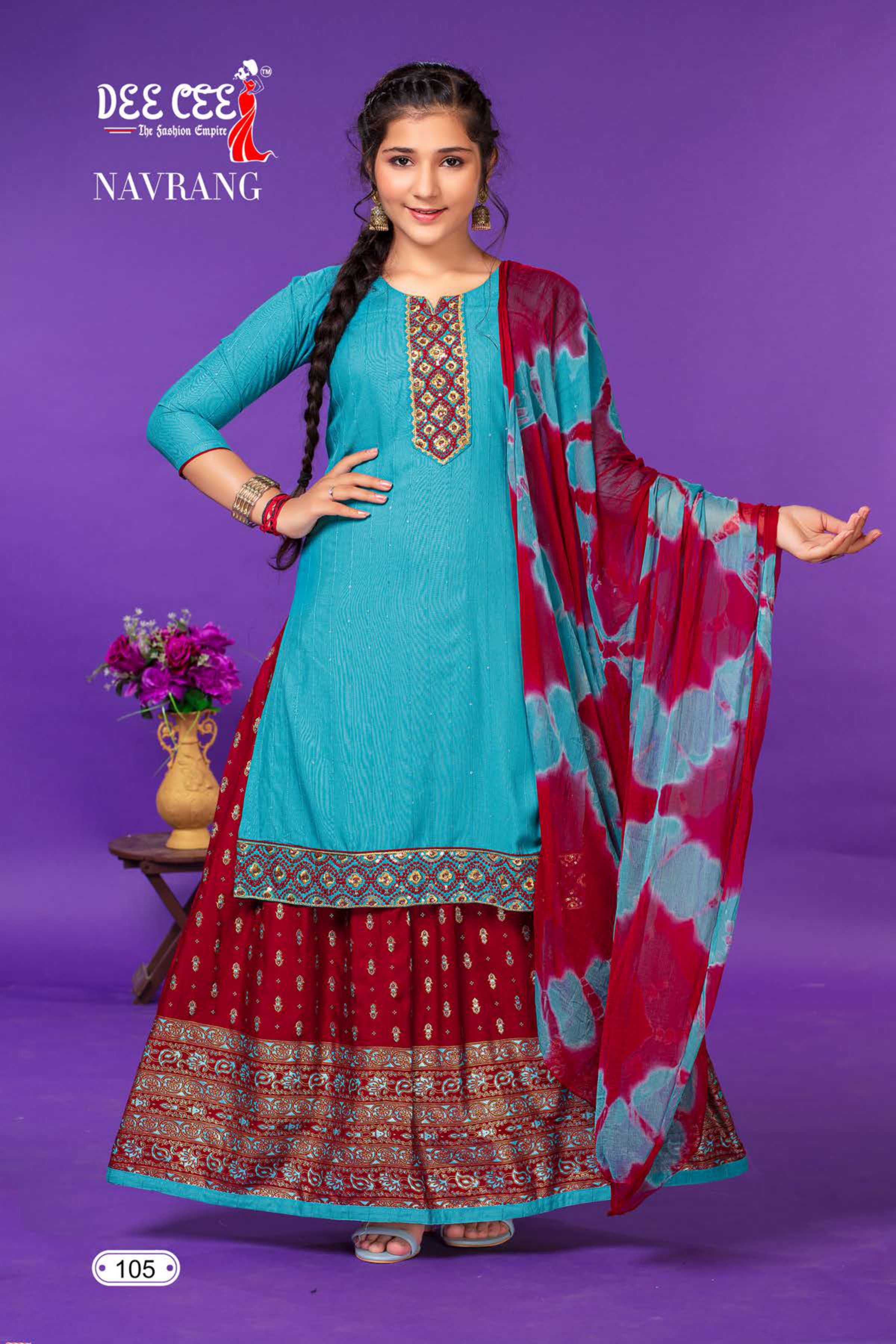 dee cee present navrang readymade kids wear kurti with skirt and dupatta combo set