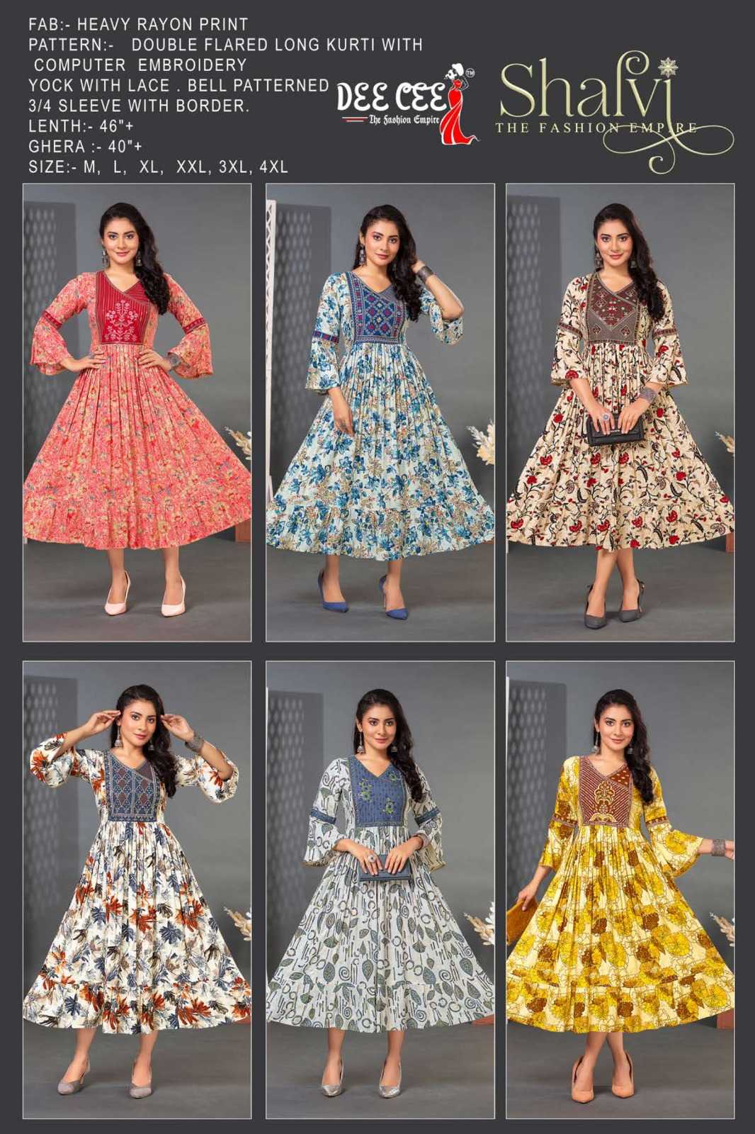 👗 DEECEE 👗 THE FASHION EMPIRE 🔹D. NAME : SHALVI 🔹FABRIC :- HEAVY RIYON 🔹PATTERN:- DOUBLE FLARED LONG KURTI WITH COMPUTER EMBROIDERY SEQUENCE YOCK 🔹 LENGTH:-46”+ 🔹GHERA :- 40”+ 🔹 SIZE :- M TO 4XL 🔹 RATE :-695/- 3XL 4XL 20/- RUPEES EXTRA |