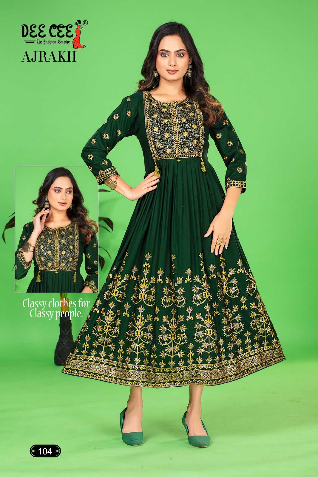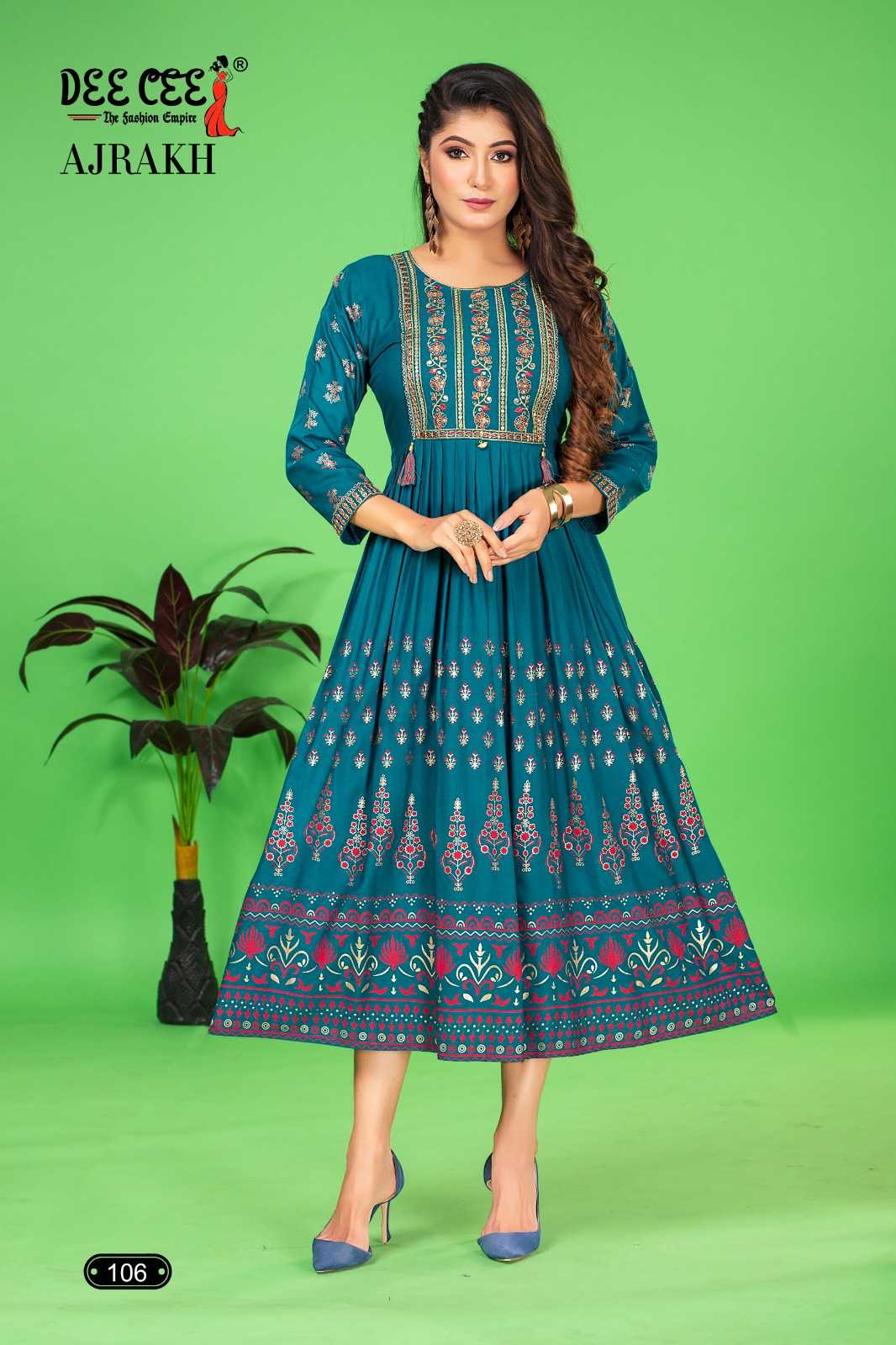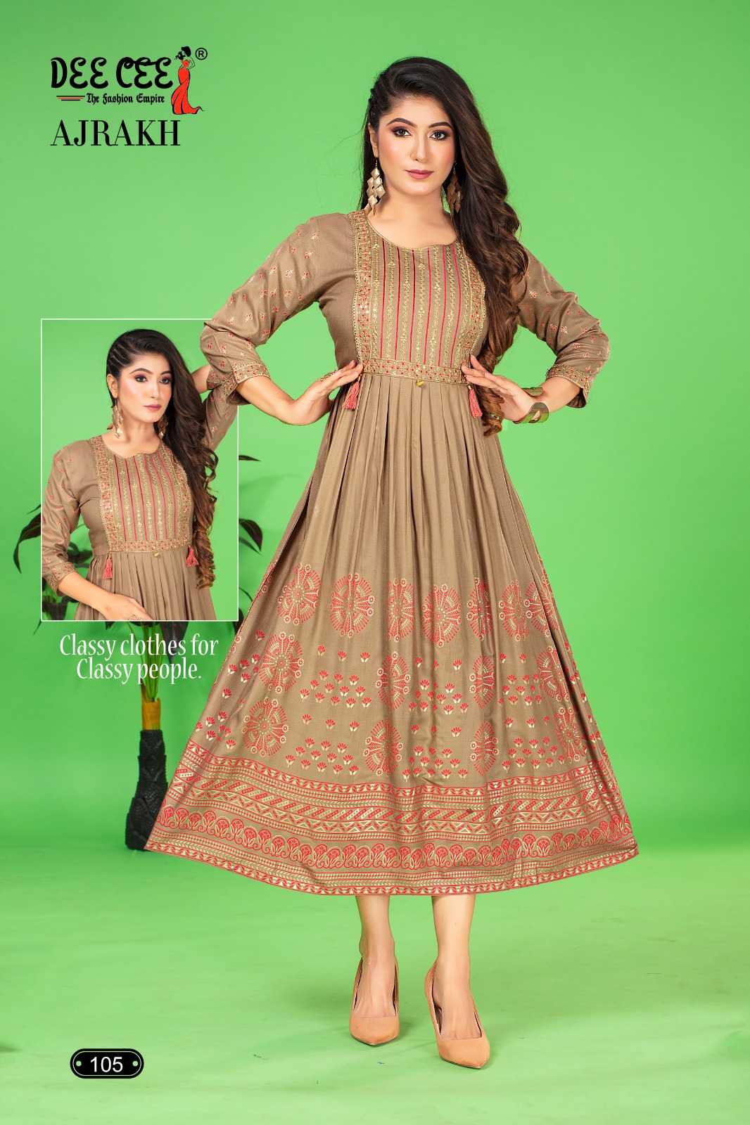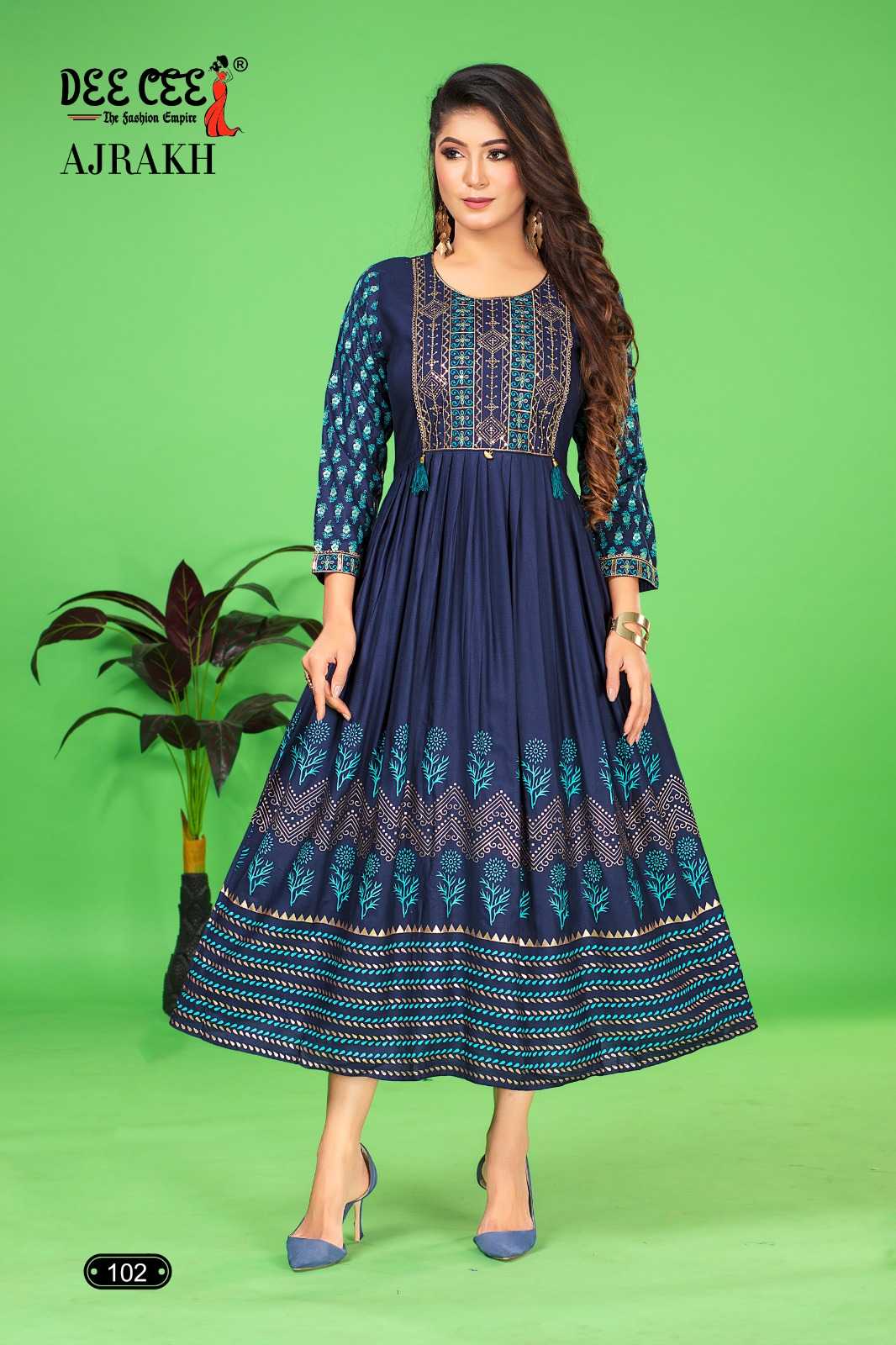 deecee presents ajrakh hit design fully stitch rayon flared long big size gown