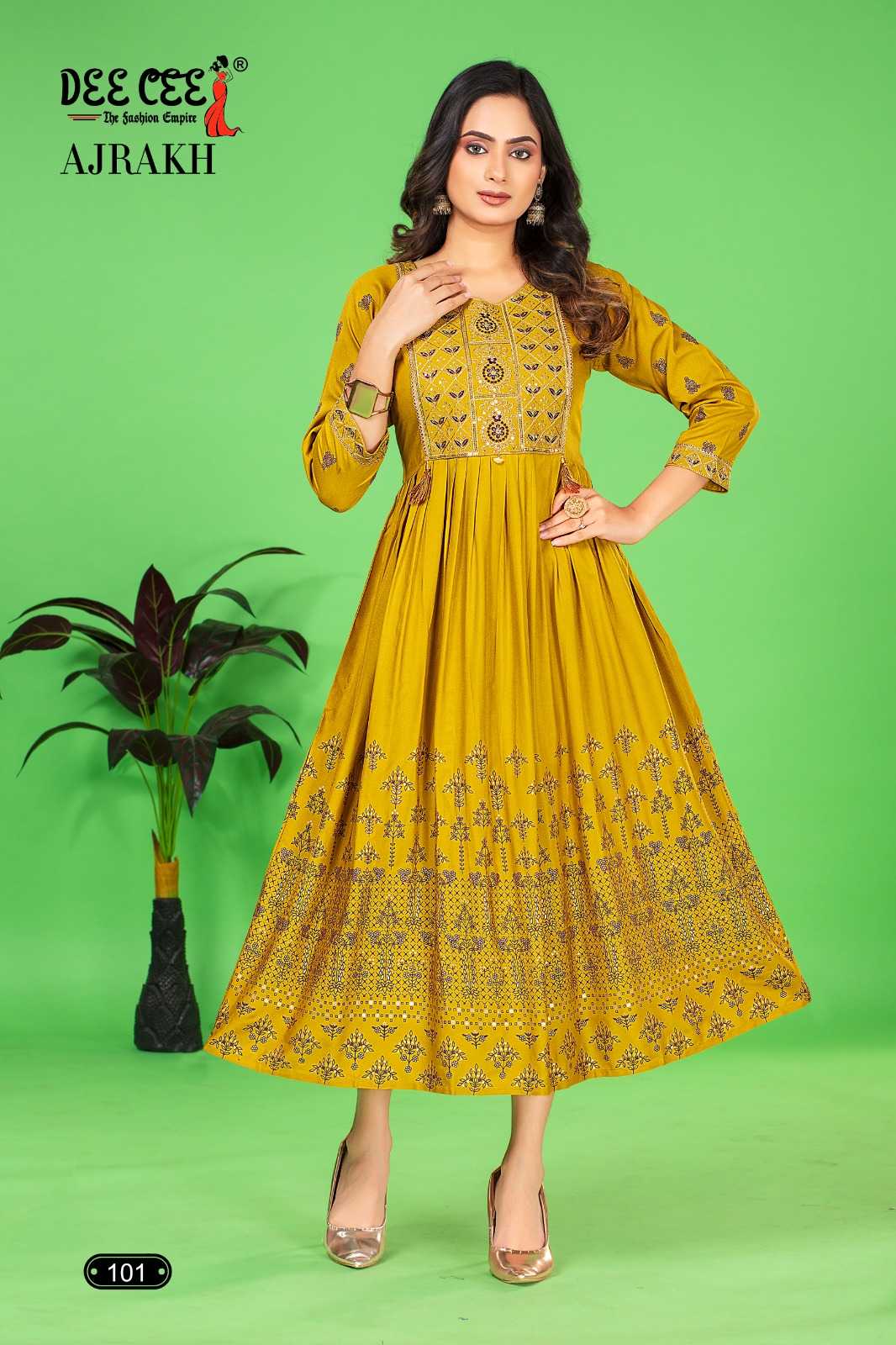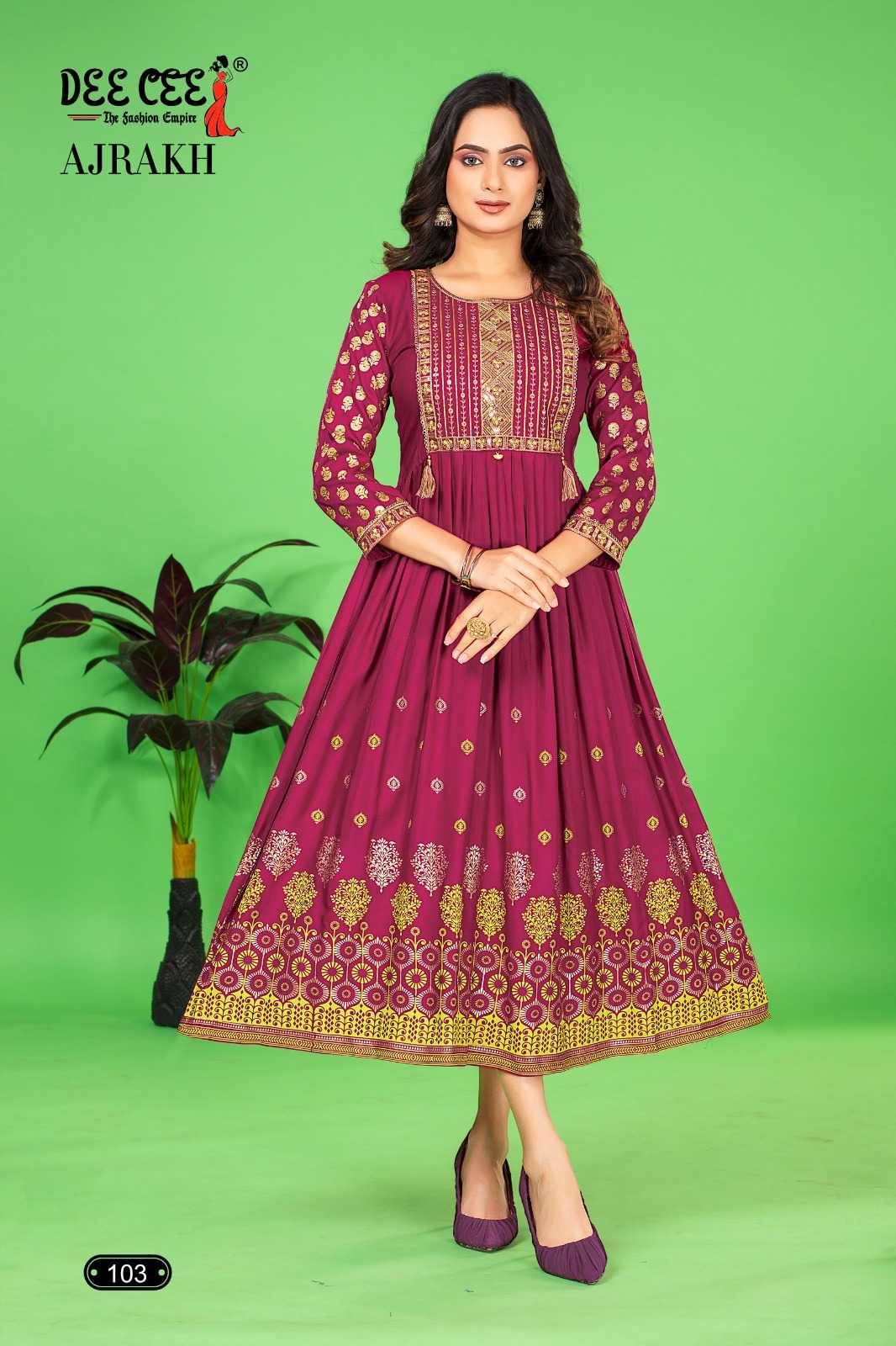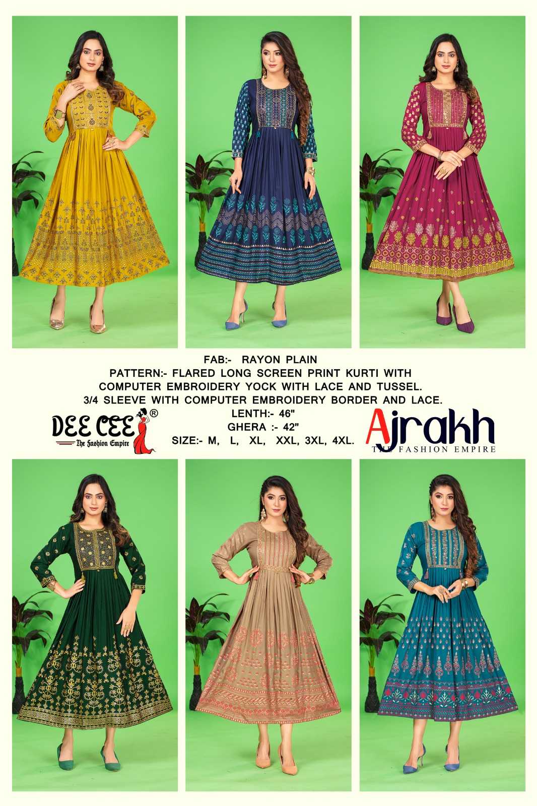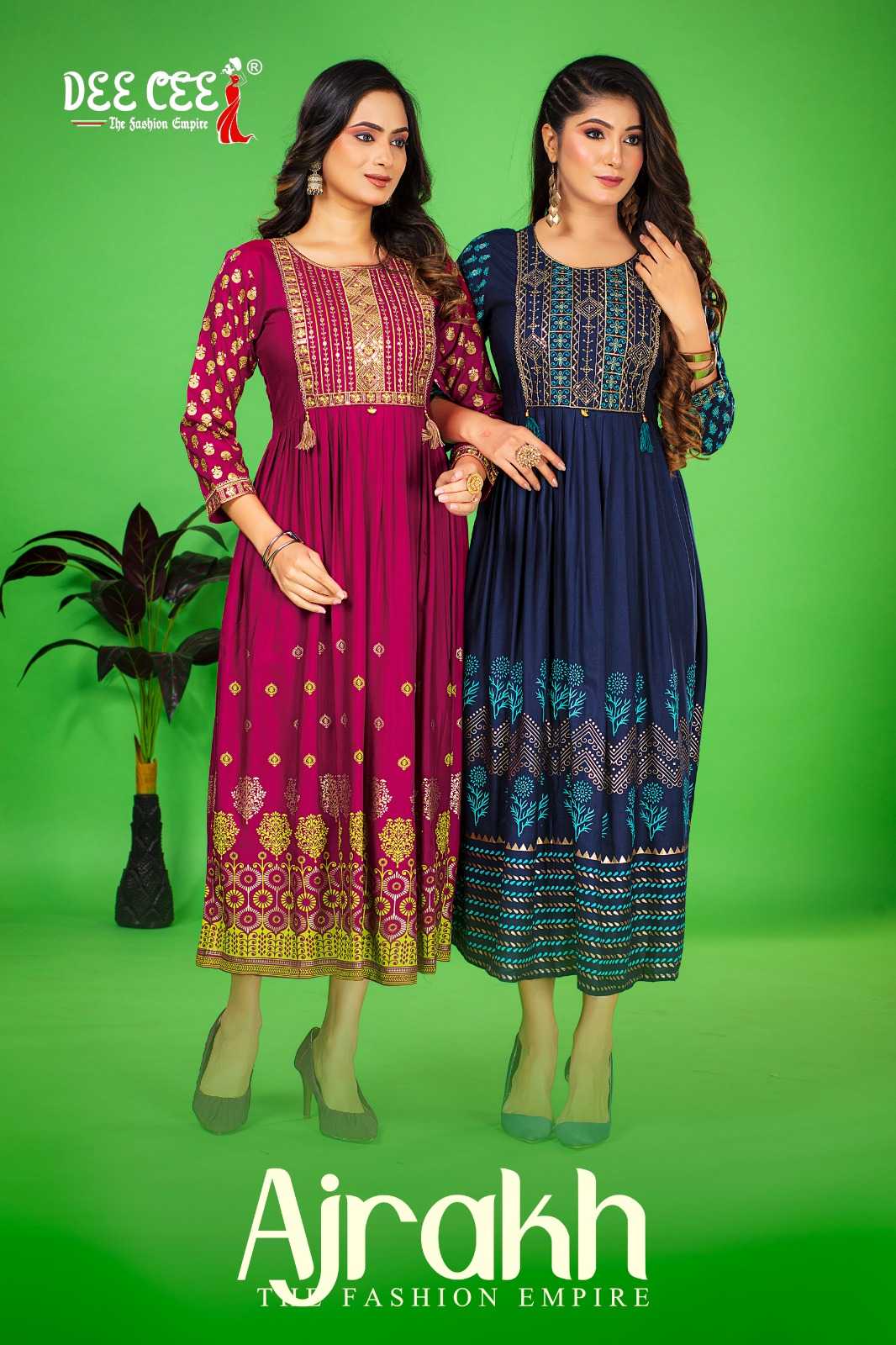 deecee presents ajrakh hit design fully stitch rayon flared long big size gown