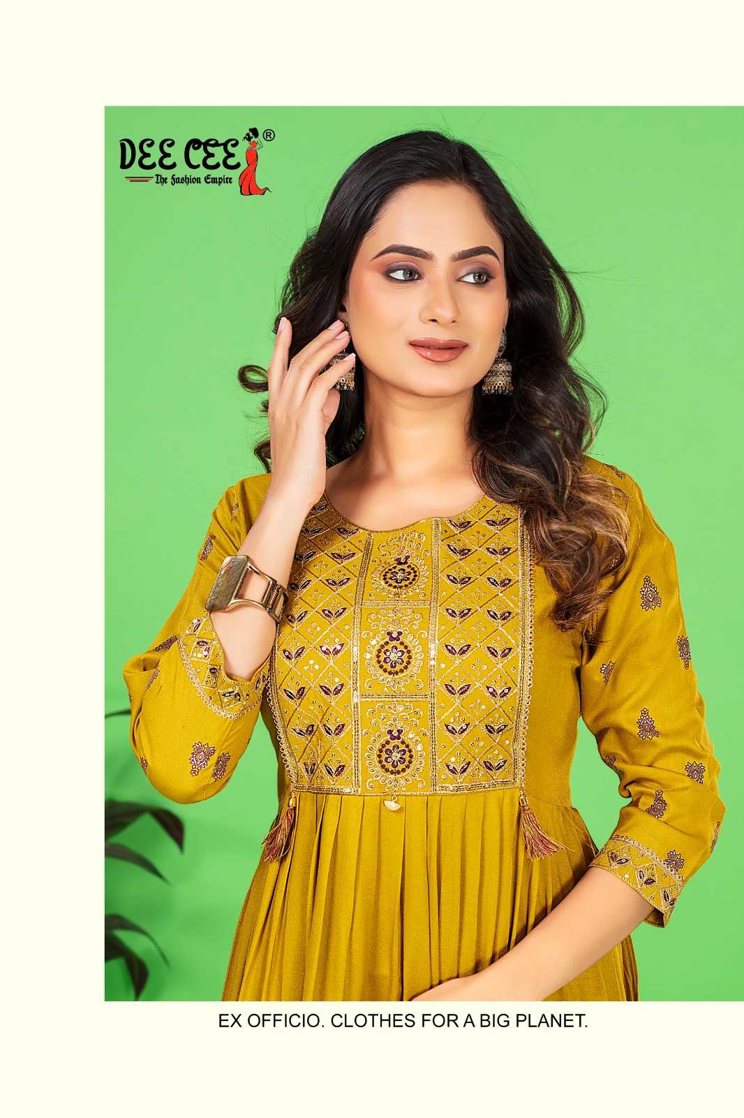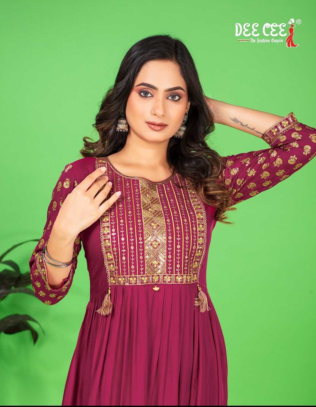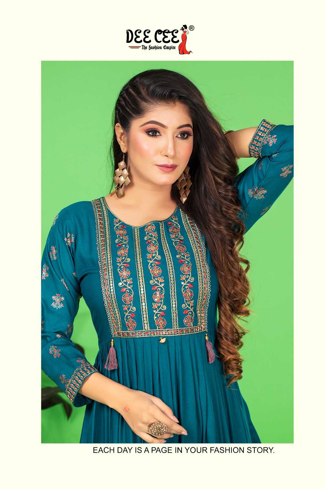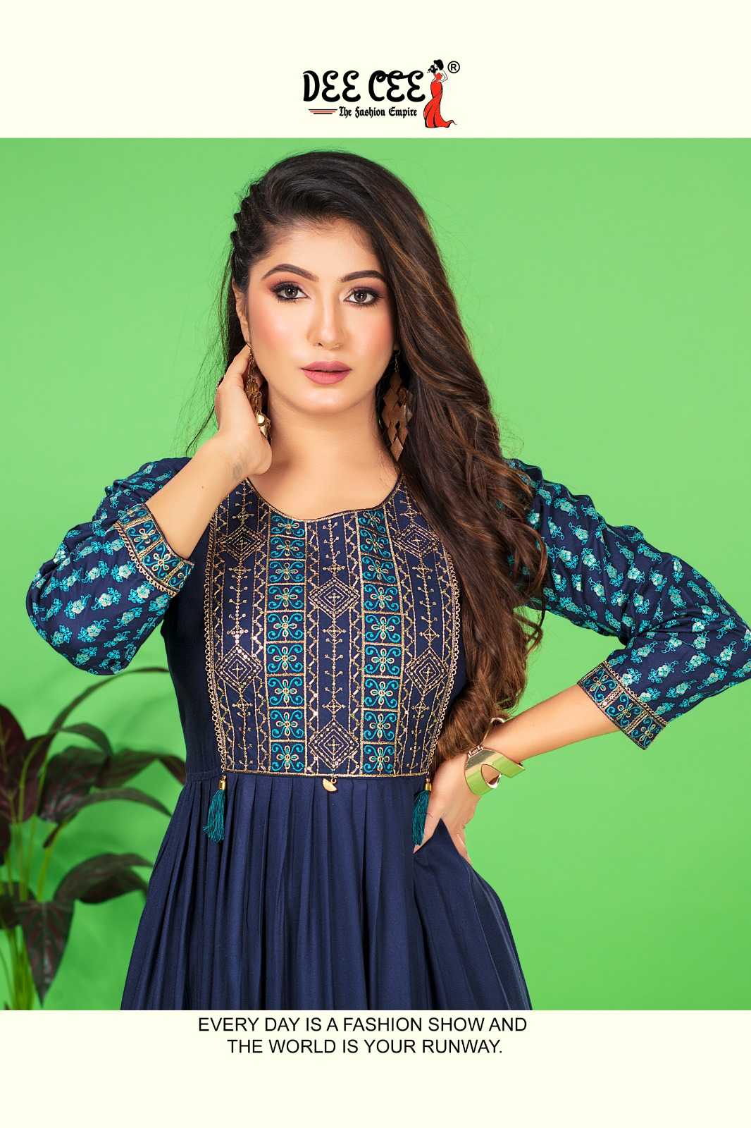 deecee presents ajrakh hit design fully stitch rayon flared long big size gown