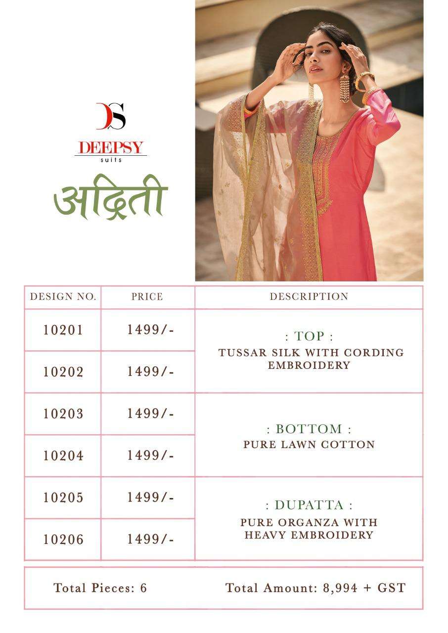 *Adriti by DEEPSY SUITS Top - Tussar silk with codeing work Bot - Pure lawn cotton Dup - Pure organza with embroidery *Rate - 1499+GST |