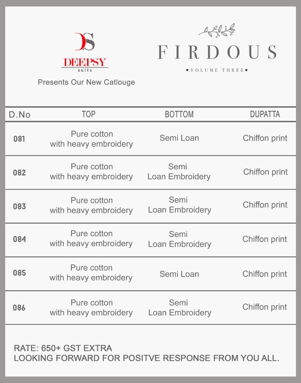 Deepsy Firdous Vol 3 Pure Cotton Pakistani Suit Collection