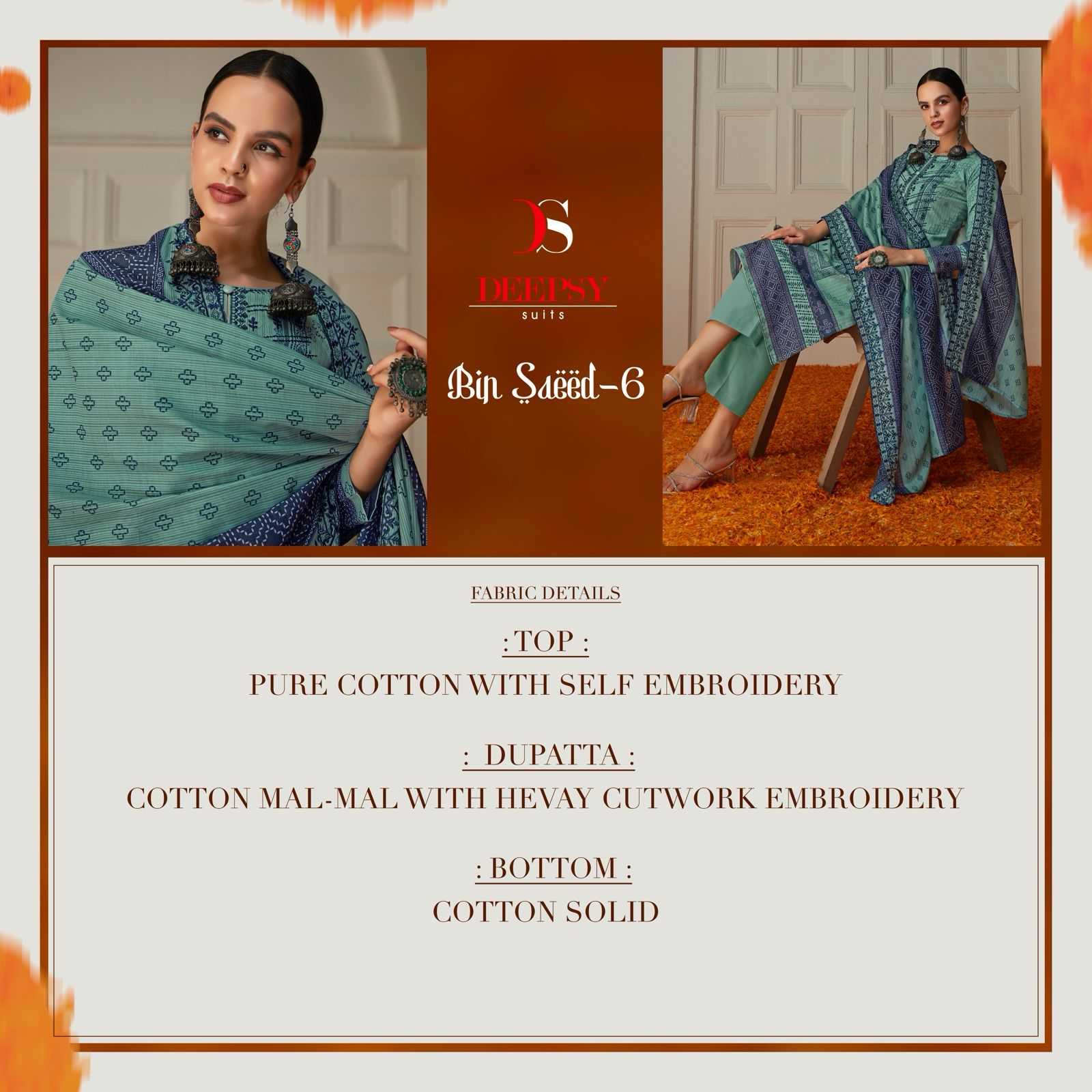 BIN SAEED-6 by DEEPSY SUITS Top -Pure cotton with heavy self embroidery Bot - cotton solid Dup - Cotton print with heavy cutwork embroidery Pcs: 8 *Rate - 999+Gst Splendid Quality With Digitally Printed Fabric Quilted Fabric Used For best quality results |
