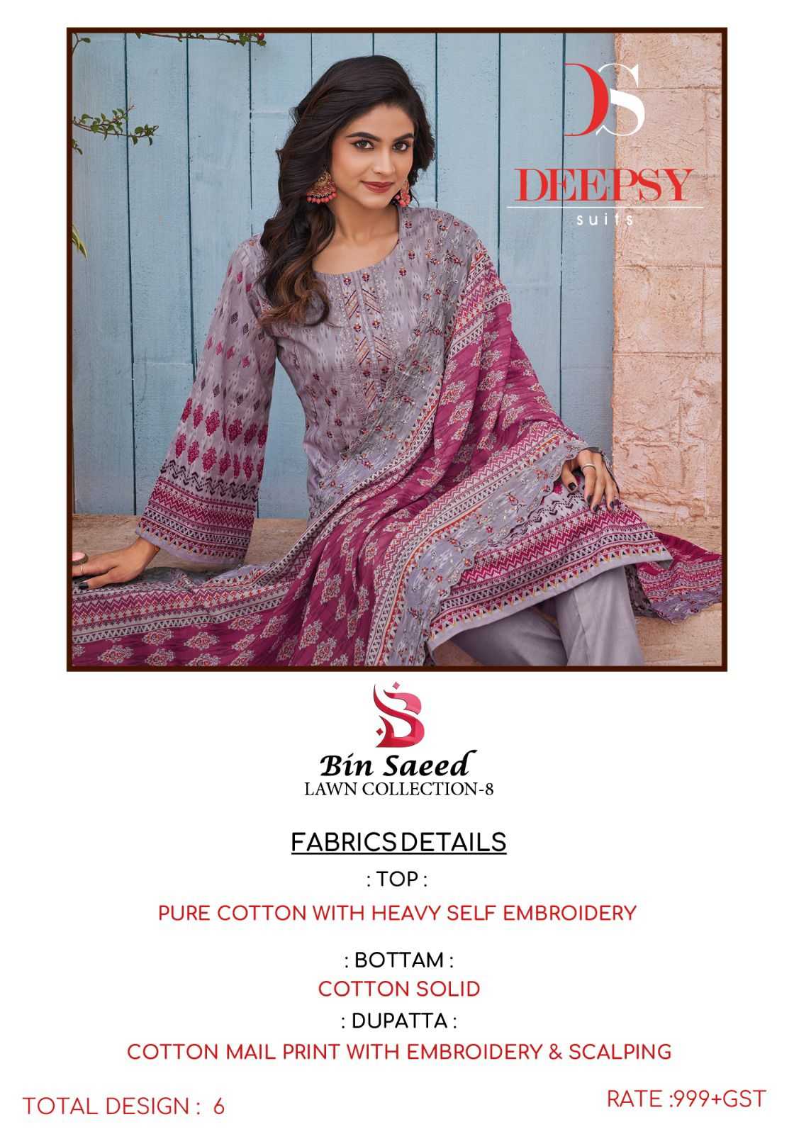BIN SAEED-8 by DEEPSY SUITS Top -Pure cotton with heavy self embroidery Bot - cotton solid Dup - Cotton print with heavy cutwork embroidery Pcs: 6 *Rate - 999+Gst Splendid Quality With Digitally Printed Fabric Quilted Fabric Used For best quality results |