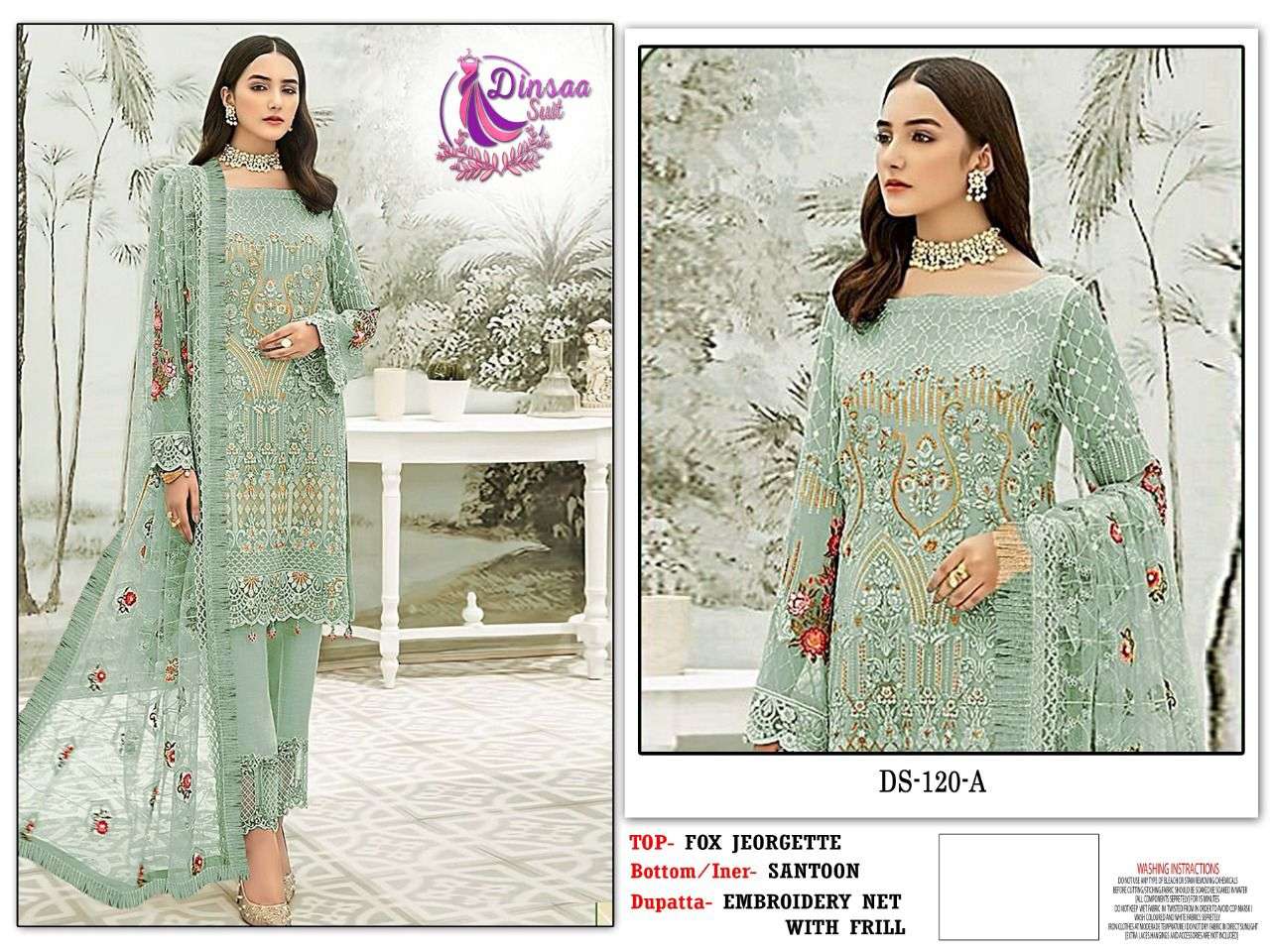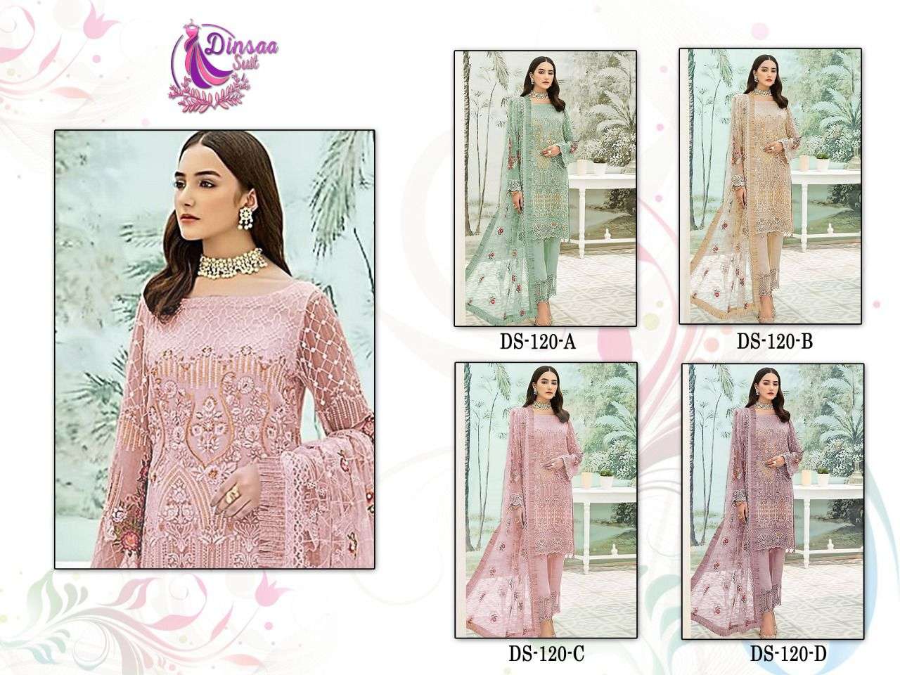BRAND NAME:-DINSAA SUIT D NO:- D-120( A, B, C, D) Top:- EMBROIDERED FAUX GEORGETTE RATE:-1199/- per pcs |