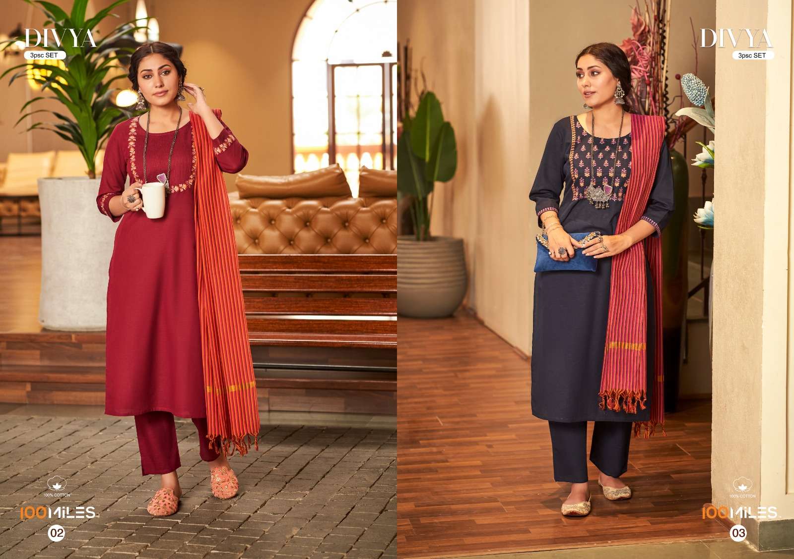 Catalog : DIVYA Style : Kurti + Pant + Dupatta 3 Psc Readymade set TYPE : Pure cotton slub fabric top and bottom with fancy embroidery and pure cotton customized patterned dupatta. SIZES : M to 3XL |