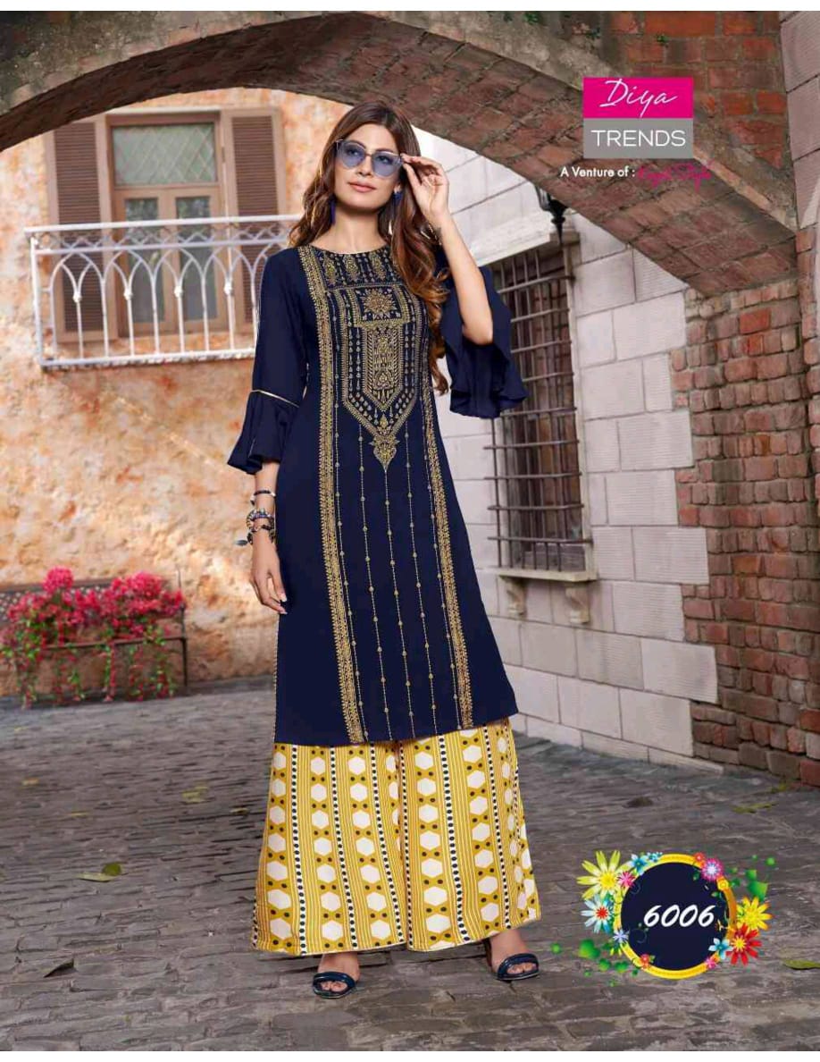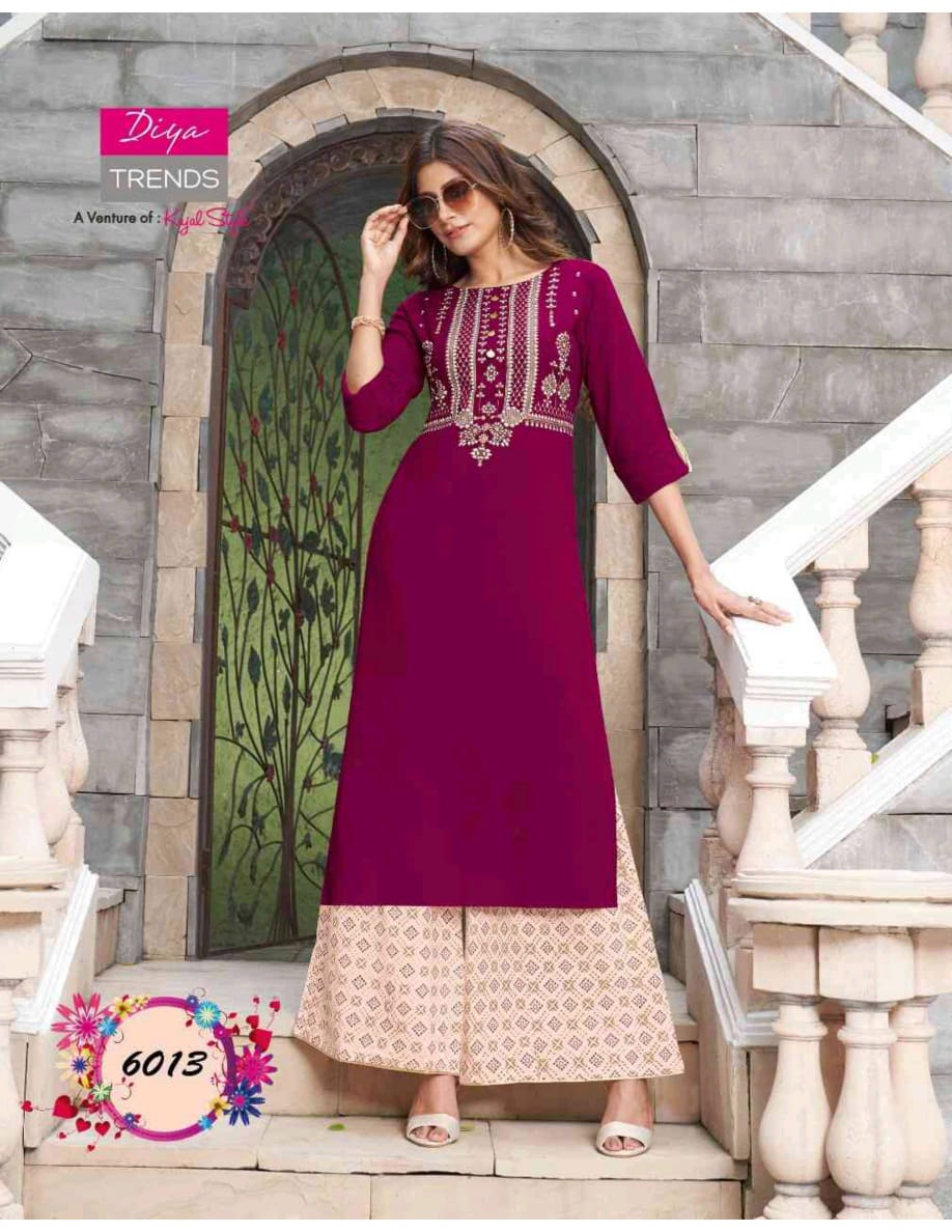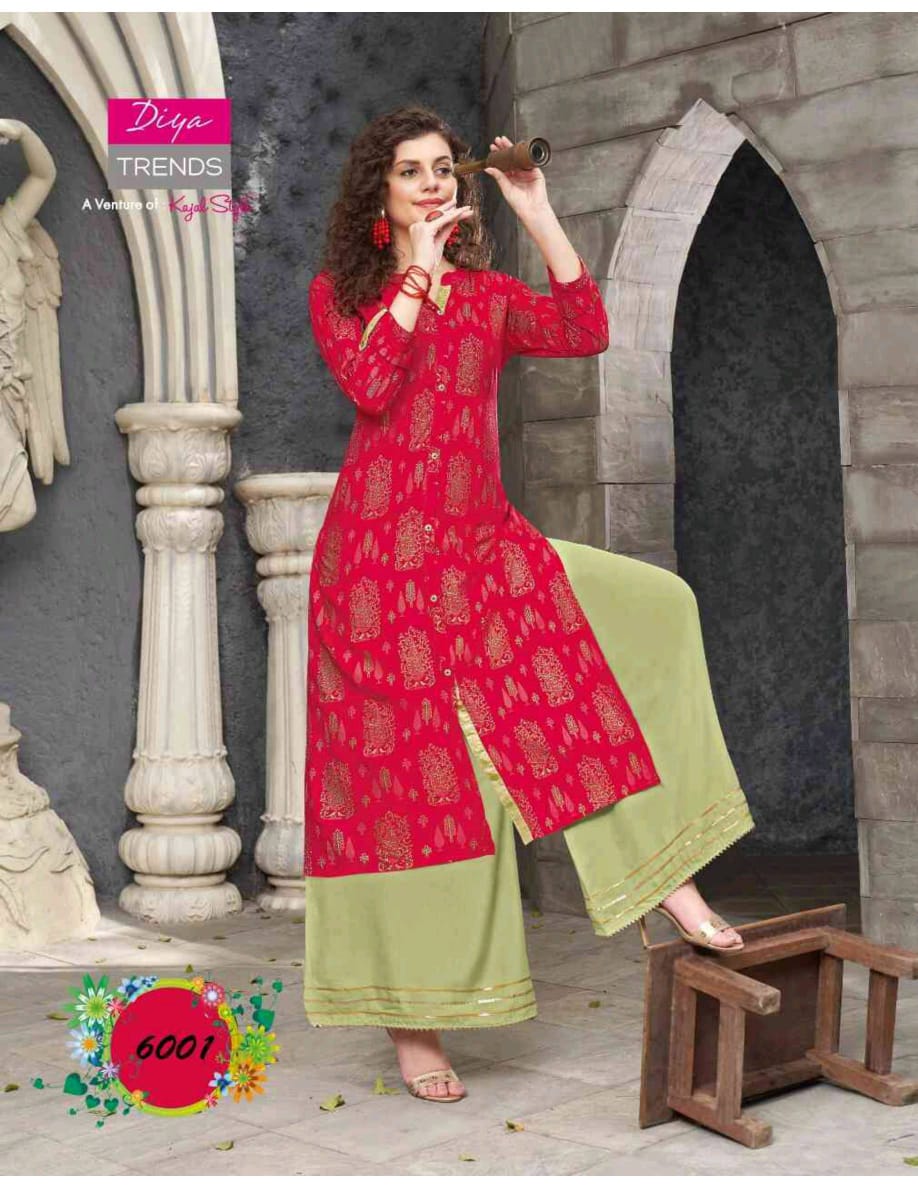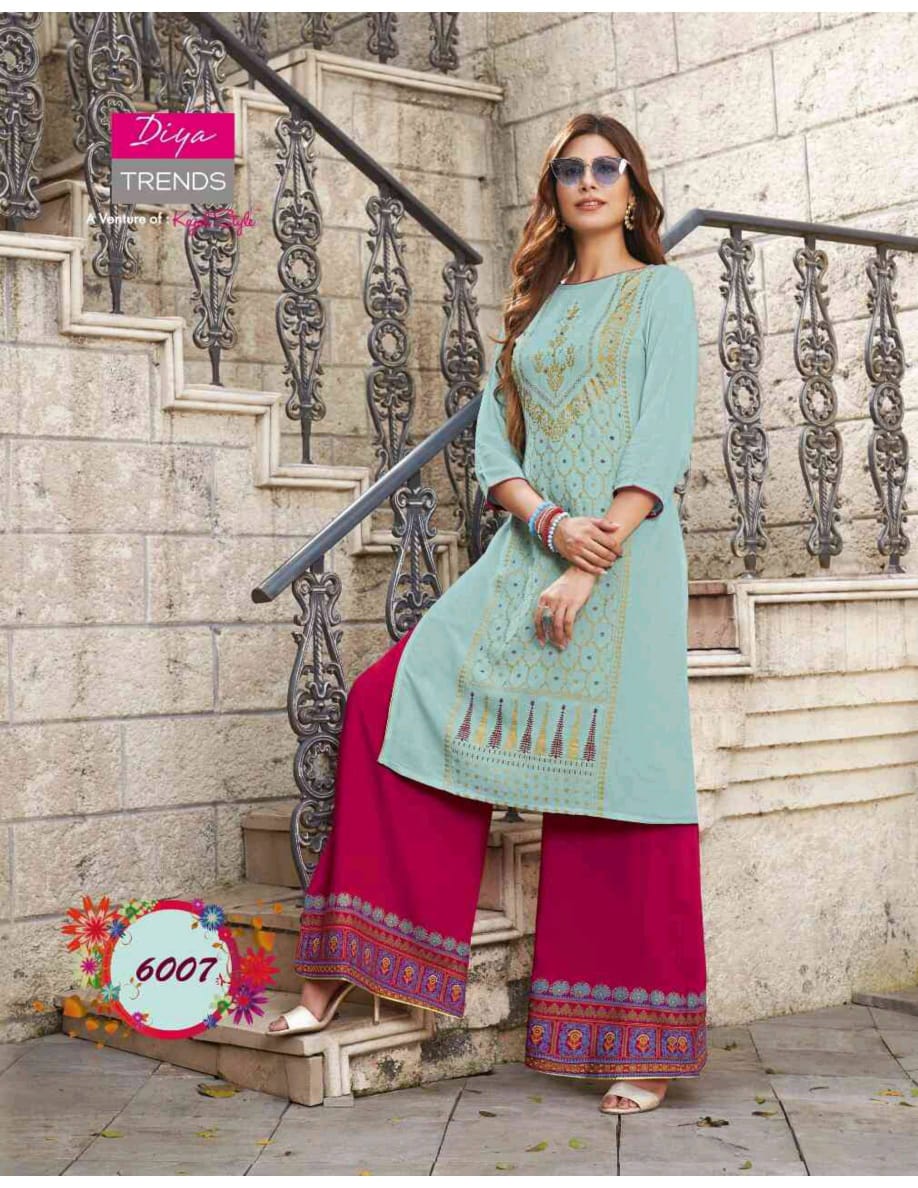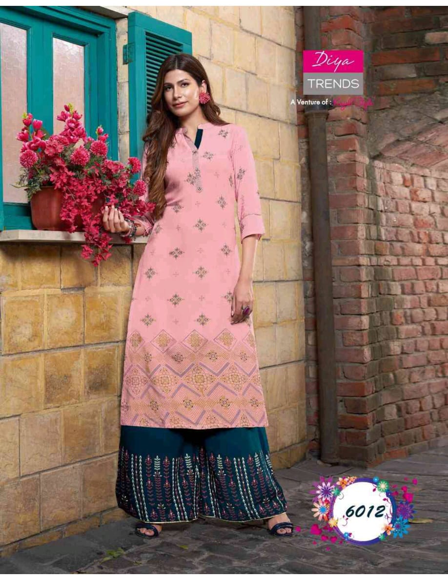 Diya Trends Bibas Vol 6 Rayon Classy Prints Kurti With Plazzo And Pant Pair Wear Daily