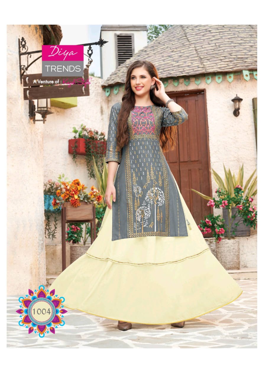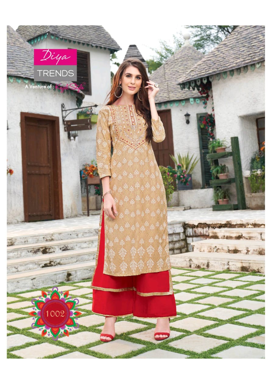 Diya Trends Fashion Era Vol 1 Rayon Print Kurti With Plazzo Sharara And Skirt Collection