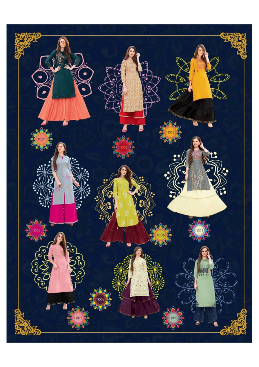 (A Venture of KAJAL STYLE) Catalogue name: FASHION ERA Vol.1 ✨Details 🧥Pattern: KURTI WITH PLAZO, SHARARA & SKIRT PAIR 👗Fabrics - Reyon print Fancy Embroidery Work Cotton Classy Prints 🎗Size - XS(17)S(18)M(19) L(20) XL(22) XXL(23) 3xl(24)4xl(25)5xl(26) 🌈 Length --> 46 to 48📐 ☣Designs- 9Pcs Rate - 6️⃣5️⃣5️⃣/-₹ |
