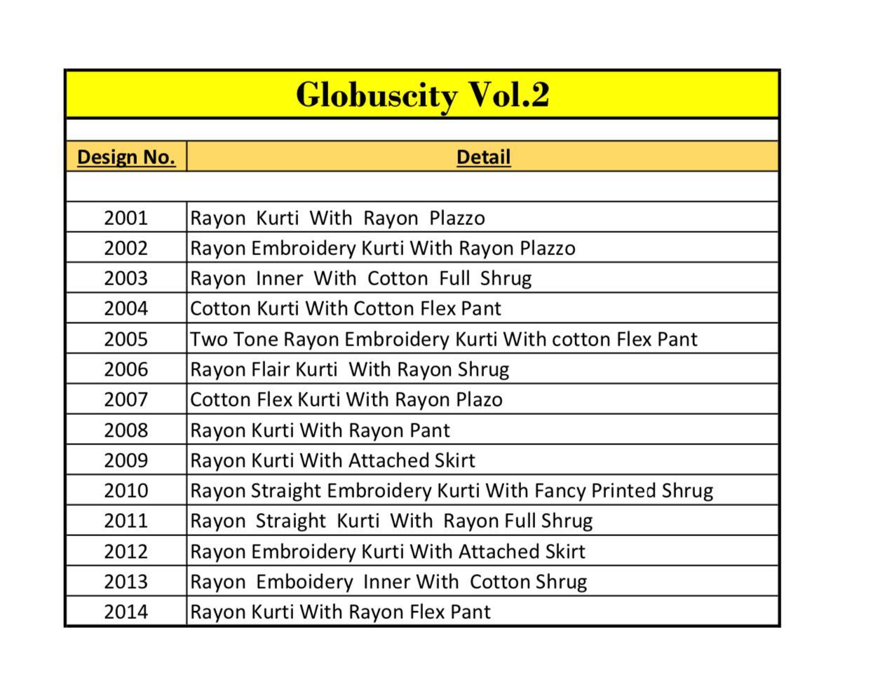 FANCY KURTI WITH Shrug , Plazzo & Pant Pair At Affordable Price âÂÂDIYA TRENDSâ (A Venture of KAJAL STYLE) Catalogue name: GLOBUS CITY Vol-2 (2 pieces catalouge) â¨Details Pattern: Kurti With Shrug , Plazzo & Pant. Pair Fabrics - Rayon , Cotton , Flex Size - M(19) L(20) XL(22) XXL(23) 3xl(24) àLengthà--> 46 to 48 â£Designs- 14pcs |