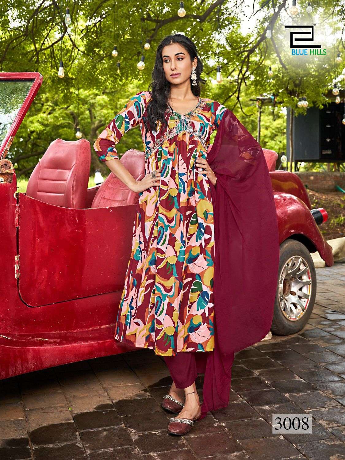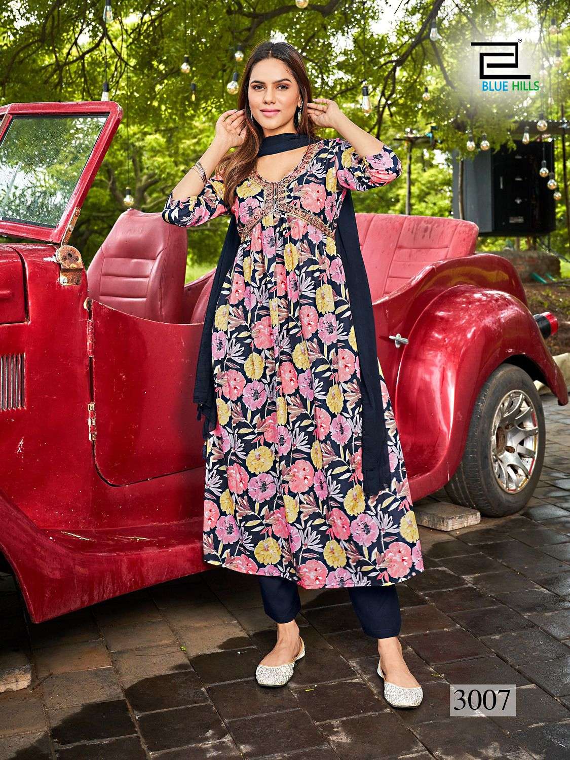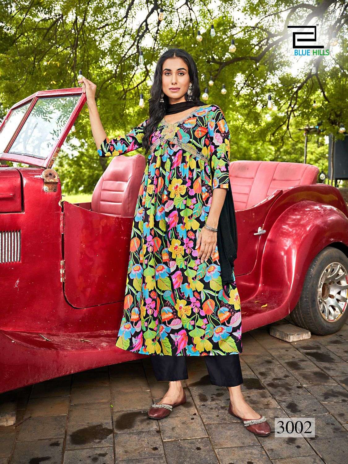 BLUE HILLS Top-: Poly Rayon digital print Bottom-: Rayon 14kg DUPATTA-: Naznin With Accessories Concept-: 3pcs ✅Pattern-: Alia Cut With Embroidery Work Size:- M (38) L (40) XL (42) XXL (44) 3XL (46) 4XL (48) 5XL (50) Rate 850+GST 8 DESIGNS CATALOGUE 🚛 Dispatch - 2 to 3 days |