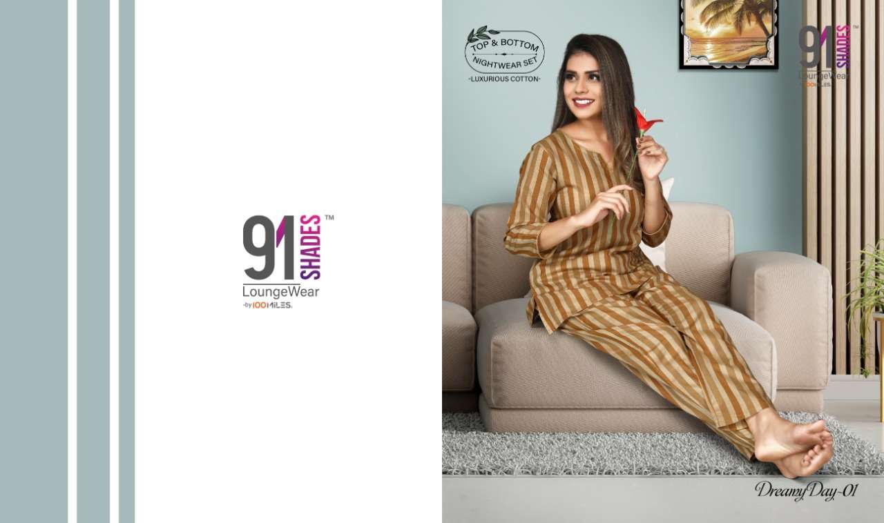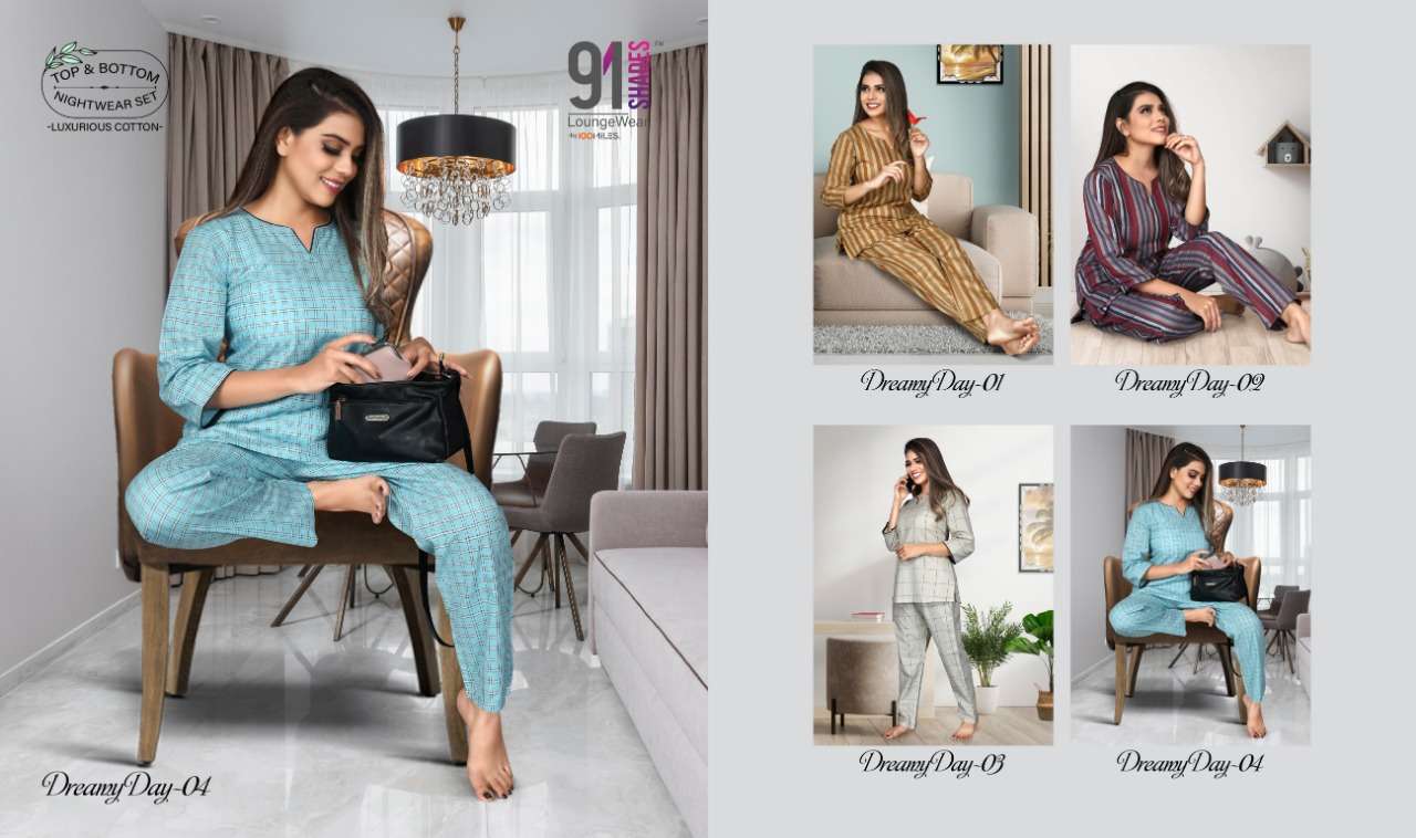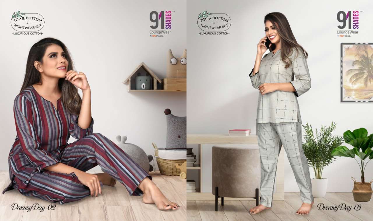 Brand -91SHADES⢠ItemType- Nightwear/Loungewear Catalog - Dreamy Day Product Desc -  *Pure Cotton Self-Weaving Dzn Top & Bottom Set * Sizes - S to XXL Pieces - 4 per bag RATE - 535/-(with bottom)  |