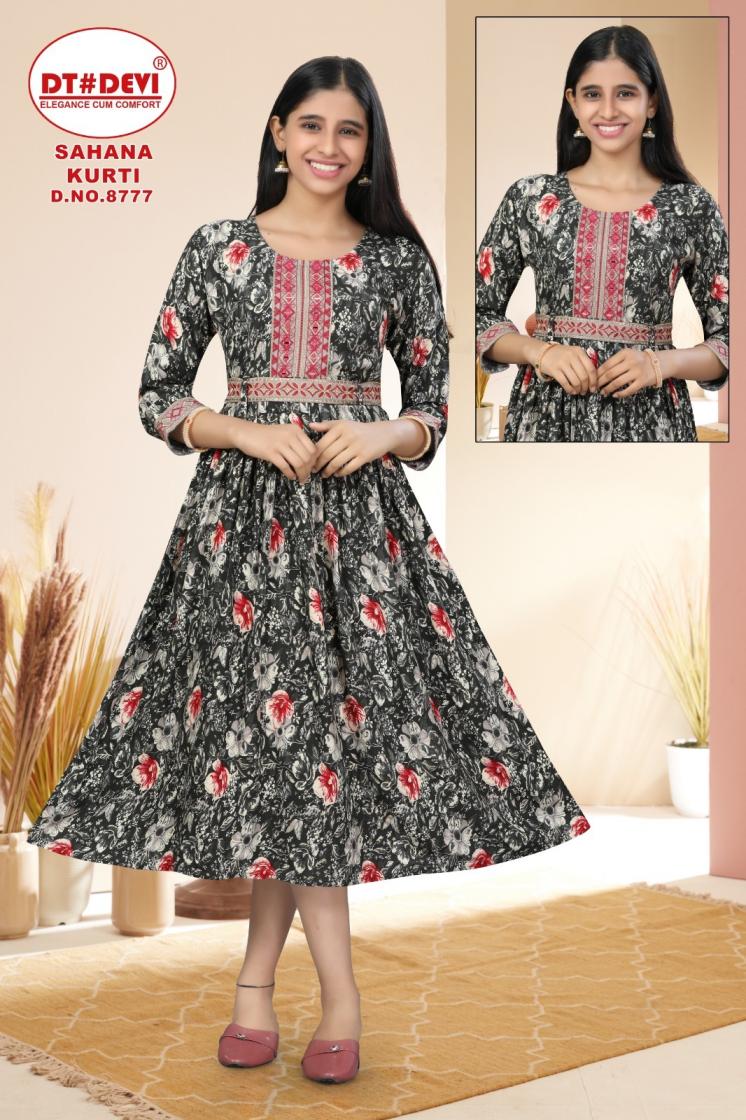 dt devi sahana kurti 8777 rayon print fully stitch classic combo set kids long frock
