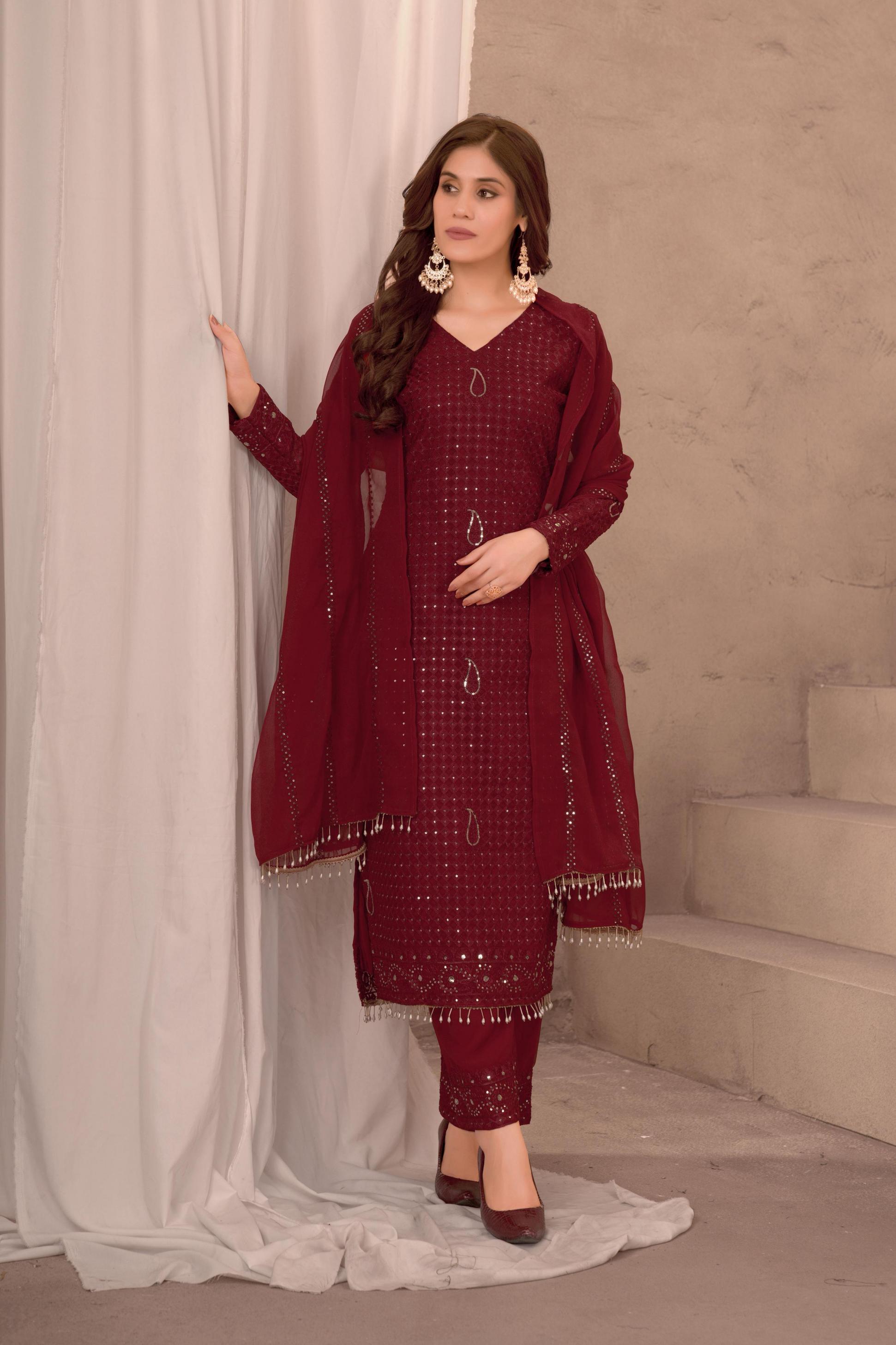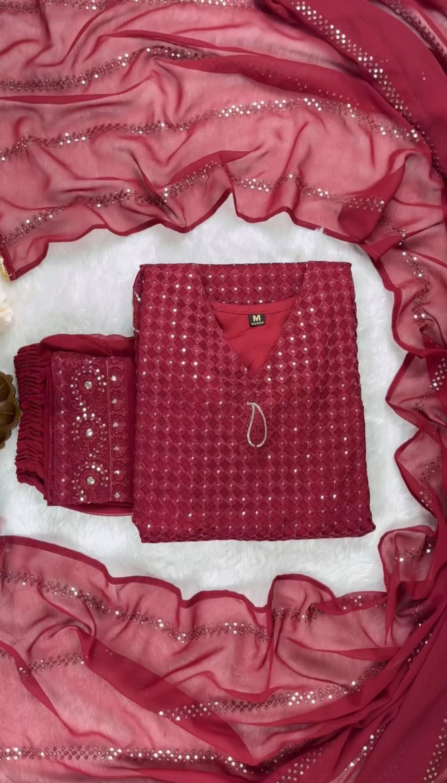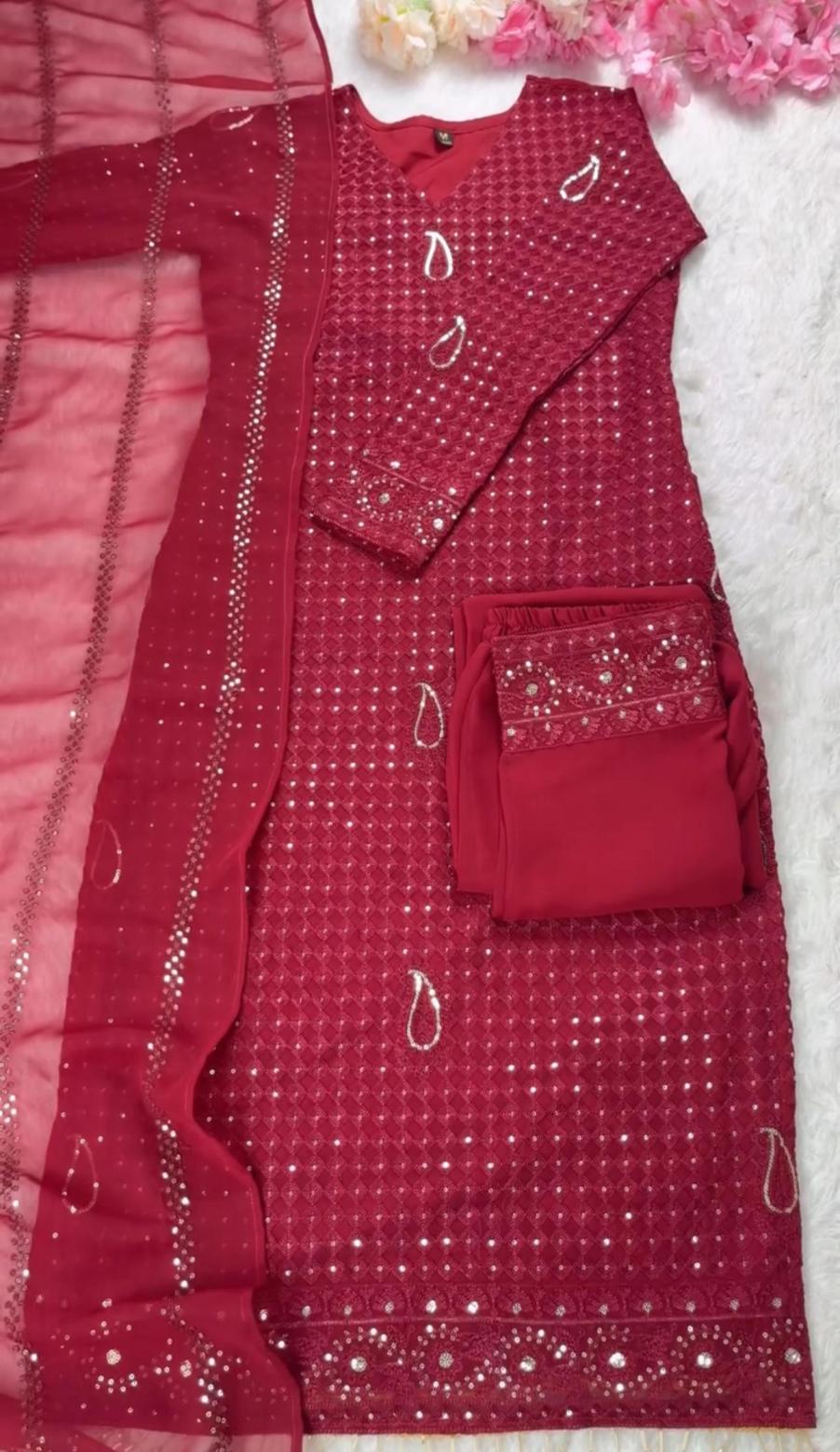 💃🏼Elegance redefined: maroon embroidery kurti with dupatta and pant ✍️DN:DVD 5056 📝FABRIC DETAILS 🧣DUPATTA:FAUX GEORGEET WITH EMBROIDERY SEQUENCE DESIGN WORK 👖BOTTOM/PANT:GEORGEET WITH EMBROIDERY FULLY STEACH WITH ELASTIC RUBBER 👘SIZE: M,L,XL,2XL ⚖️WEIGHT:1KG 💵PRICE: 1450₹ ✅DVD ORIGINAL MODEL SHOOT PRODUCT |