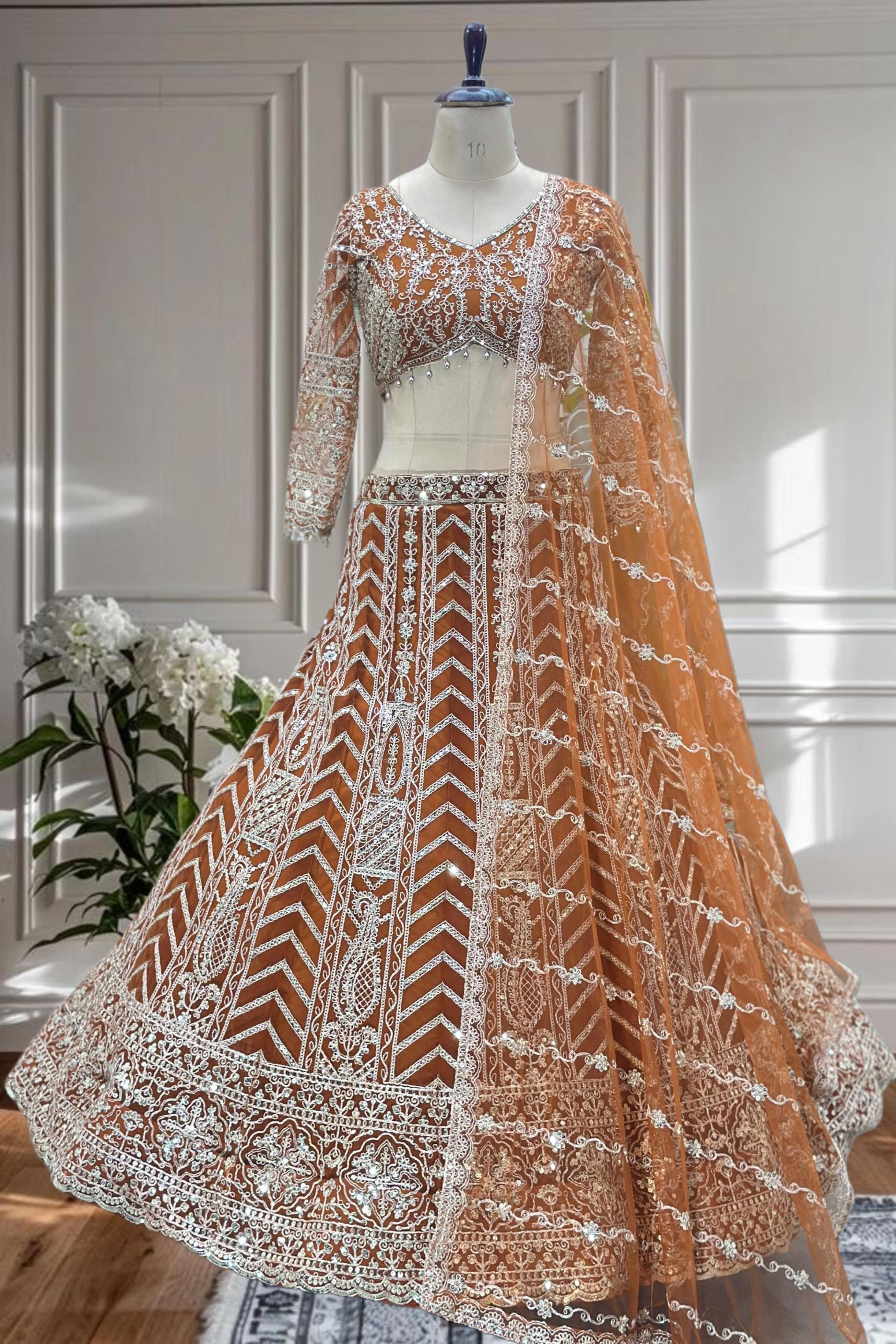 🌼designer Lehenga Choli🌼 Rust orange designer lehenga choli adorned with intricate white embroidery and sequins work. Lehenga (semi Steach) Lehenga Waist :42” Length :42” Blouse (Unstitched) Dupatta Package Contain : Lehenga, Blouse, Dupatta, With Zip Weight : 1.500Kg Rate : 1695/- |