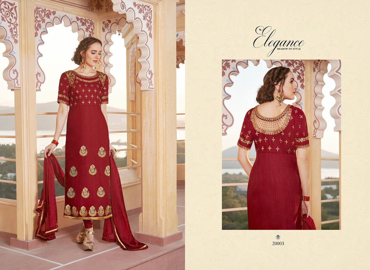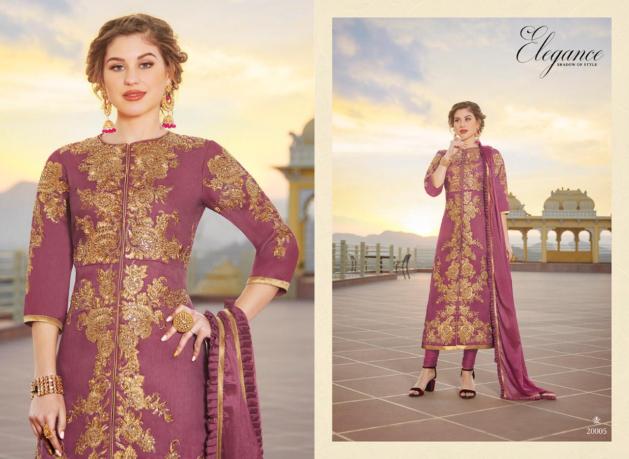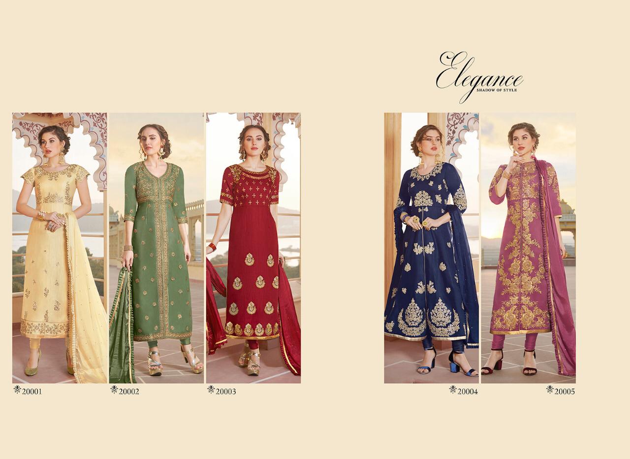 Series - 20001 to 20005 💃Cataloge Name💃 👗 Elegance👗 Shadow of style Fabric details are given below Top Fabric :- Heavy Pure chanderi Bottom :- santoon 2.50 Meter Inner :- santoon 1.60 Meter Dupatta :- Nylon Chinon with Frill Work :- Embroidery and Zarkon work Designs :- 5 pcs in one set 20001 to 20005 Stitchingtype :- Semi - Stitched Rate :- ₹ 1595 Each pcs 5%. GST EXTRA |