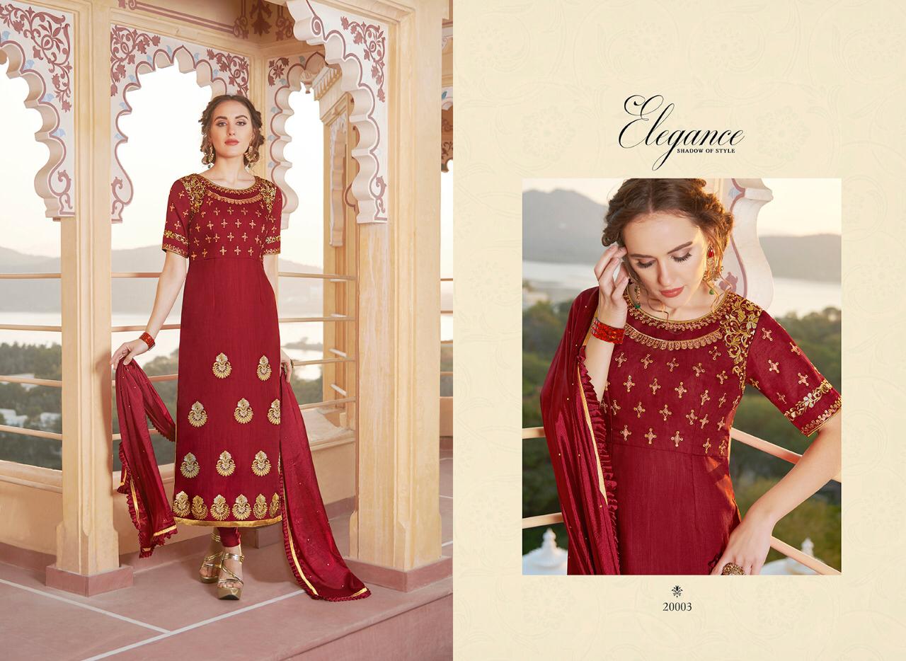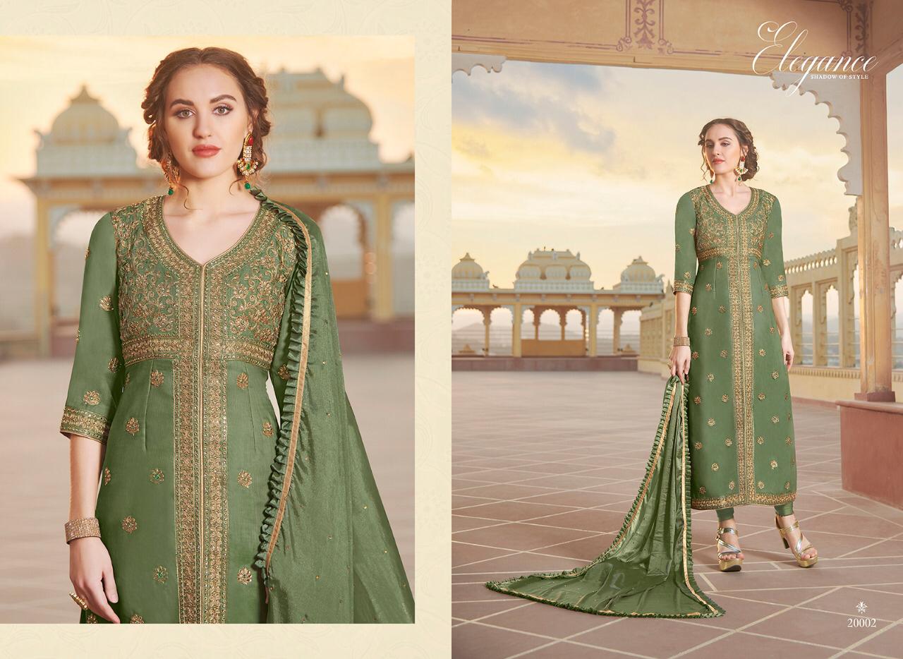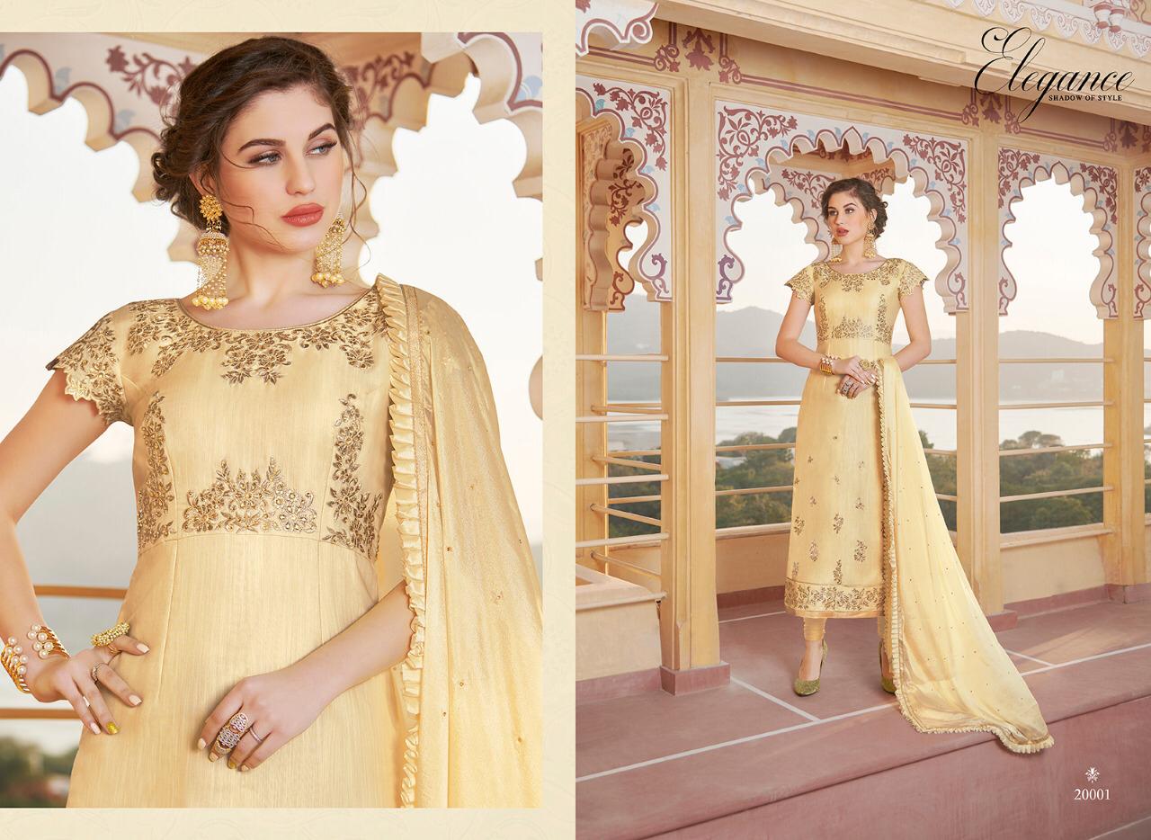 Series - 20001 to 20005 💃Cataloge Name💃 👗 Elegance👗 Shadow of style Fabric details are given below Top Fabric :- Heavy Pure chanderi Bottom :- santoon 2.50 Meter Inner :- santoon 1.60 Meter Dupatta :- Nylon Chinon with Frill Work :- Embroidery and Zarkon work Designs :- 5 pcs in one set 20001 to 20005 Stitchingtype :- Semi - Stitched Rate :- ₹ 1595 Each pcs 5%. GST EXTRA |
