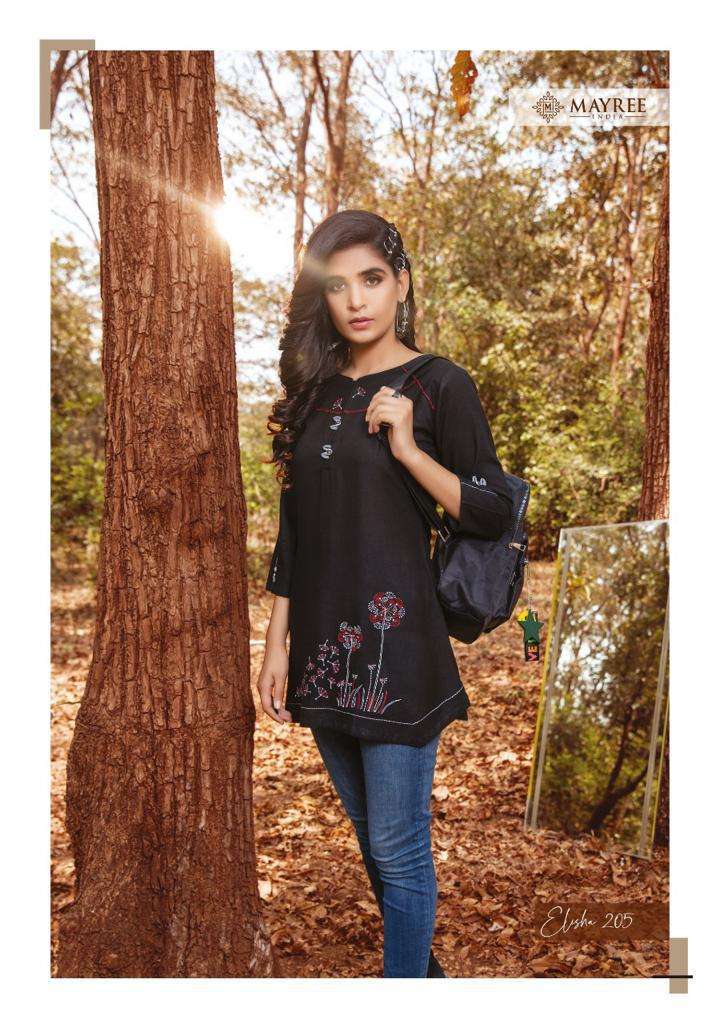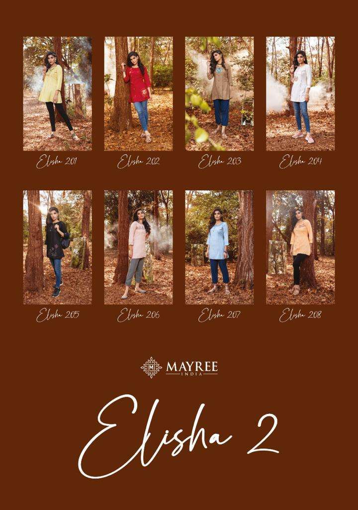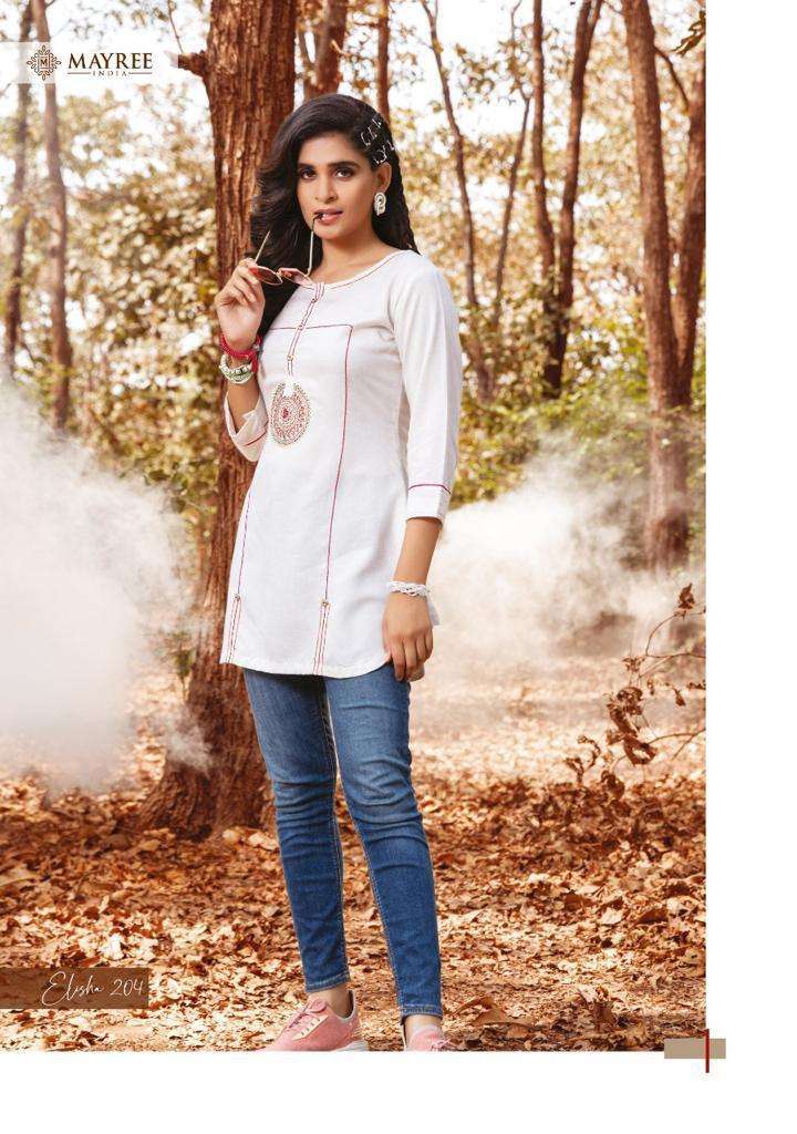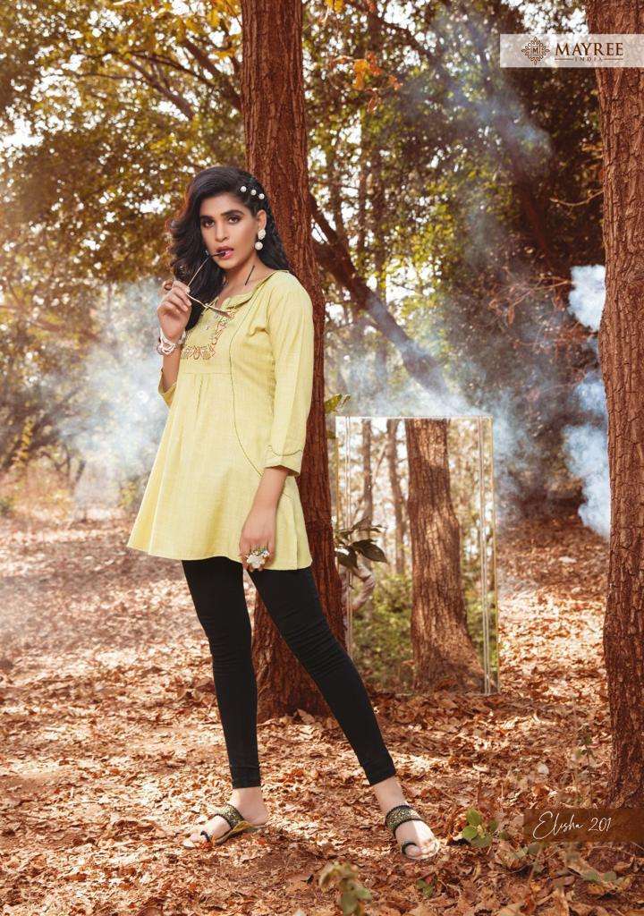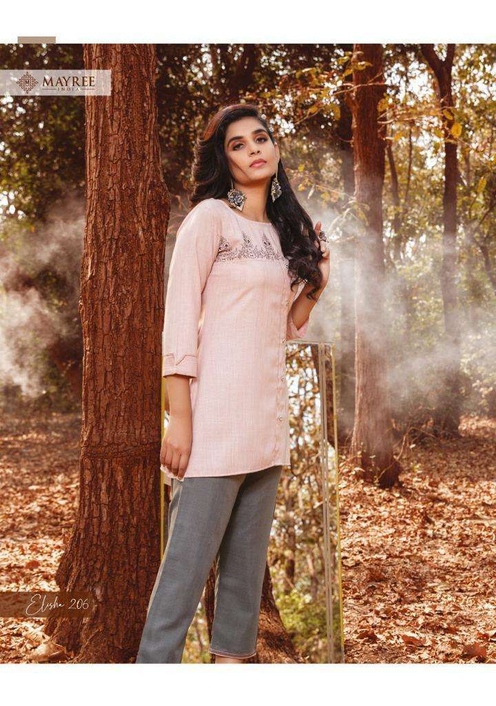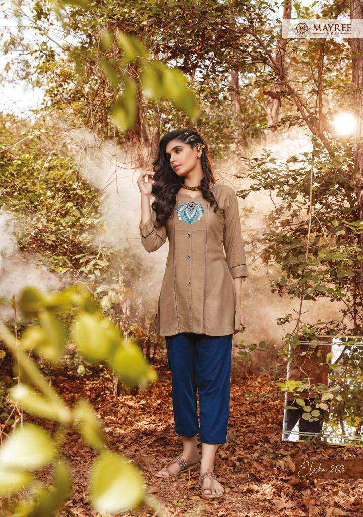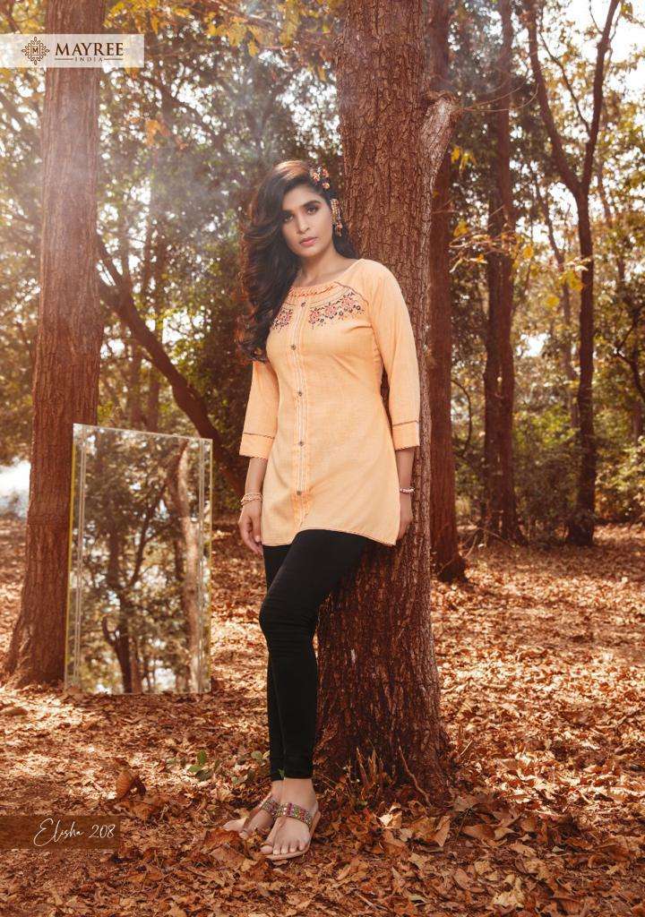 MAYREE-INDIA Catalogue Name-  New series ELISHA Vol 2     Details Fabrics :- 14 kg slub reyon liquid & flex with embroidery thread work stylish Size :- M(19) L(20) XL(21) XXL(22) *Length-30+ Designs :- 8 pcs  Rate - 425 per pcs . Set to set. GST 5 Percent Extra. |