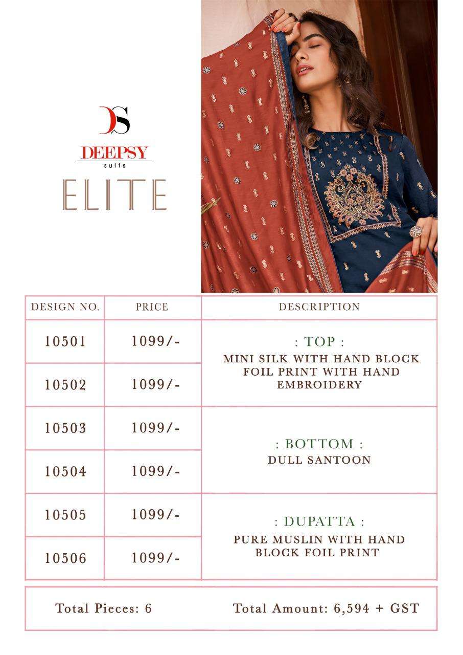 *Elite by DEEPSY SUITS Top - Mini silk with hand block foil print with hand embroidery Bot - Dull santoon Dup - Pure Muslin silk with hand block foil print *Rate - 1099+GST Quilted Fabric Used For best quality results |