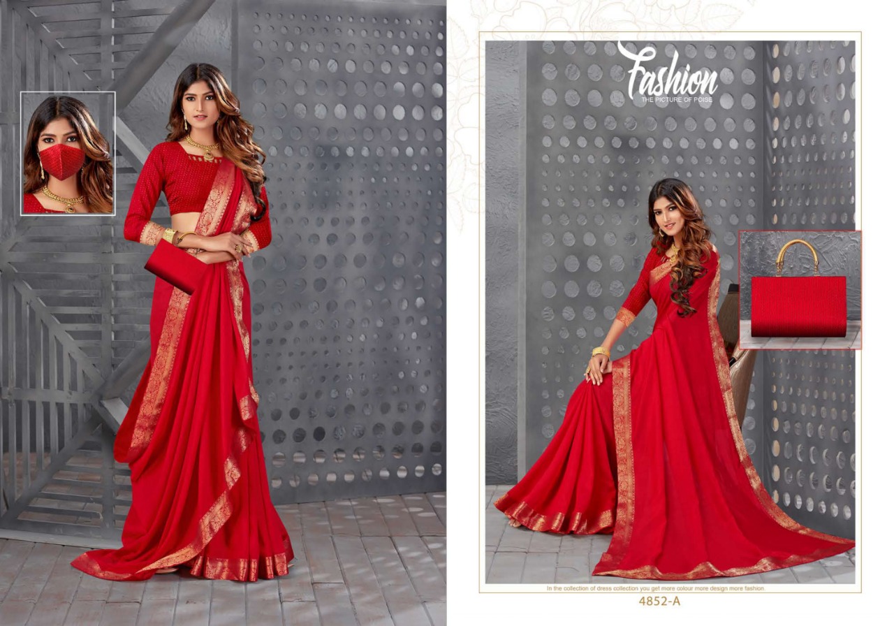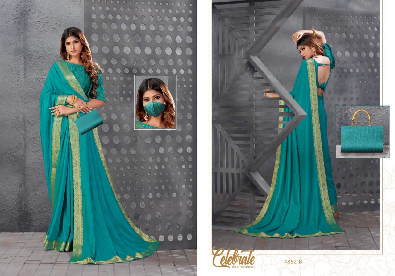 Catlog name - EMANI . Fabric- Vichitra silk Brocket Blouse Brocket purse Brocket mask. Matching mask & Matching purse Rate- 555 per Pcs . Set to set. GST 5 Percent Extra. Delivery from today |